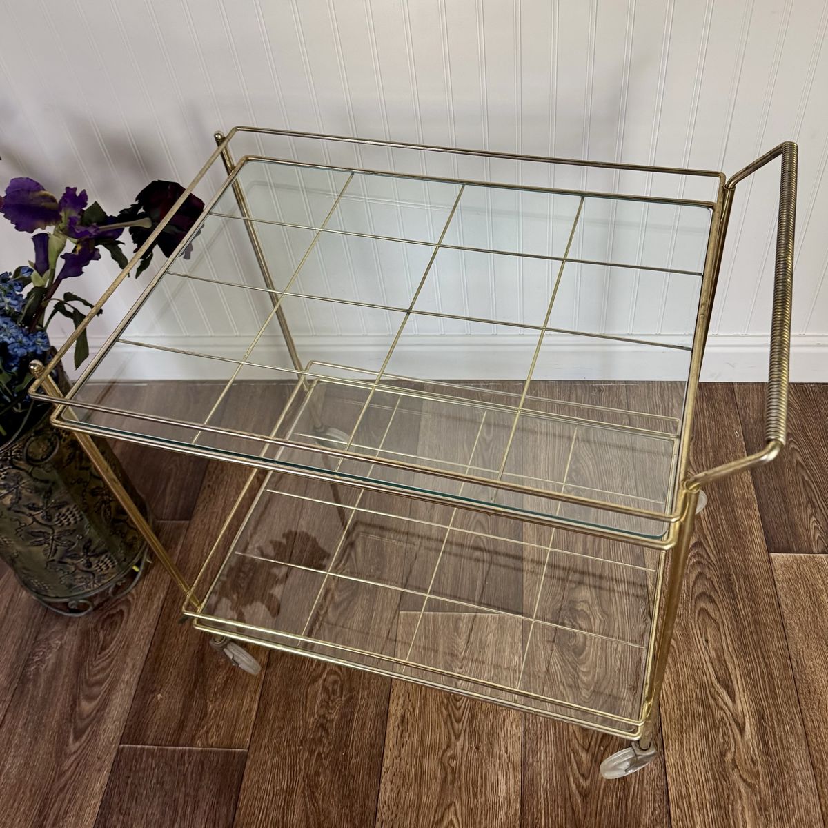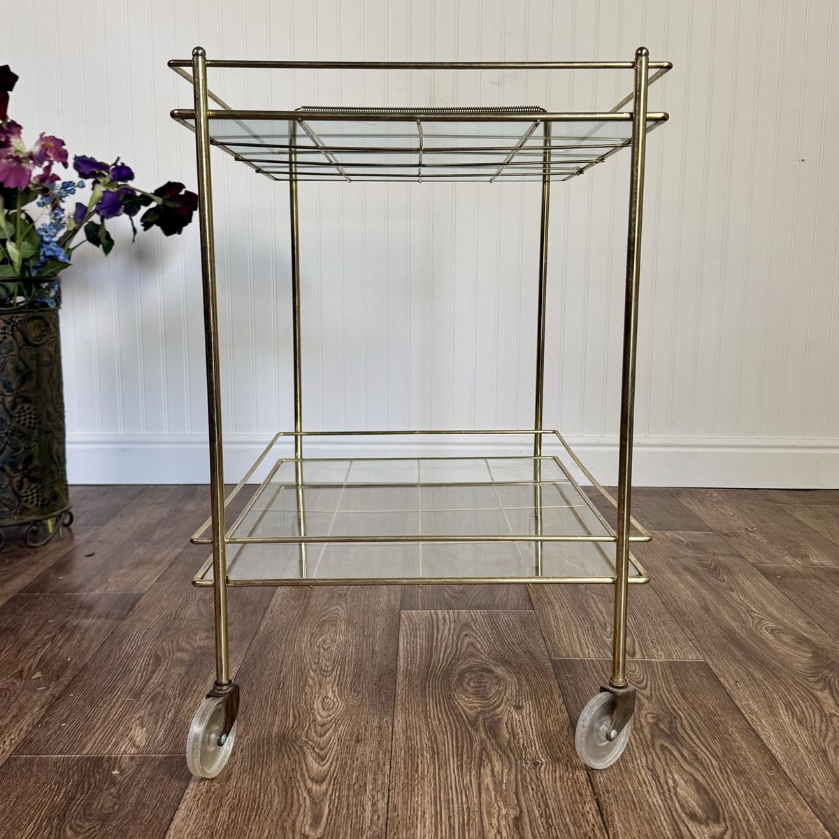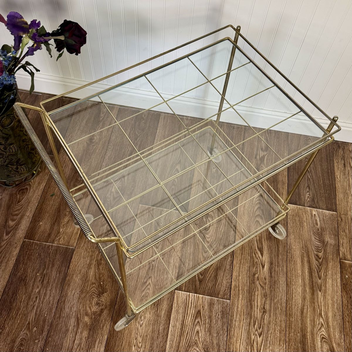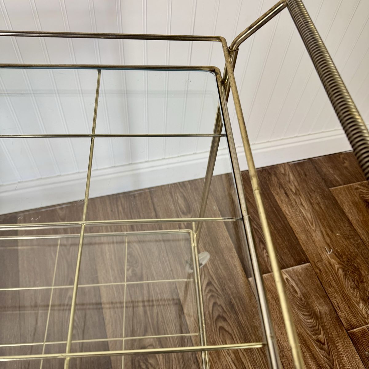 Venmo1970s Hollywood Regency brass and glass trolley / bar cart featuring a gallery rail top, wraparound handle, lower shelf for storage, and smooth-rolling wheels.