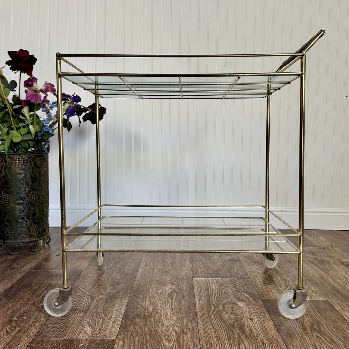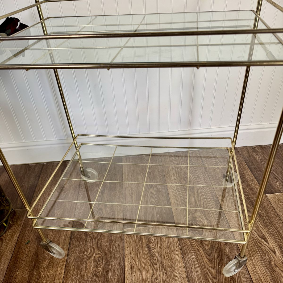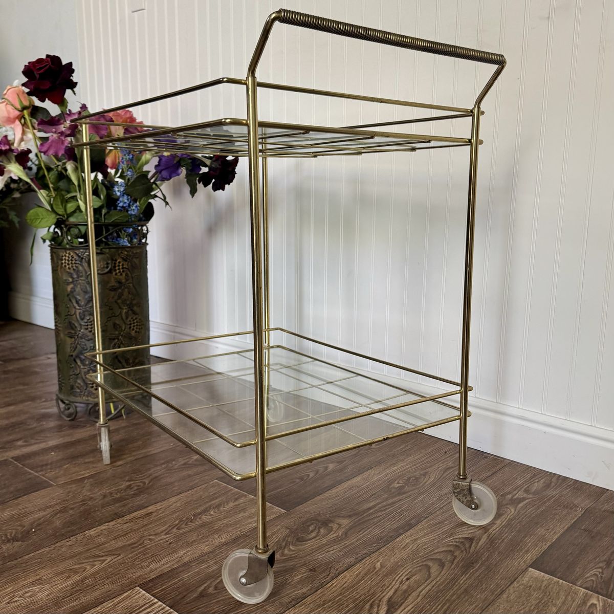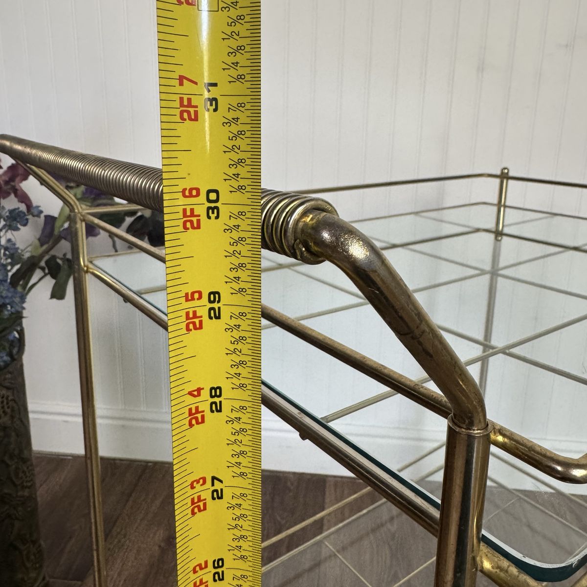Venmo1970s Hollywood Regency brass and glass trolley / bar cart featuring a gallery rail top, wraparound handle, lower shelf for storage, and smooth-rolling wheels.