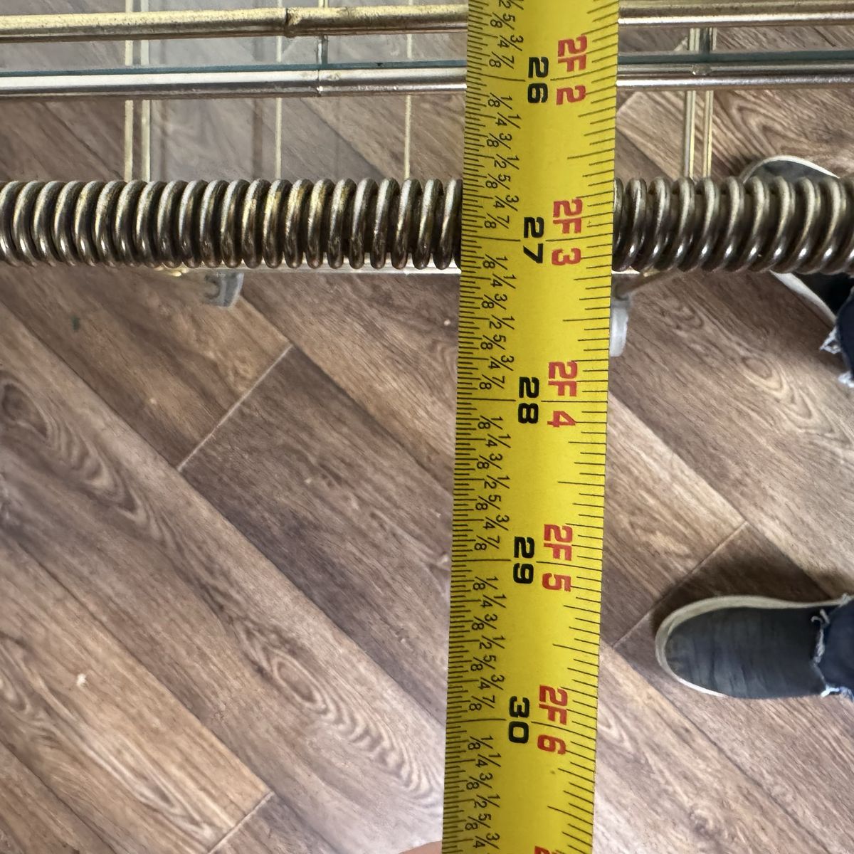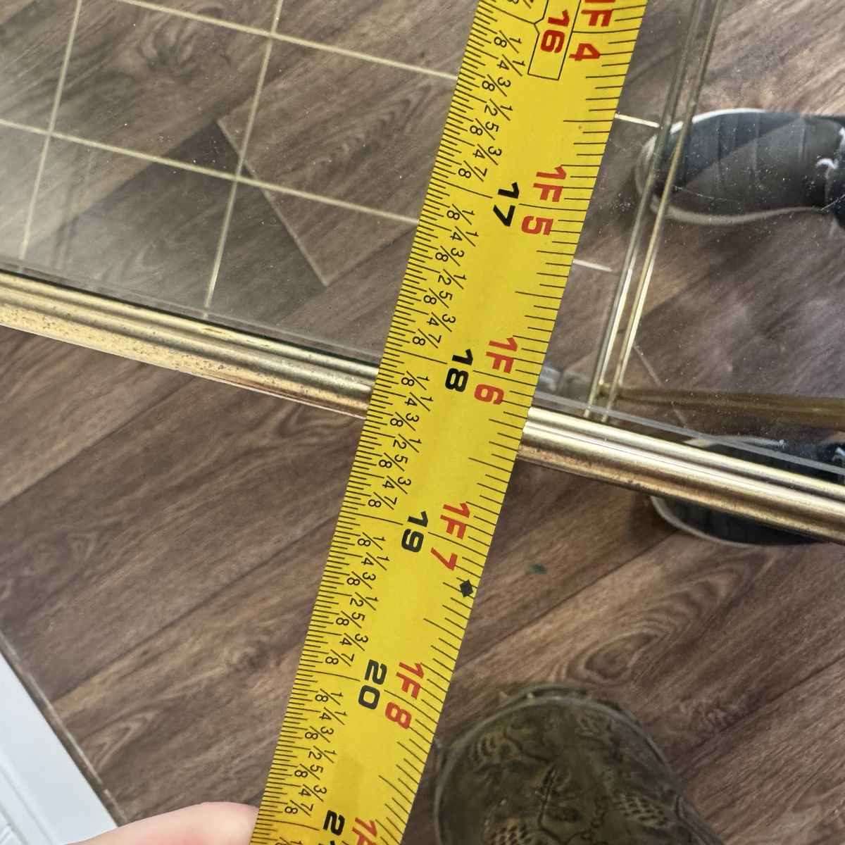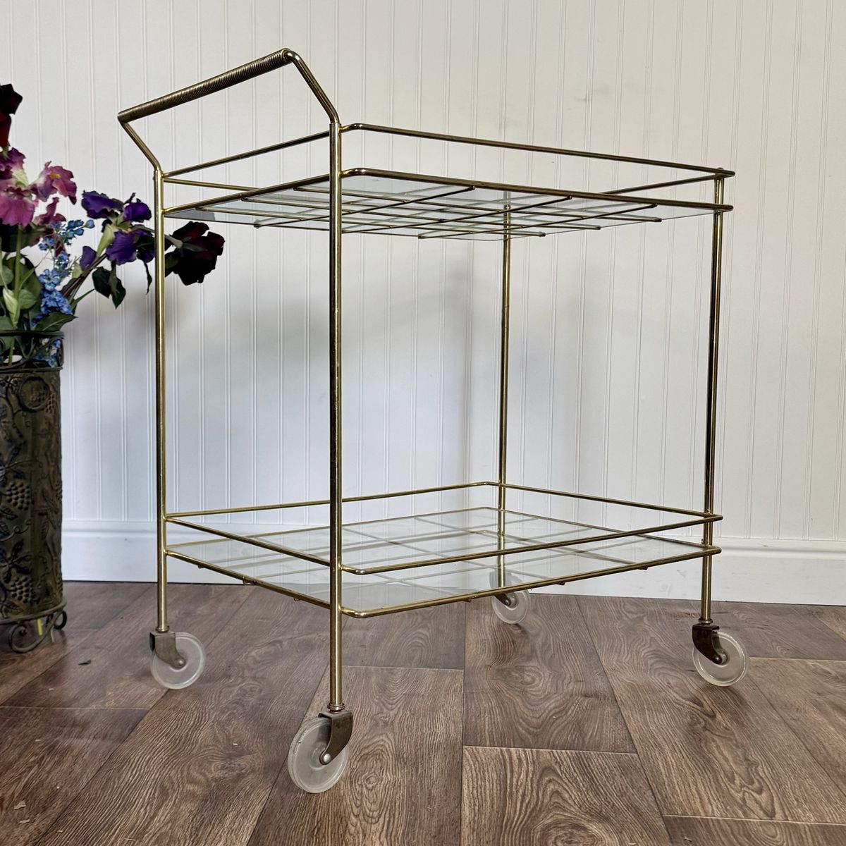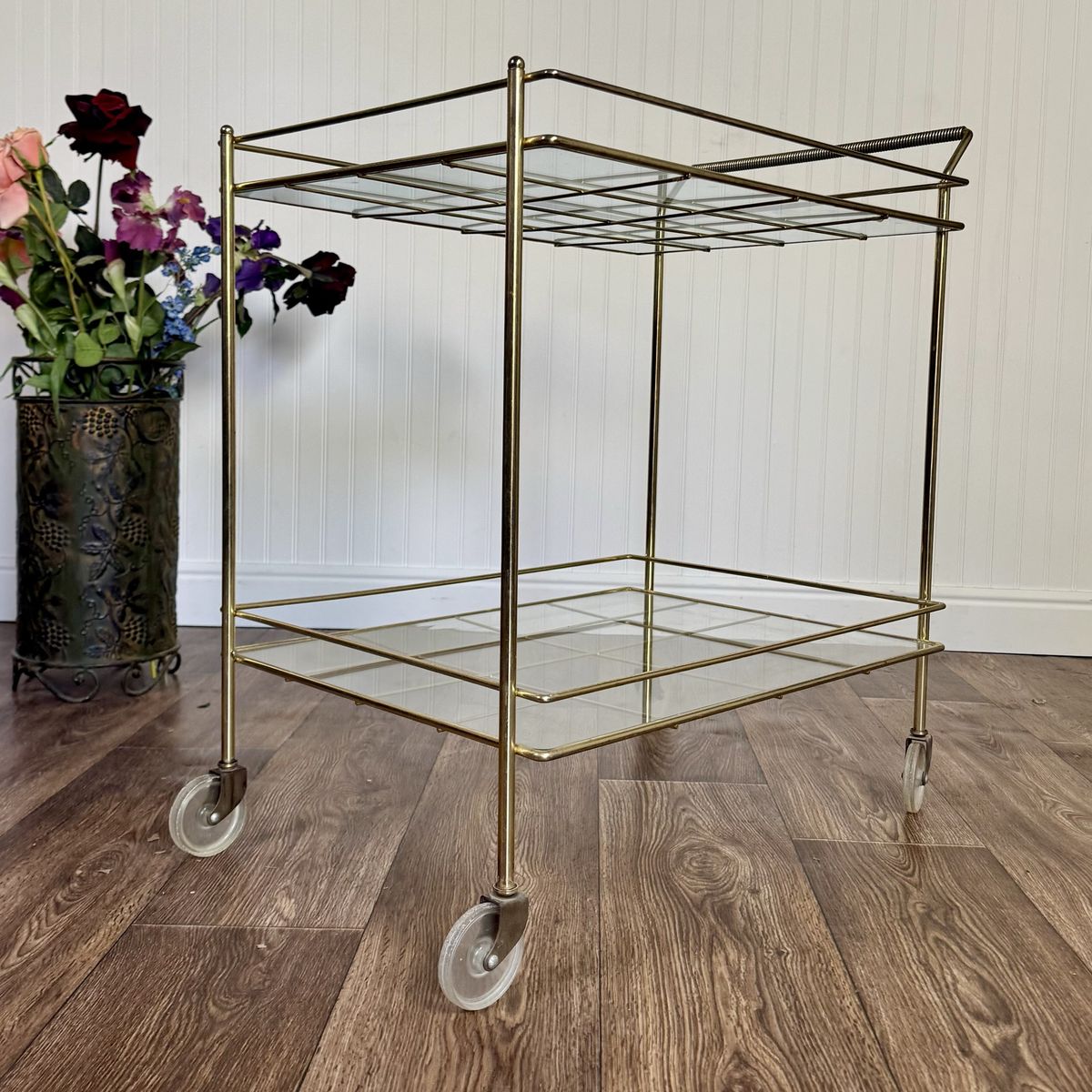 Venmo1970s Hollywood Regency brass and glass trolley / bar cart featuring a gallery rail top, wraparound handle, lower shelf for storage, and smooth-rolling wheels.