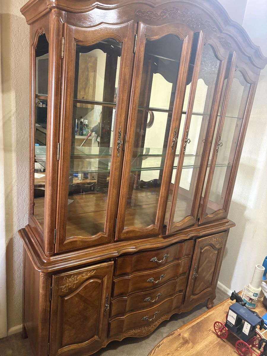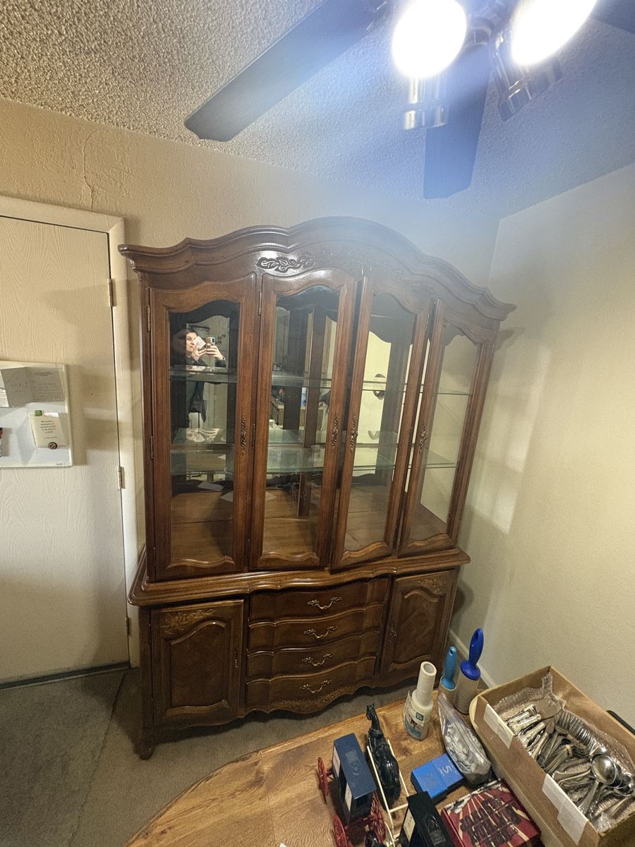 Gorgeous light up china hutch. All glass included and in good shape. Priced super low because you’ll need to come pick it up from a 3rd floor apartment and it’s solid! I’m selling this for my aunt who is moving, message me and I will get you in touch with her so you can go check it out. Located in West Valley, about 4000 w and 3500 s- sorry I can’t update the city on the listing! 56” wide, 18” deep