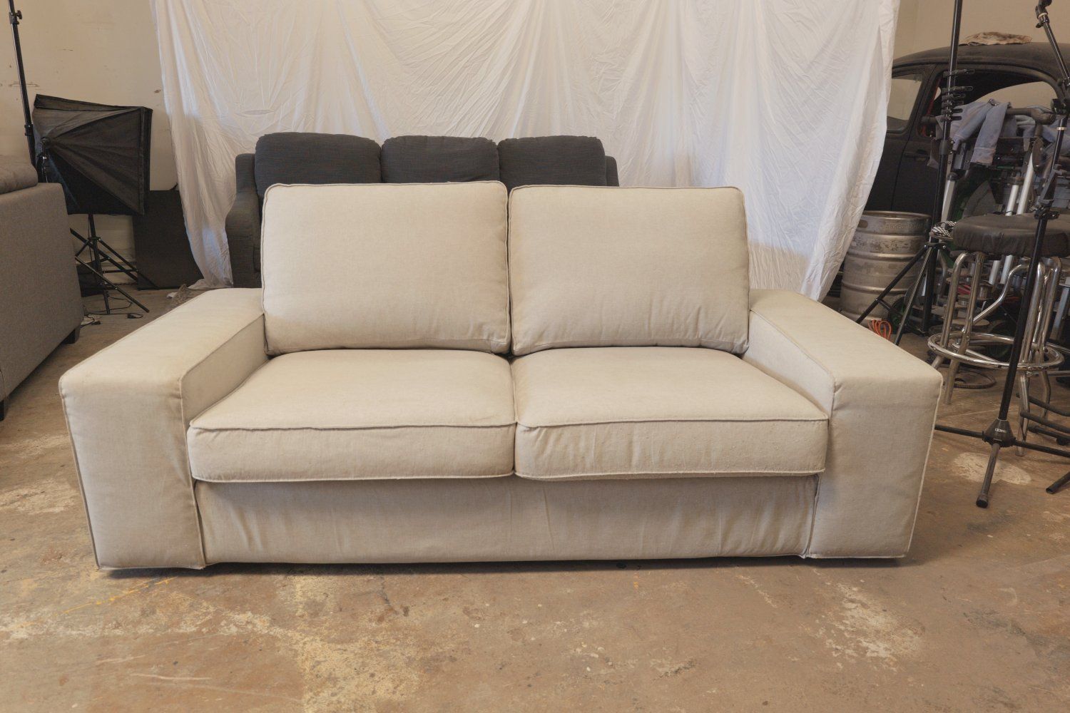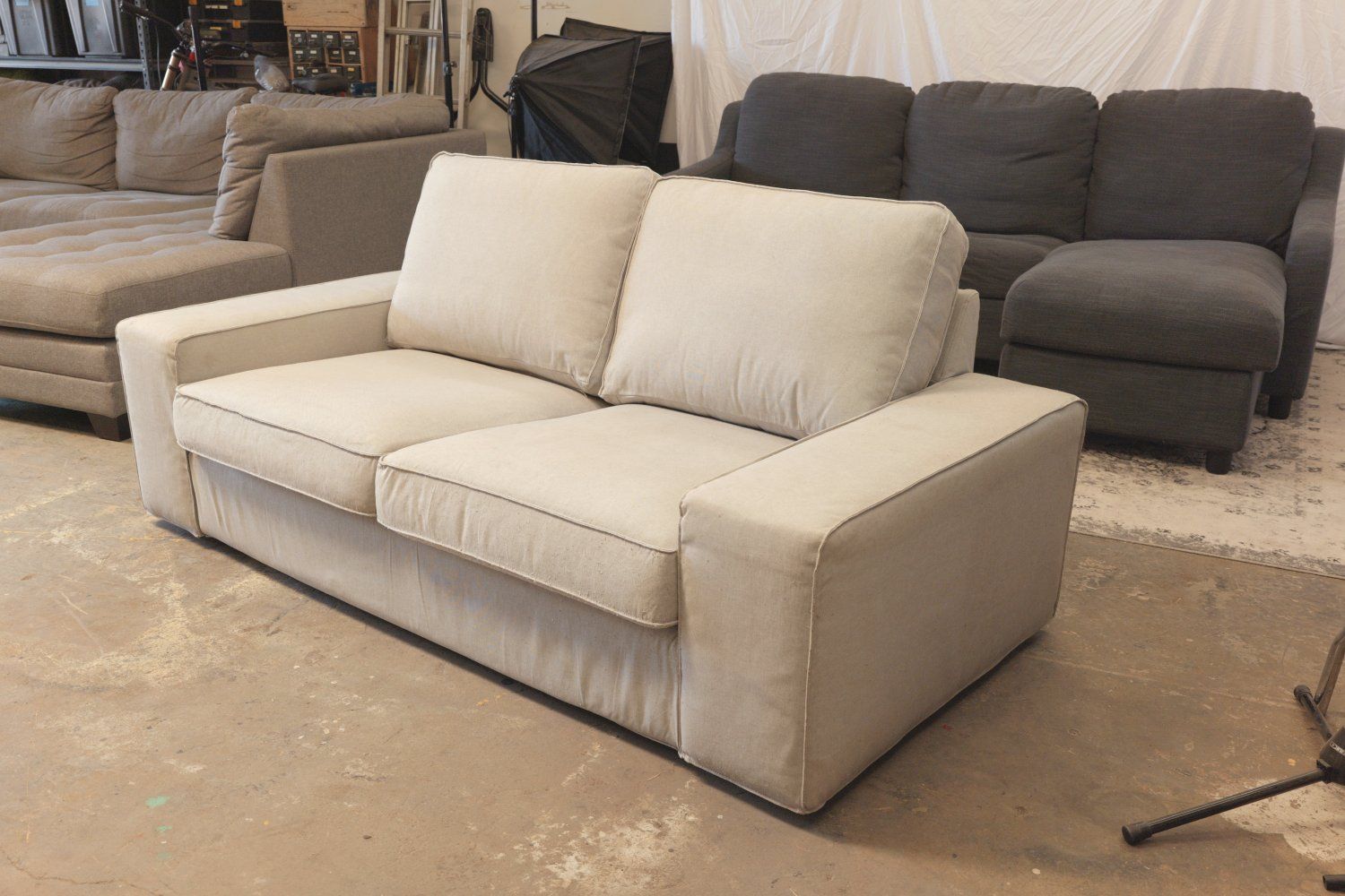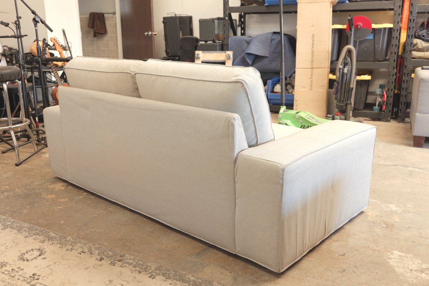 This is a sleek, mid-century modern style love seat/sofa in a clean light grey/oatmeal performance-weave fabric. This piece is in excellent condition and would fit perfectly in a smaller apartment, studio, office, or den. It has comfortable, plump cushions and a durable, blocky profile. A few blemishes here and there but overall beautiful.