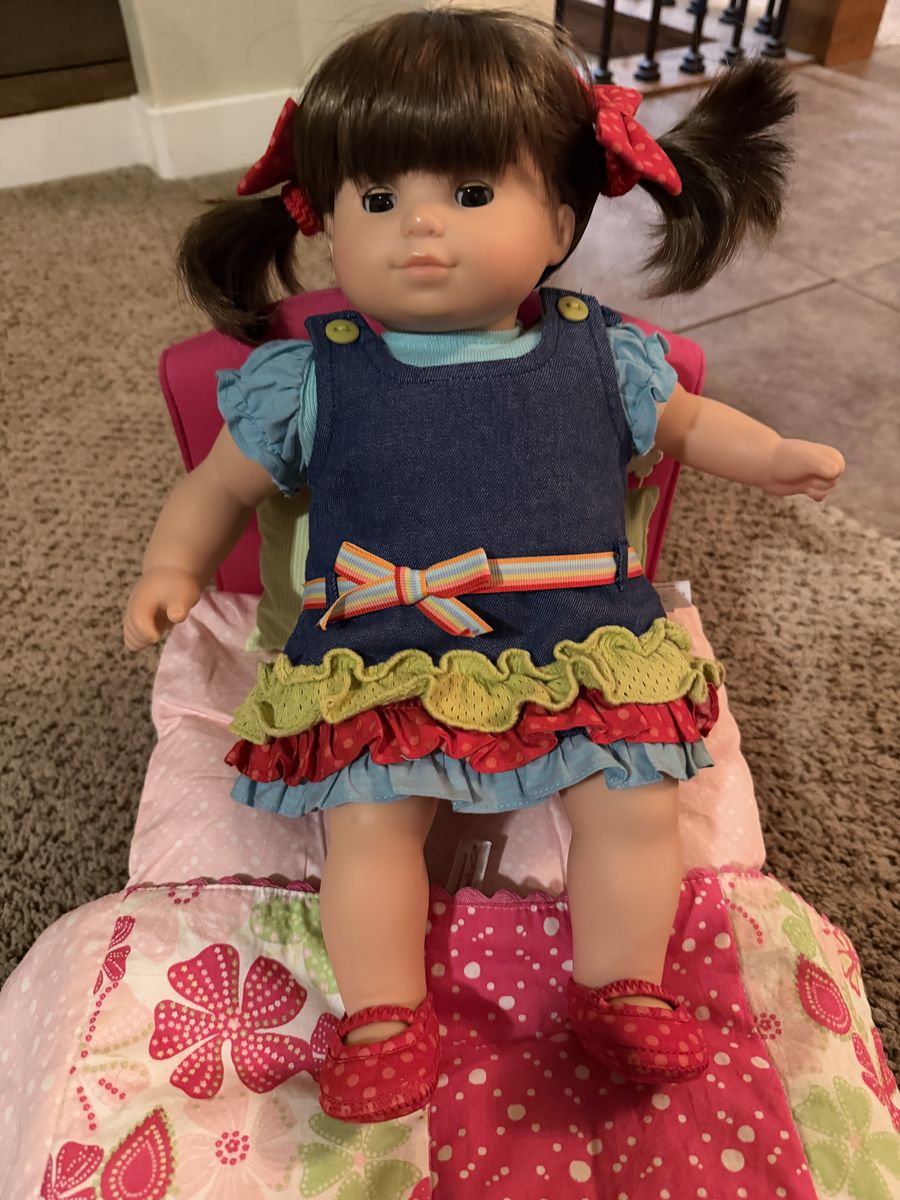 VenmoThis genuine American Girl Bitty Twin Brown Hair Girl features a soft cloth body, eyes that open and close, and hair that can be brushed or styled. The 15" doll comes with 7 complete outfits and a bed with all the pillows and bedding. She has been played with but she is in great shape and so are the extra clothes and bed.