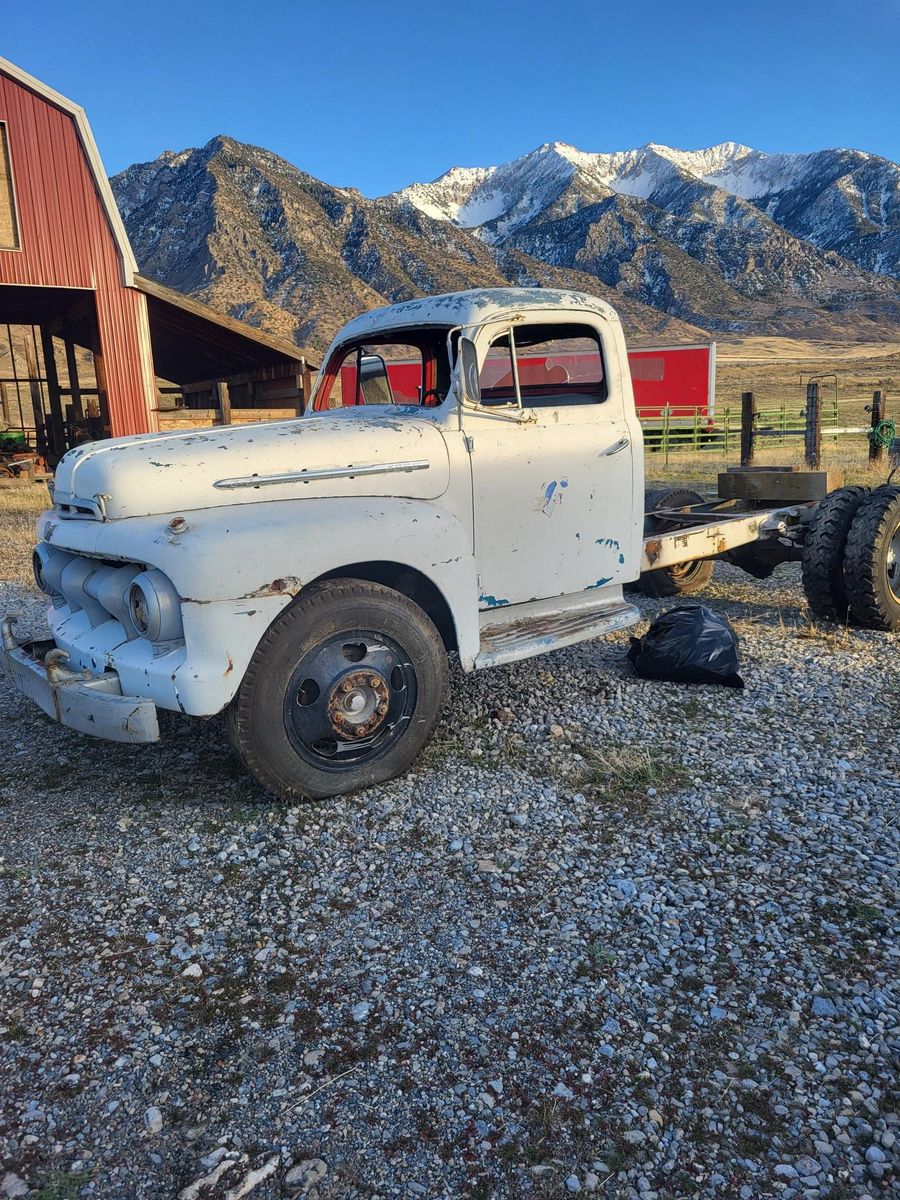 1951 Ford F5 1 1/2 ton cab and chassic. Truck was driven in storage in late 90s. Engine is V8 and does turn over and transmission is 4 speed. If interested contact Paul 801 641-5774