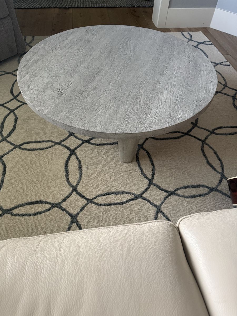 VenmoThis coffee table is 40” in diameter and 14” tall standing on three sturdy legs. It is made of a wood composite and is in like new condition.