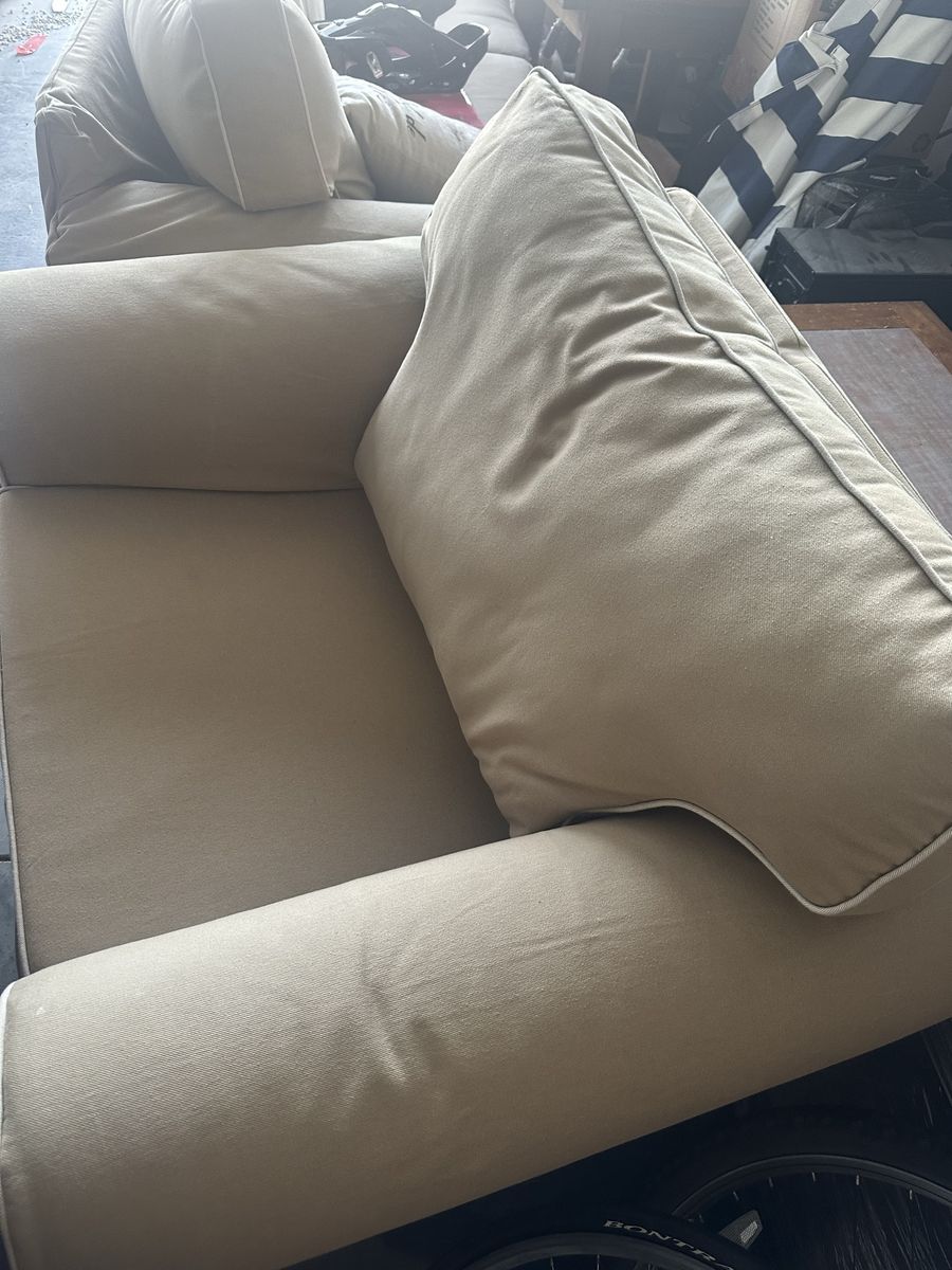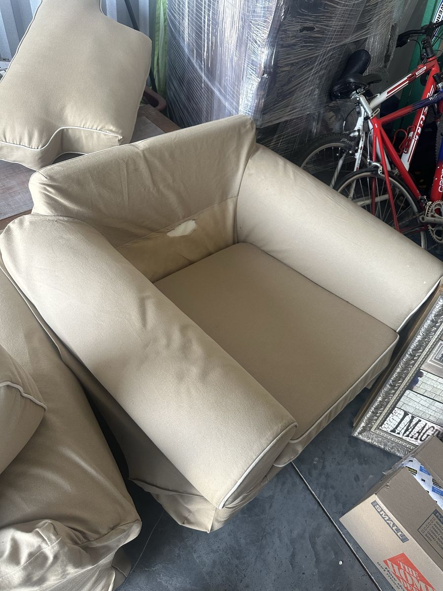 Some staining on the left arm. There is a tear on the back of the chair, but it is covered by the cushion. Please see pictures for details. Sold as is. No returns.