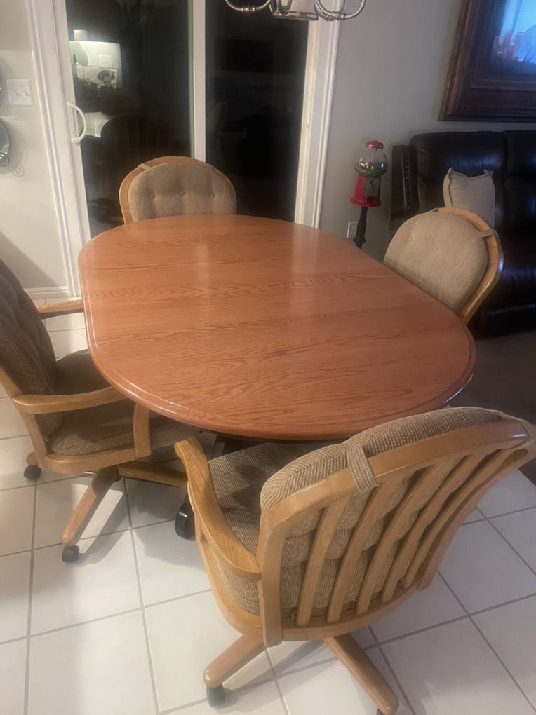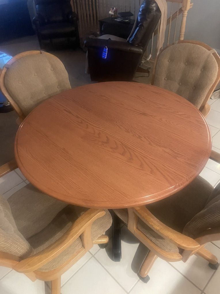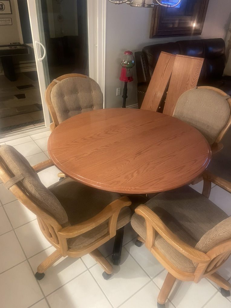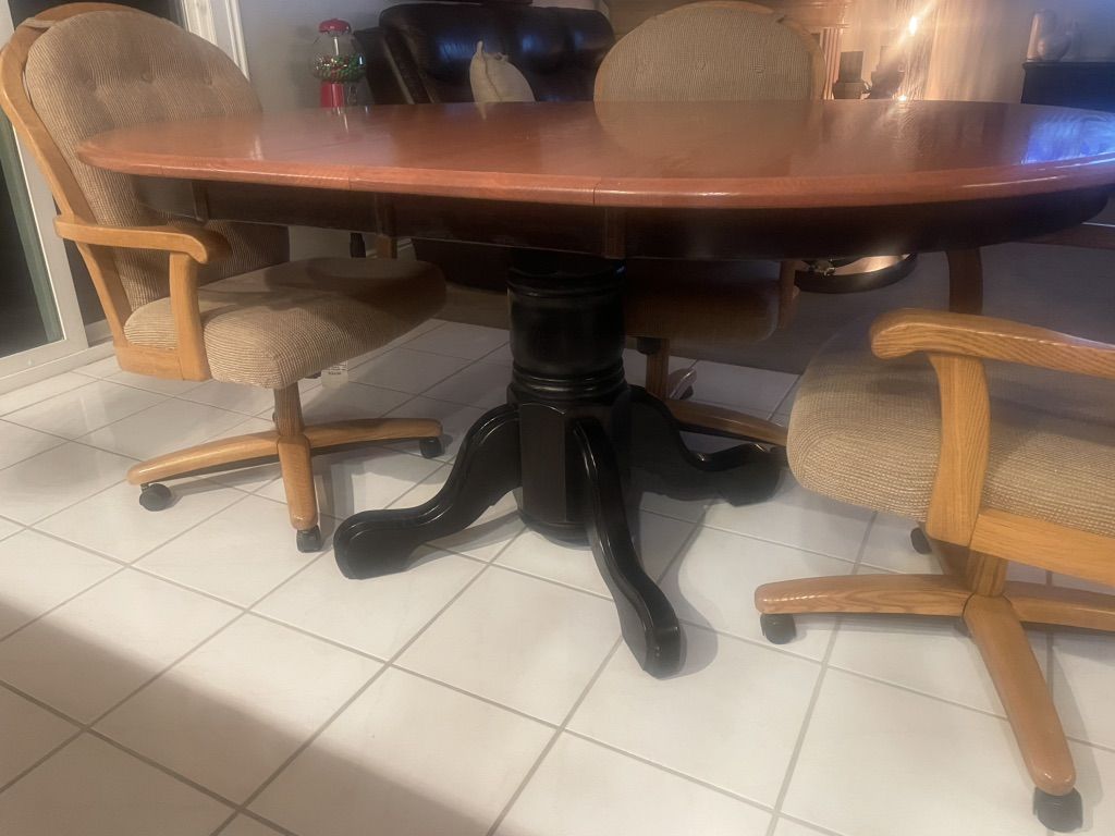 42” round custom dining table with two 12” leaves. 4 rolling chairs included. $900 OBO