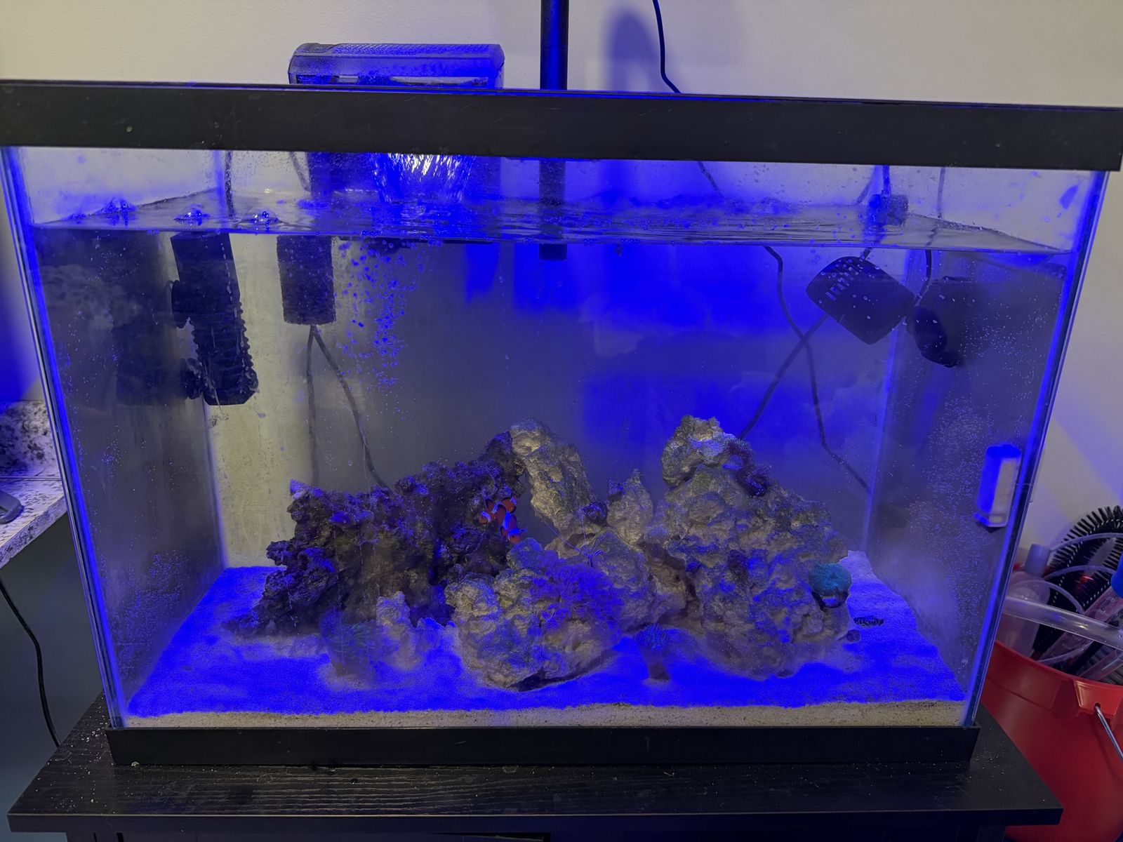 VenmoI have a 20 gallon tall fish tank. Salt water. I’m selling the whole setup besides the stand. We are just moving and cannot take it with us. The tank has 2 clownfish. 2 Dalmatian Molly. 1 cleaner shrimp. And 1 watchman goby paired with a pistol shrimp. I have a decent cleanup crew of hermits and snails. There is also a Xenthia. Zoa plug. Duncan plug. And hammer tip plug. This comes with a fluval filter. Heater. And power head. Only thing not included is the light. It will come with a bucket for water changes. Two 5 gallon buckets for mixing salt water or purchasing. I will include some food, pellets and frozen shrimp. Please reach out with any questions. I will listen to any offer because of the need to get it out soon as possible.