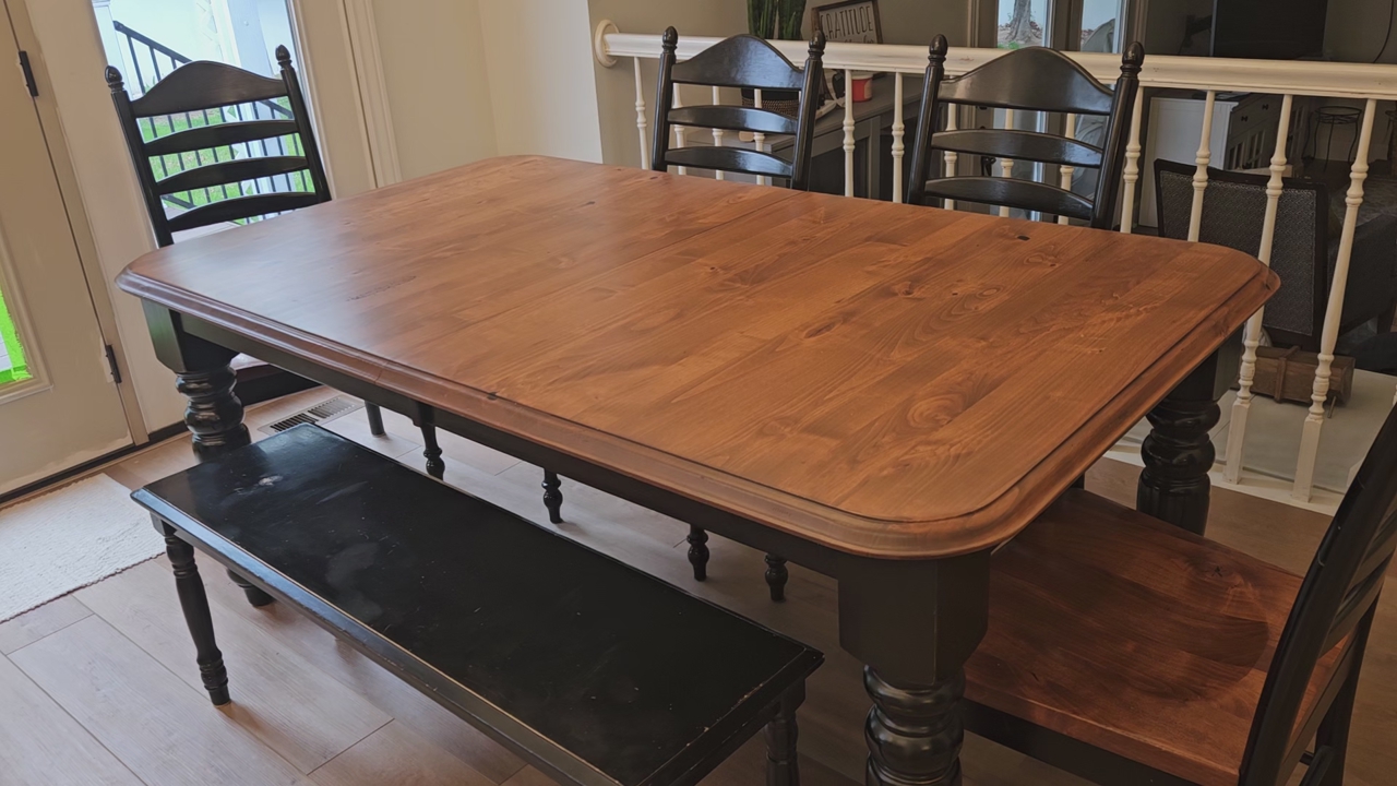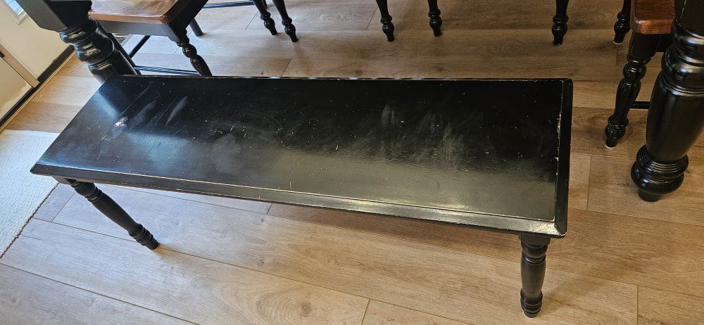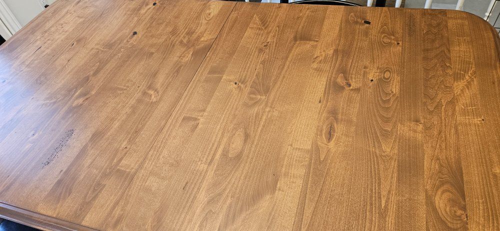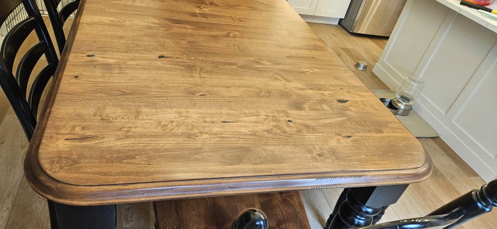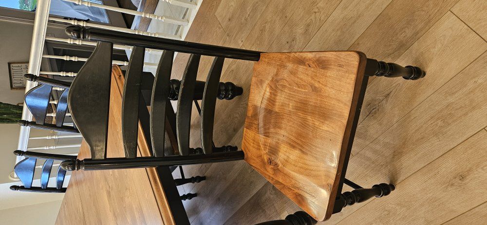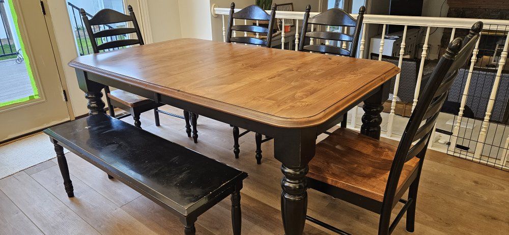 VenmoThis beautiful solid wood dining table with 4 chairs and a bench is ready for your home. Table top is in excellent condition with beautiful finish. Comes with one extension which stores under the table. Classic farmhouse style will compliment any home. 4 high back chairs and one bench. Ready for pick up in Sandy. Table without leaf is 71 inches x 41 inches. Bench is 48 inches and accommodates up to 3 people.