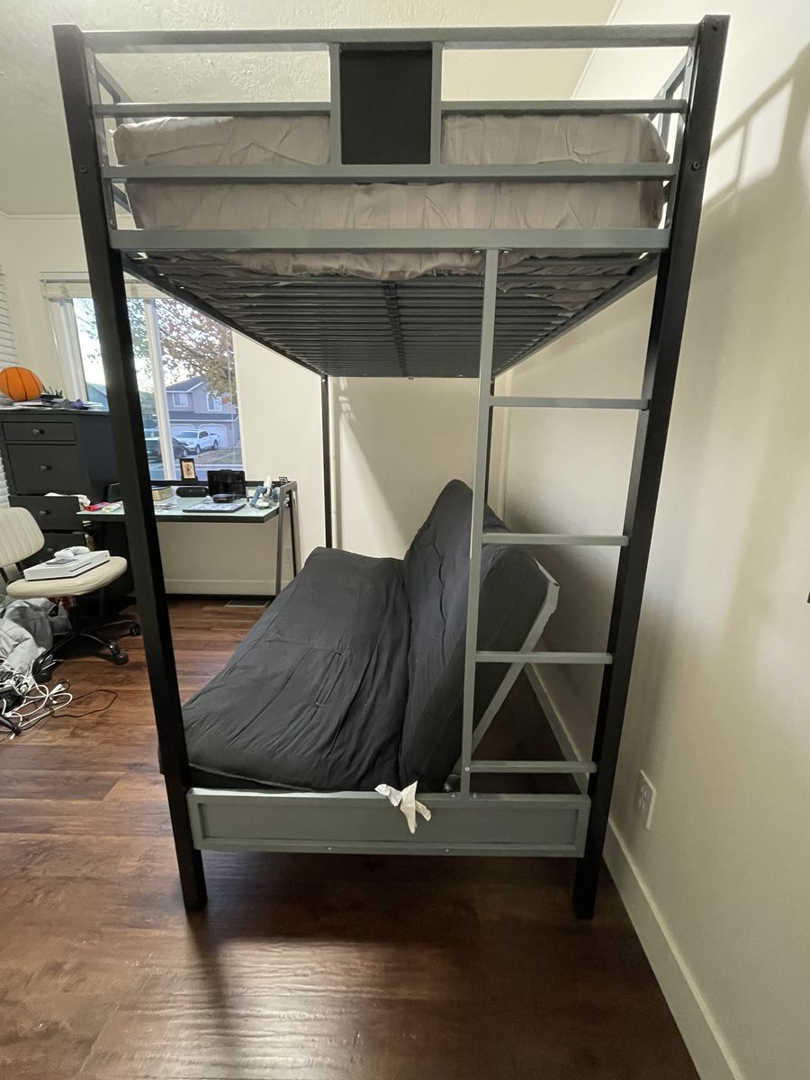 VenmoFuton mattress included, twin mattress is not. Metal frame. Lower portion easily converts from sofa to full size bed.
