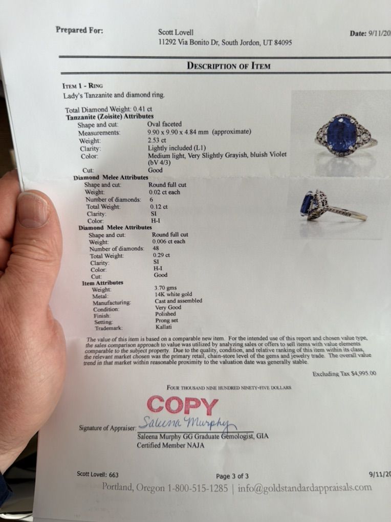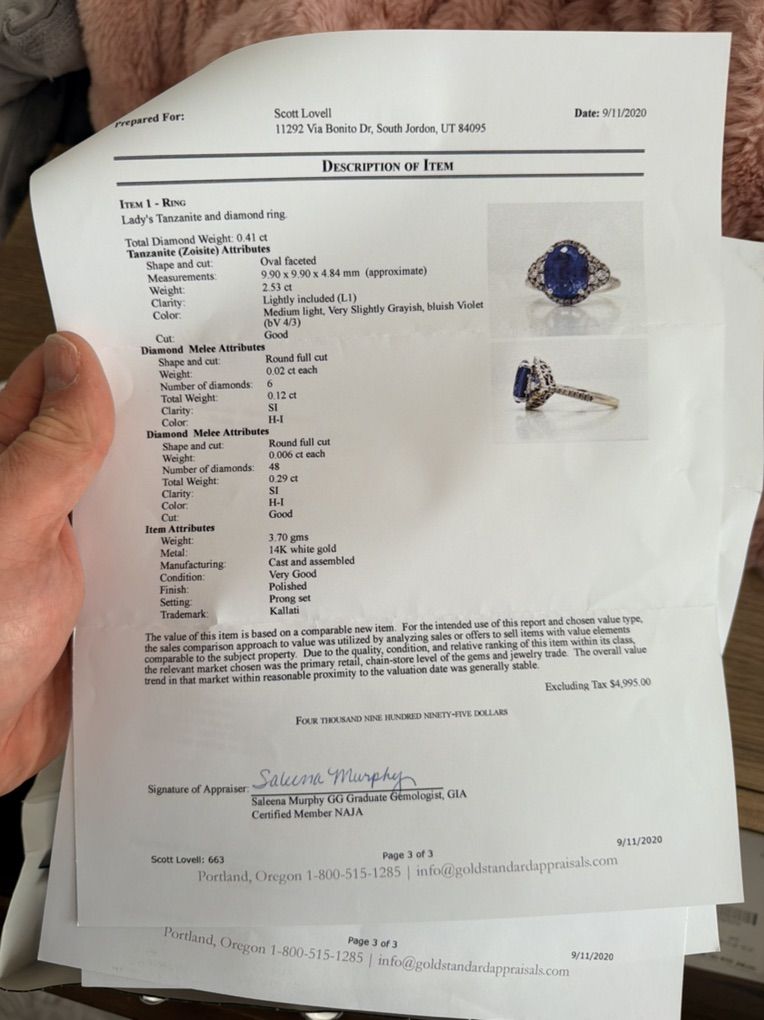 ITEM 1 - RING Lady's Tanzanite and diamond ring. Total Diamond Weight: 0.41 ct Tanzanite (Zoisite) Attributes Shape and cut: Oval faceted Measurements: 9.90 x 9.90 x 4.84 mm (approximate) Weight: 2.53 ct Clarity: Lightly included (LI) Color: Medium light, Very Slightly Grayish, bluish Violet (bV 4/3) Cut: good