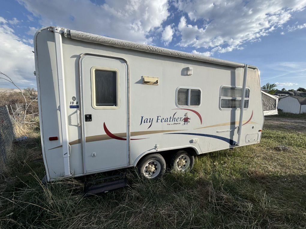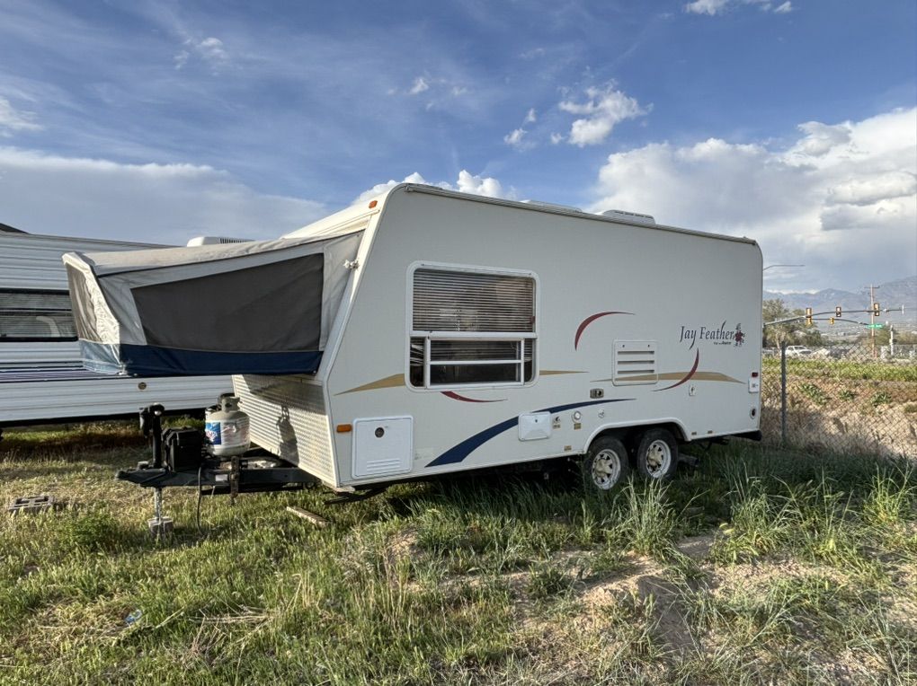 ZelleSelling 2007 Jayco J feather is fully self contained only 19 foot sleeps up to eight comfortably in good condition inside and out has newer tires and batteries air conditioner, heater, microwave, stove, top oven, refrigerator, and freezer water pump water heater all work as they sofa and dinette turn into beds front queen, bed folds down rear full size bed folds down, beautiful hybrid, easy to use and very easy to tow what any half ton pick up smaller pick ups and smaller SUVs asking 4200. If interested please call or text at any time thank you and God bless please serious buyers only no scams no tire kickers no codes no trades thank you.