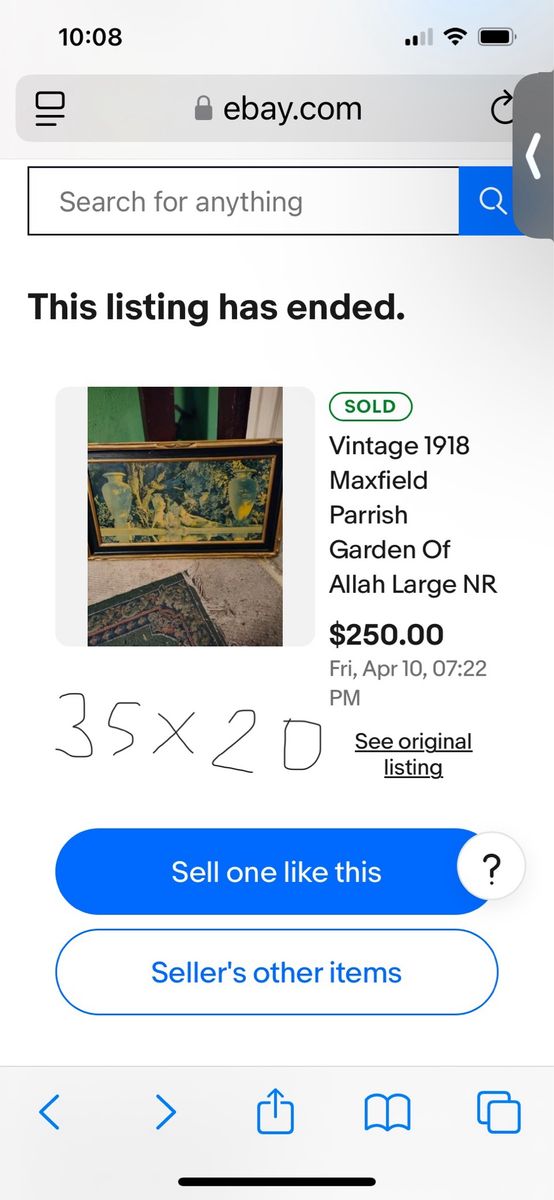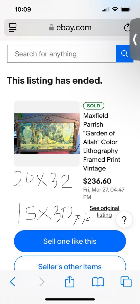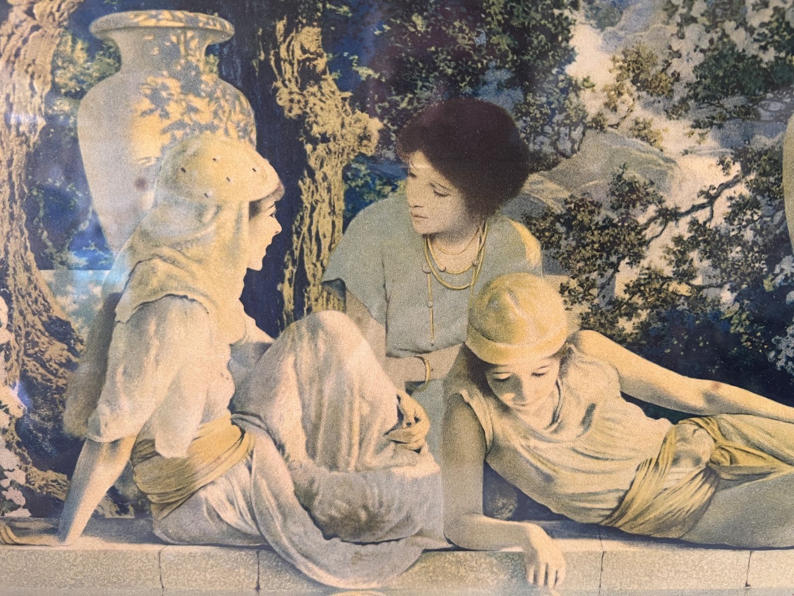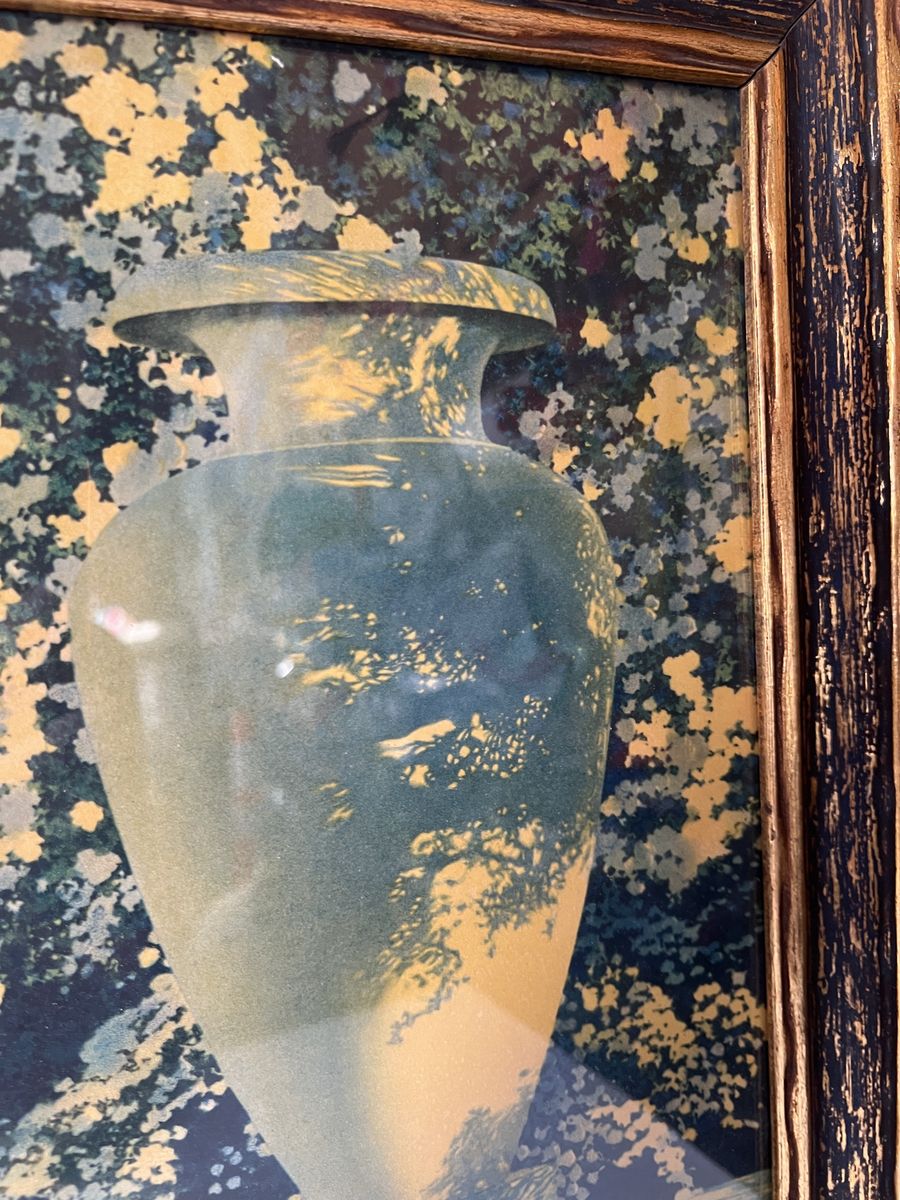 VenmoThis item is a framed vintage print of "The Garden of Allah" by the renowned American painter and illustrator Maxfield Parrish (1870-1966). He is known for his luminous, dreamlike scenes and distinctive blue hues. "The Garden of Allah," originally created around 1918, featuring women reclining by a reflecting pool. This is a color lithograph print in its original frame. With frame it measures 18.5x33.5. Pick up in Draper. Pet and smoke free home. Cash or Venmo.