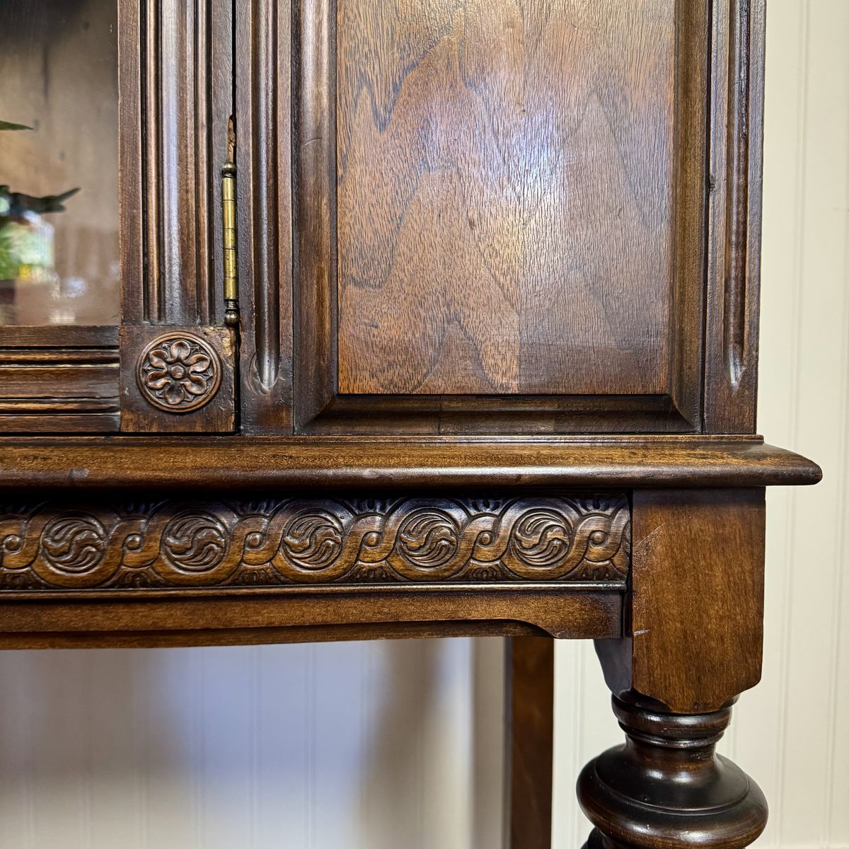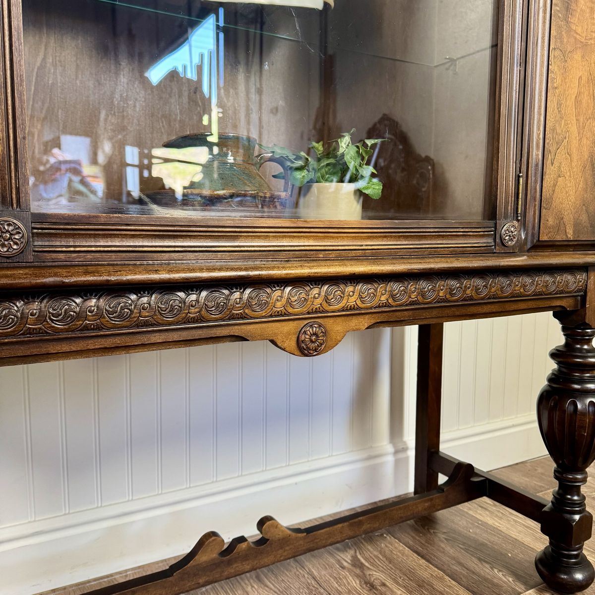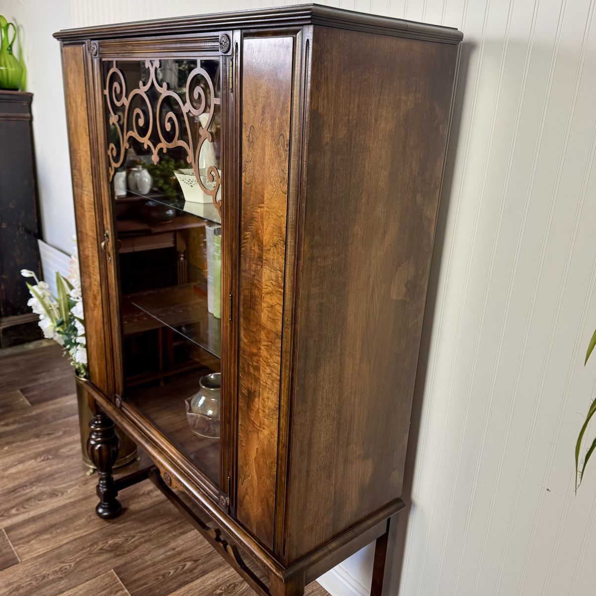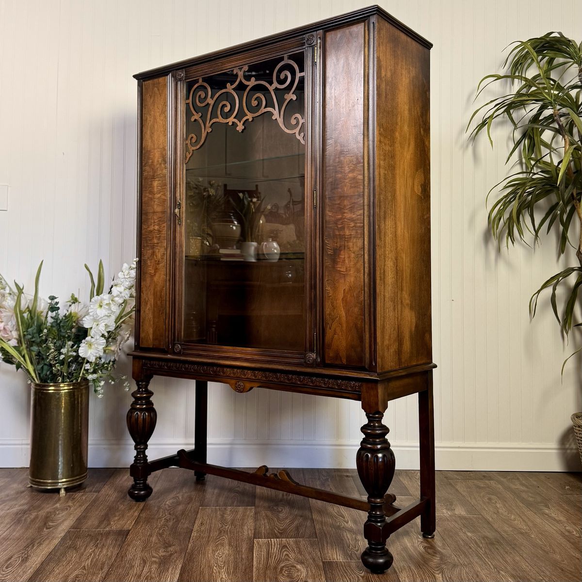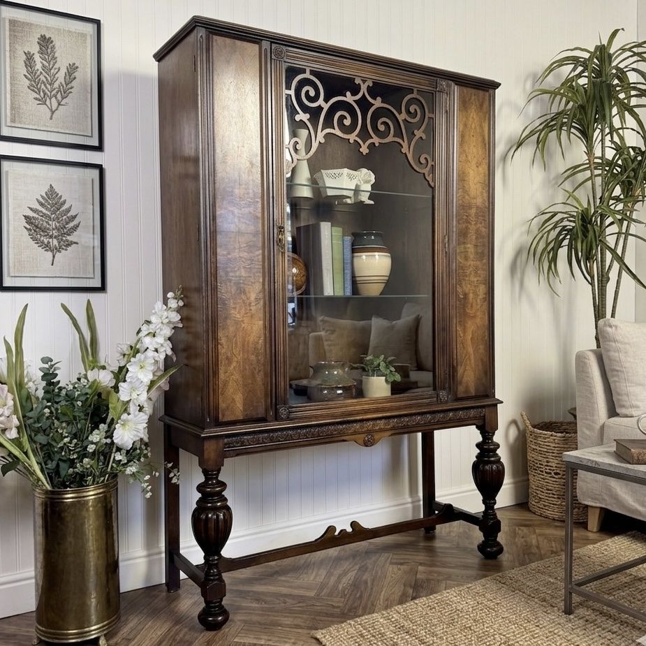 VenmoStunning vintage or antique 1920s/30s Jacobean Revival display cabinet featuring a glass front with decorative carved detailing, richly figured wood grain, and classic turned legs with a stretcher base.