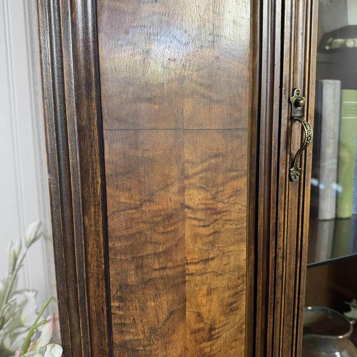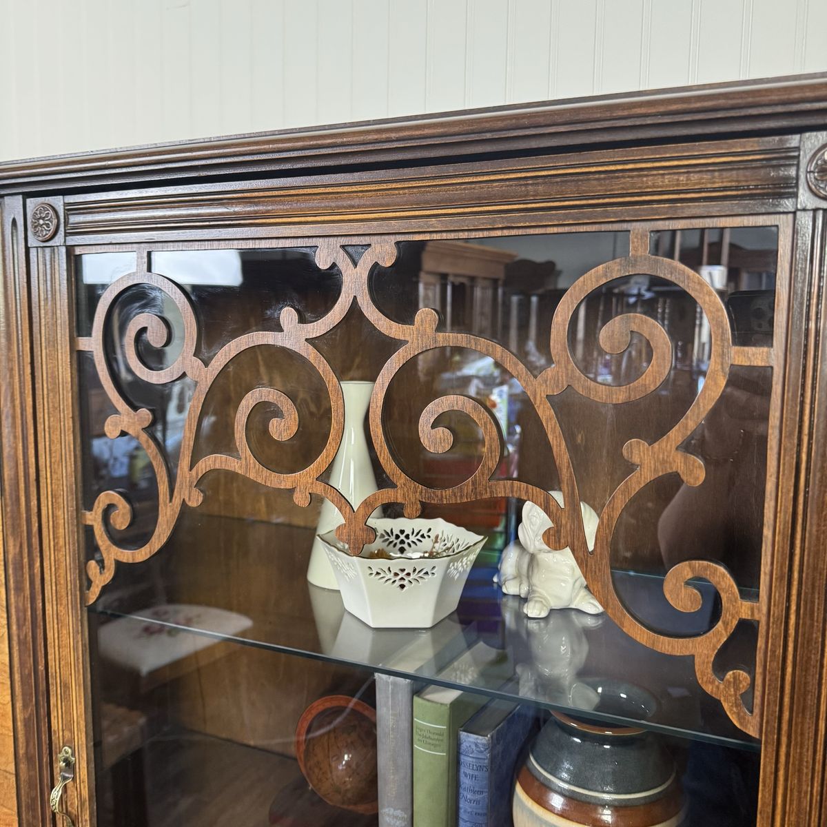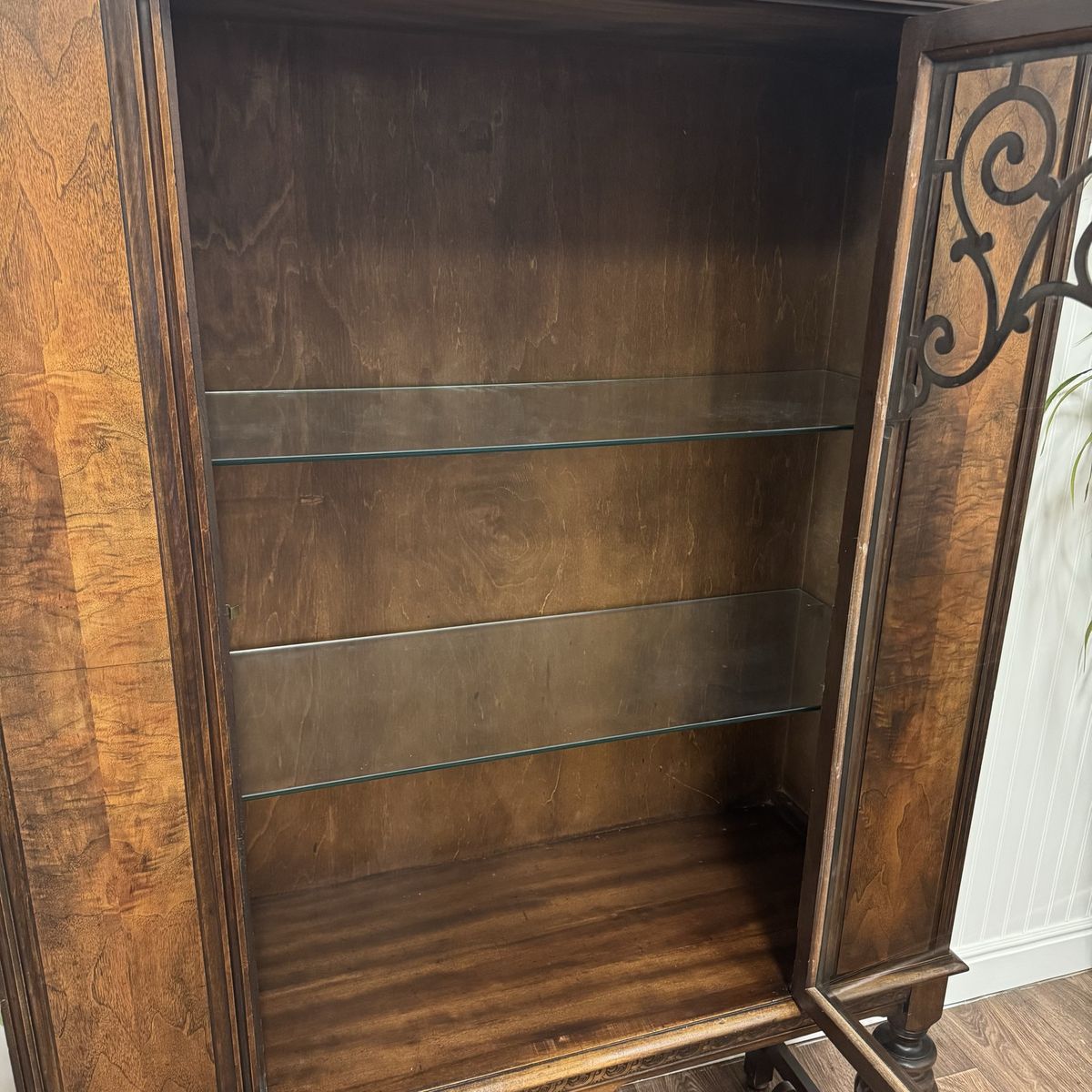 The interior includes glass shelving—perfect for displaying books, ceramics, barware, or collected decor. It has a warm, moody tone that works especially well in traditional, English, grandmillennial, or modern heritage interiors.