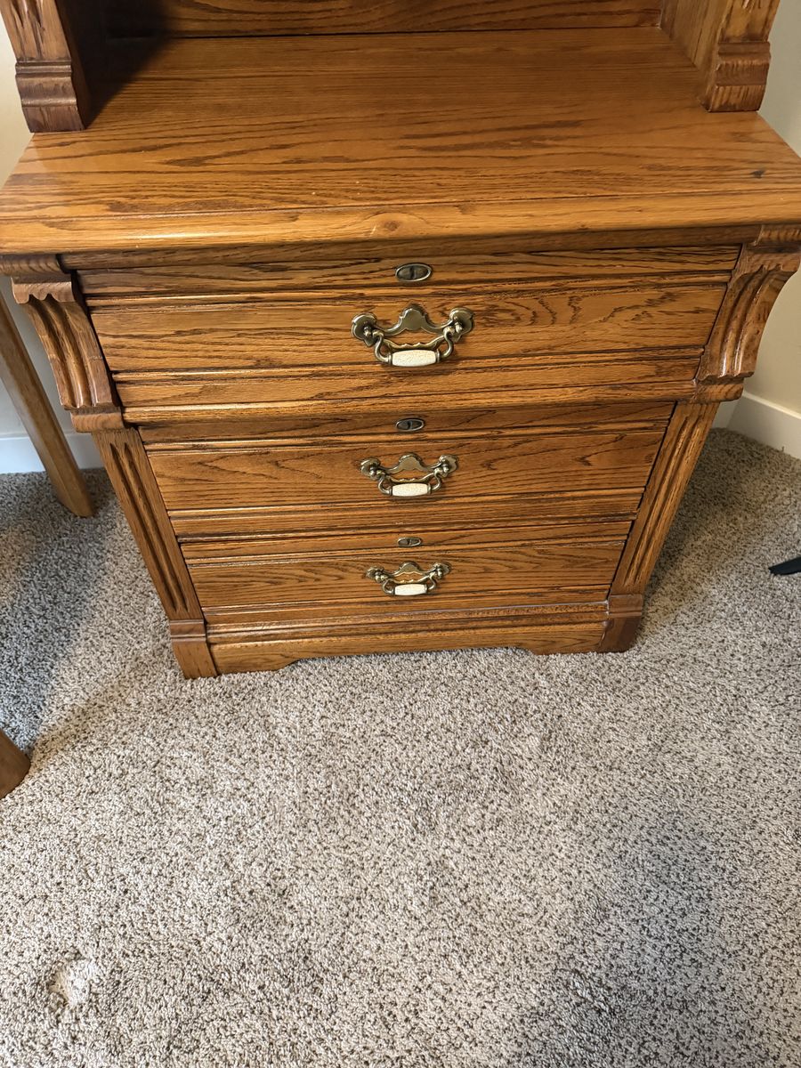 VenmoTwin bed headboard and matching dresser are solid wood. They have been used and there is some slight damage (see pictures) to the top of the dresser but otherwise in good shape. The dresser dimensions are 72" high X 28" wide X 18.5" deep. Would be great for a kids bedroom.