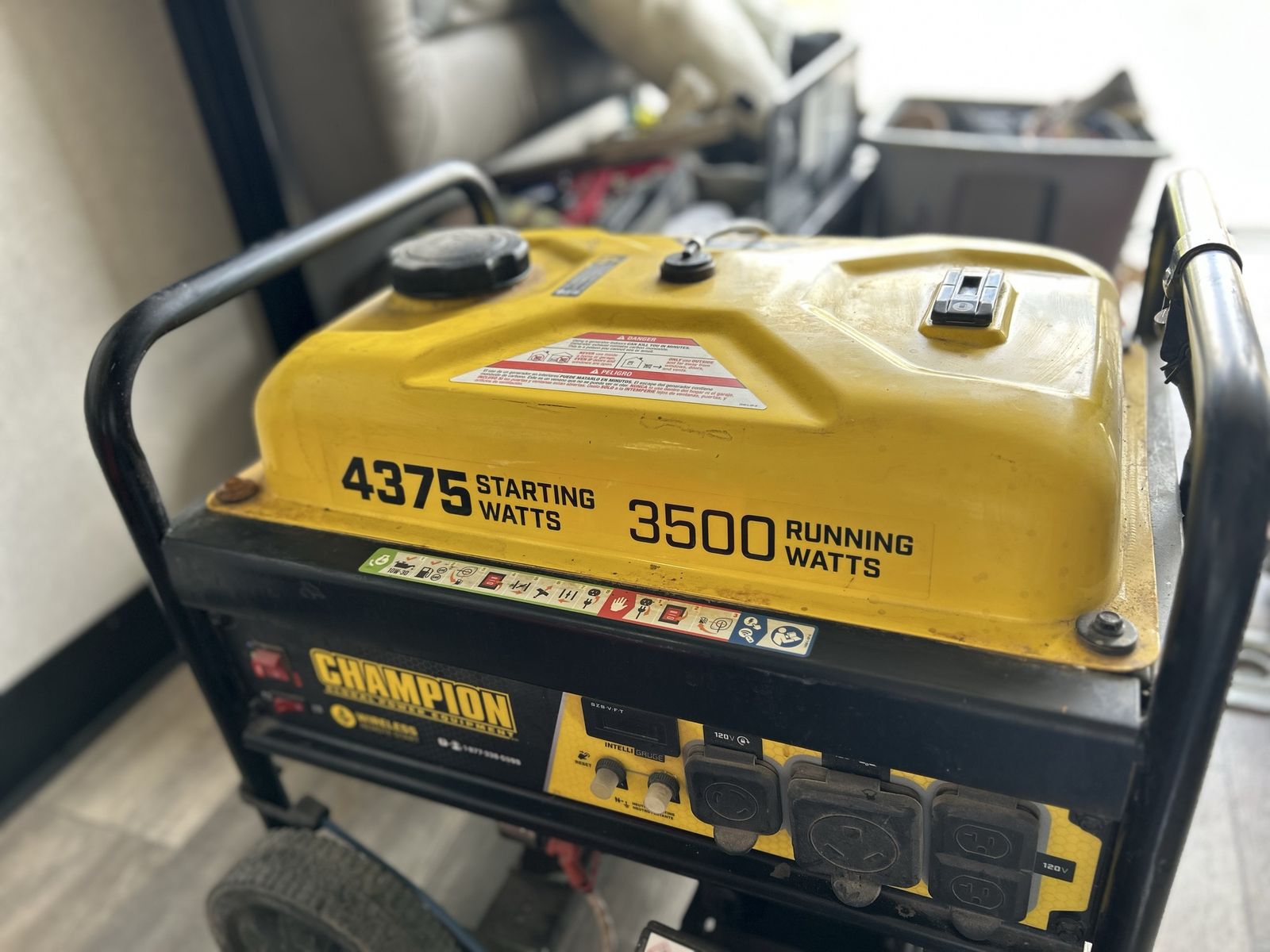 ApplePayChampion 4375/3500 Watt Portable Generator – Reliable Power When You Need It! Need backup power for home outages, camping, tailgating, or job sites? This Champion 4375 Starting Watts / 3500 Running Watts generator delivers strong, dependable performance in a compact, wheeled package. Key Features: • 4375 starting watts / 3500 running watts — enough to run essential appliances, fridge, lights, TV, sump pump, or small power tools • Intelli-Gauge digital display shows volts, frequency, and hours • Multiple outlets: Two 120V 20A household outlets + one 120V 30A RV-ready outlet (TT-30R) • Easy-access control panel with circuit breakers and low-oil shutdown protection • Sturdy steel frame with built-in wheel kit and folding handle for easy transport • 4.7-gallon fuel tank for extended run time (up to 9–14 hours at 50% load depending on model variant) This unit is in good used condition with normal wear for a generator. The tank and body show some scuffs and dust from storage, but everything looks functional and ready to run. Perfect for emergency preparedness or weekend adventures. New versions of this size Champion generator typically retail for $500 – $700+ depending on features like remote start or dual-fuel capability. Ask