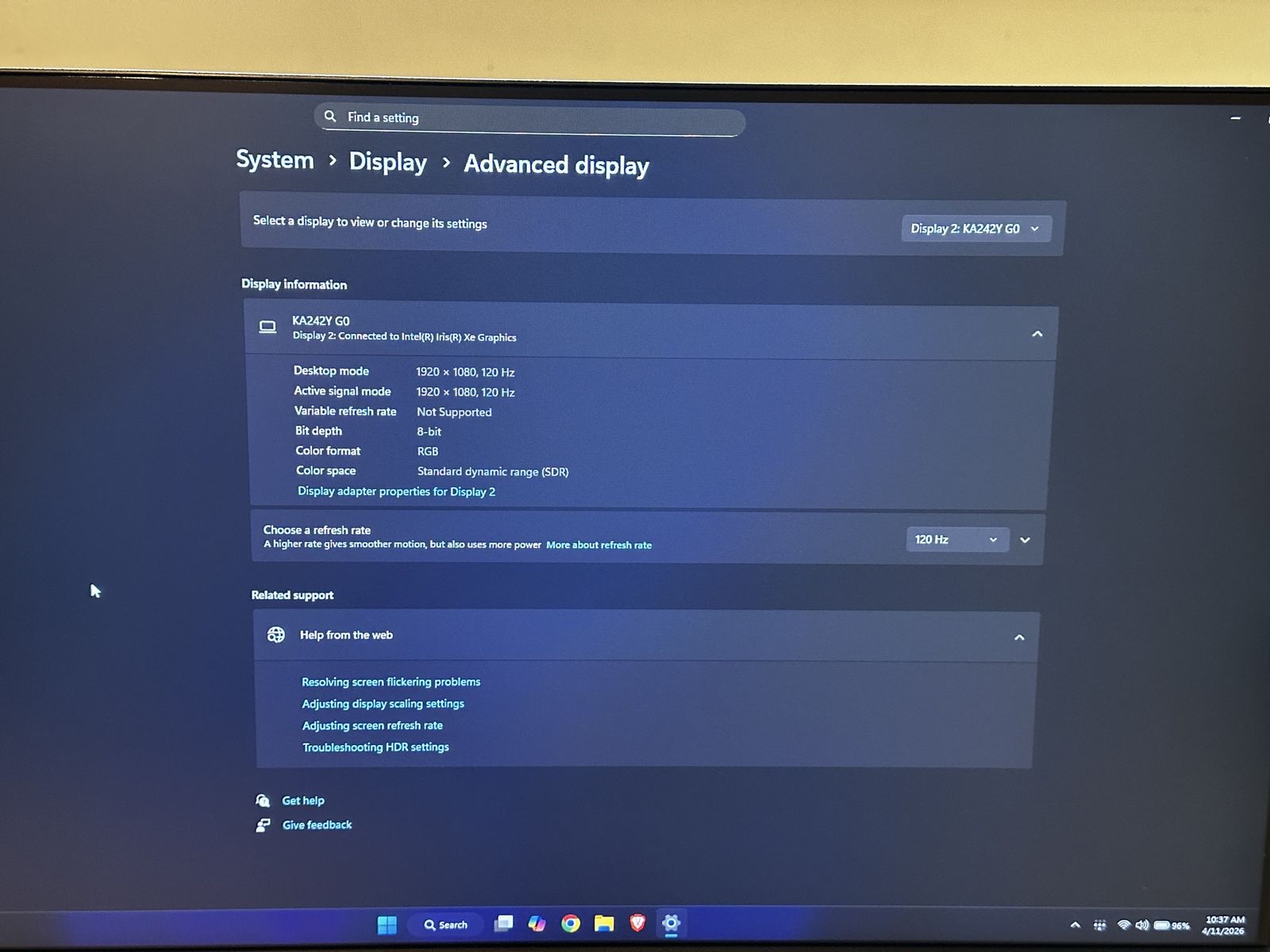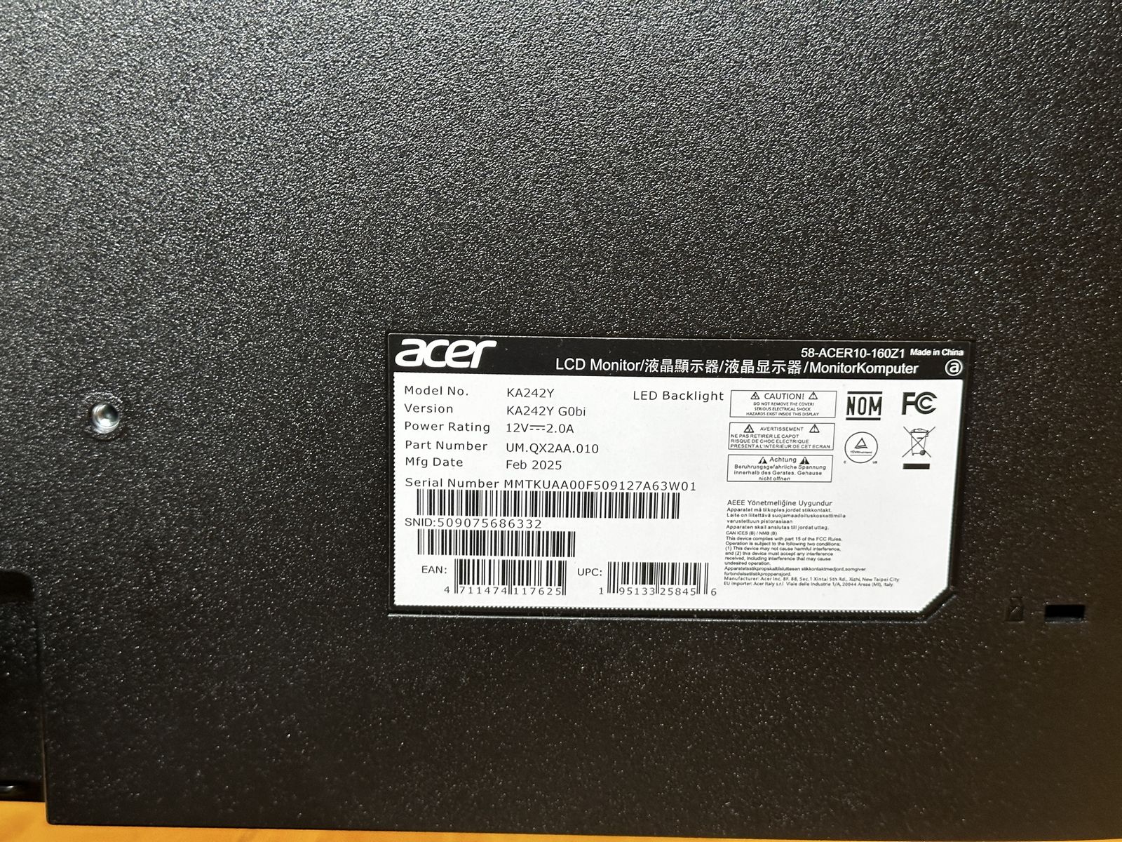 Model: KA242Y Mfg Date: Feb 2025 Resolution: 1920 x 1080 Refresh rate: 120hz Panel: IPS