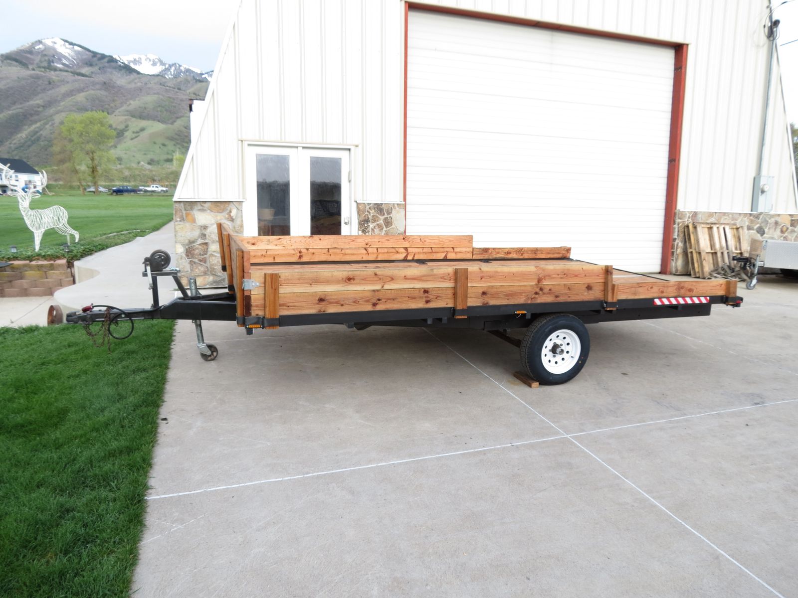 Perfect trailer for rafts, snowmobiles, motorcycles, UTV, Side by Sides, general utility, etc. I just hauled 2 Goldwing motorcycles (about 2000 pounds) on it with no problem whatsoever. All around solid, trailer with a nice open 8 foot by 14 foot deck. Has secure tiedown bolt holes in the deck for securing snowmobiles, additional tie downs for securing motorcycles. A side by side would easily fit on this deck. Rafts can be easily transported and secured. All around utility trailer for yard work or anything else that needs moved.