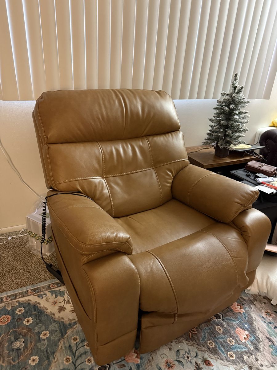 ZelleOversized leather recliner, this recliner lays back flat snd it'll hal help you stand up. it has massage option, two cup holders and pockets on each side.