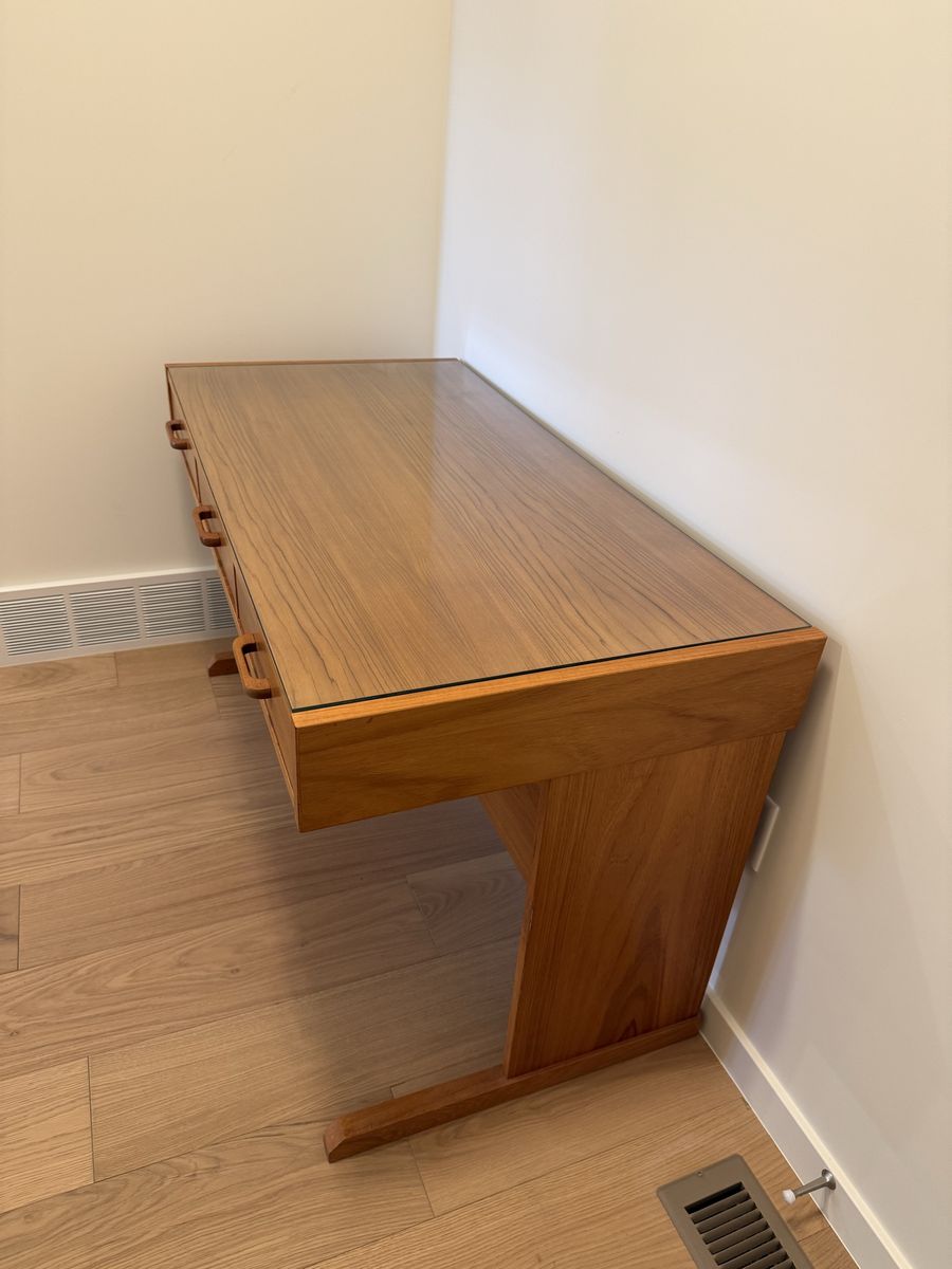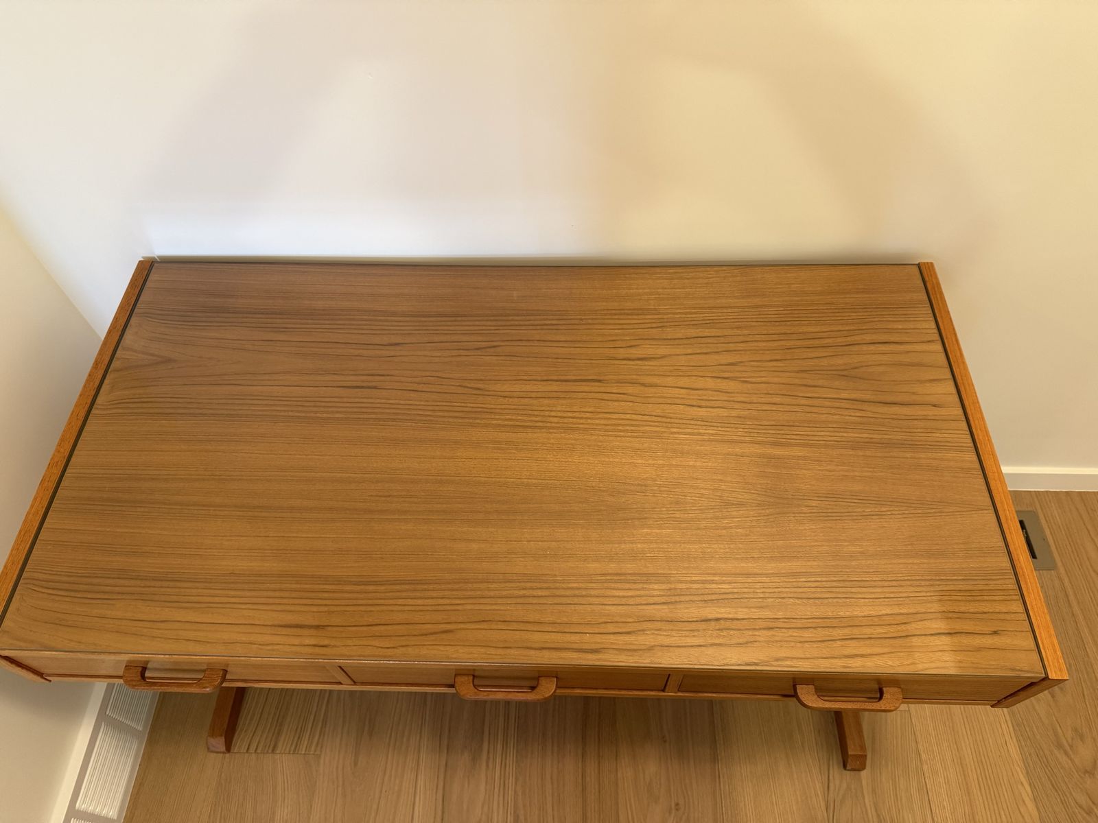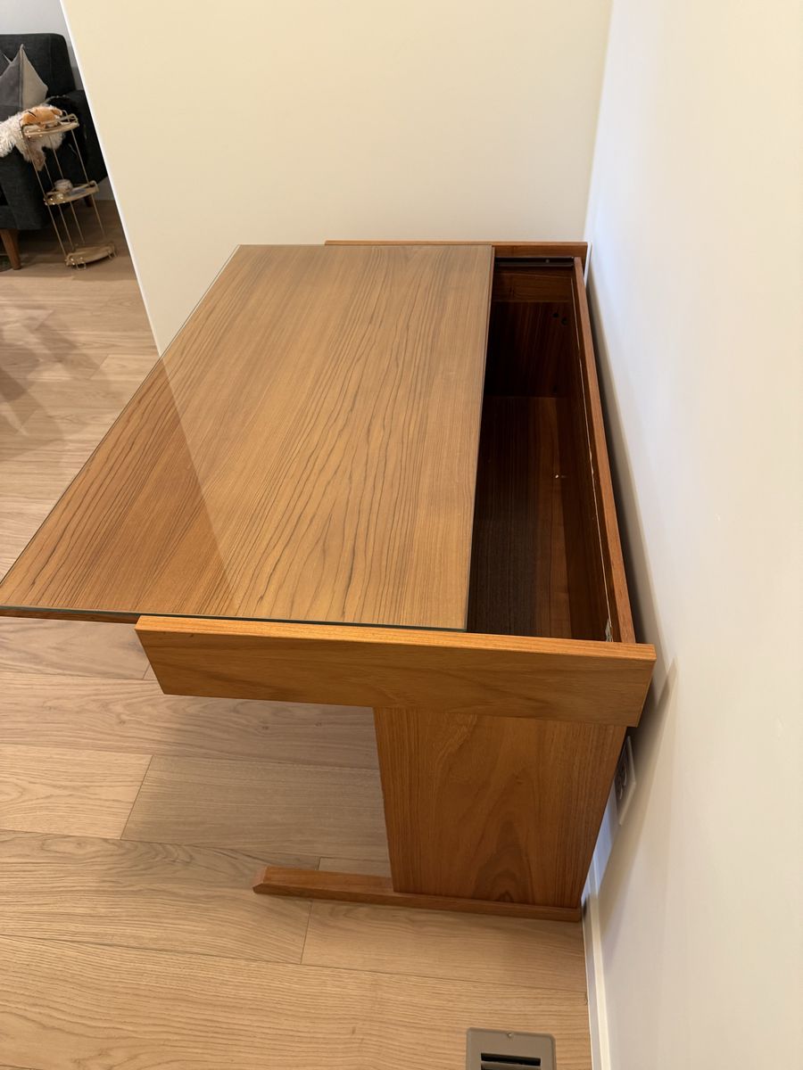 ZelleCool mid century desk with 3 drawers and large hidden storage. The top slides forward to open the hidden storage. Glass top to protect the desk. Excellent condition. Willing to meet or deliver in Salt Lake City/Park City area. All sides are finished, so it looks great from any angle. 48.5”w 24”d 29”h Asking $850 OBO. I have seen these selling for much more.