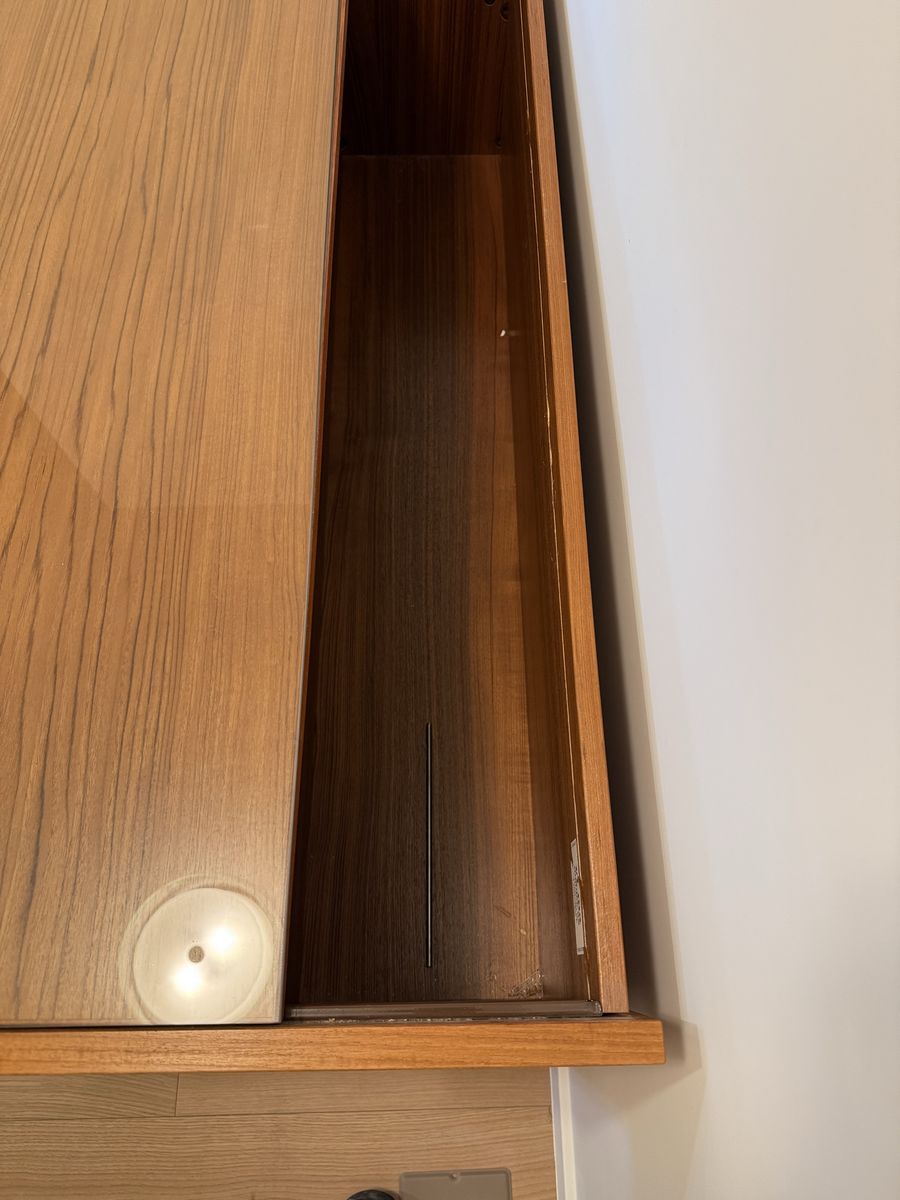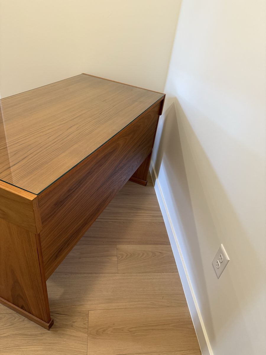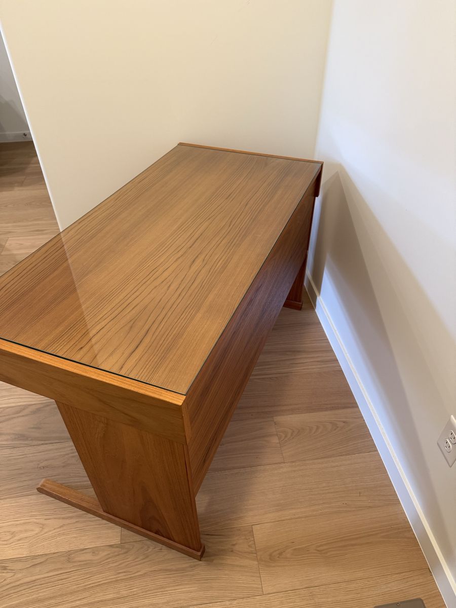 ZelleCool mid century desk with 3 drawers and large hidden storage. The top slides forward to open the hidden storage. Glass top to protect the desk. Excellent condition. Willing to meet or deliver in Salt Lake City/Park City area. All sides are finished, so it looks great from any angle. 48.5”w 24”d 29”h Asking $850 OBO. I have seen these selling for much more.