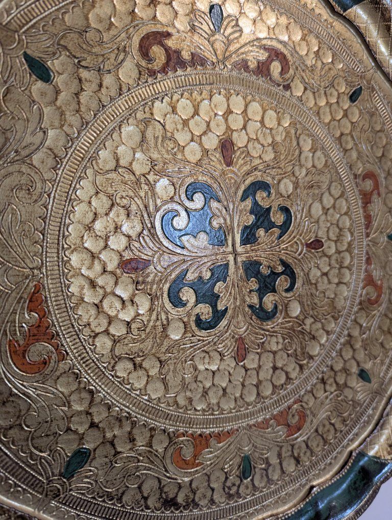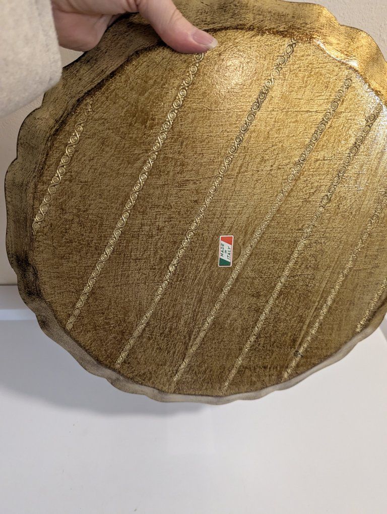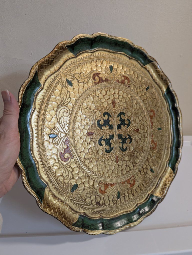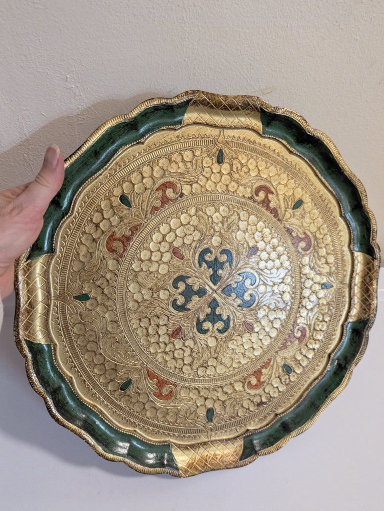 Venmo15" vintage gold, green and orange large round Florentine Italian serving tray Toleware in perfect condition. No scrapes or cracks *Look at my other listings of Florentine Toleware