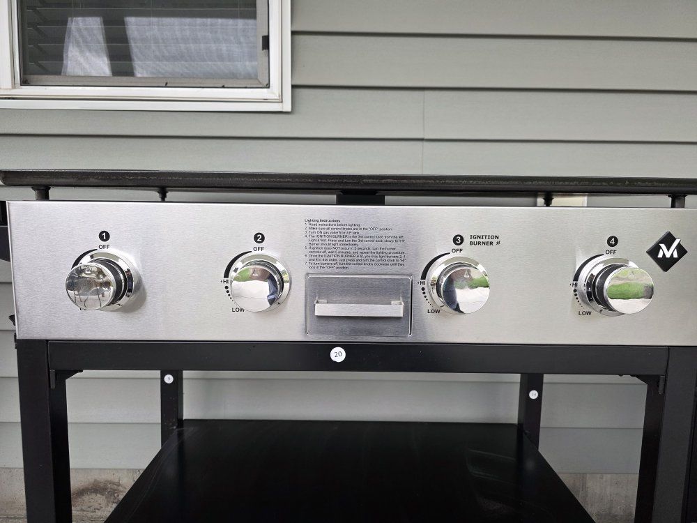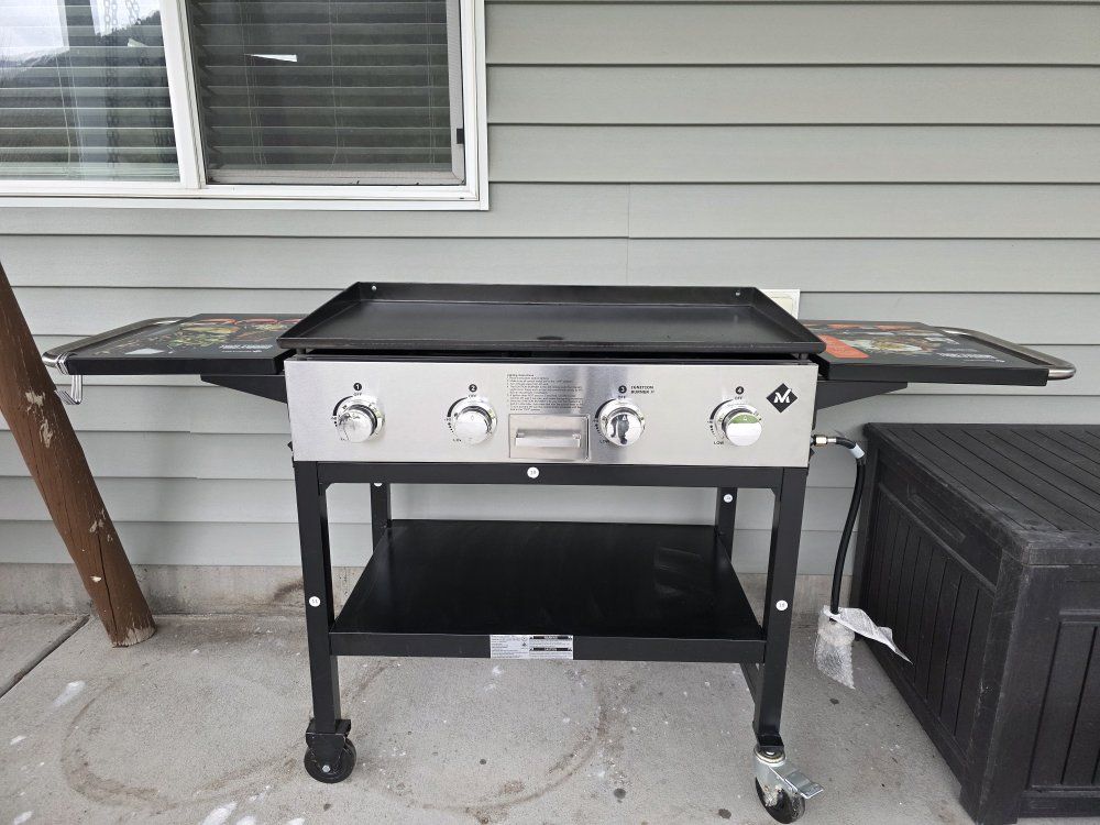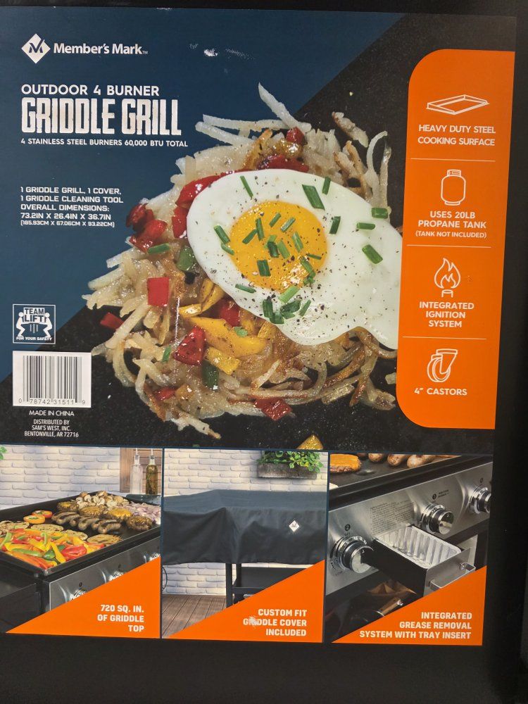 VenmoMembers Mark 4 burner gas griddle with cover. This has been assembled, but is has never been used. Griddle is 36"x20". Over all it is 74 inches wide by 36 inches tall.