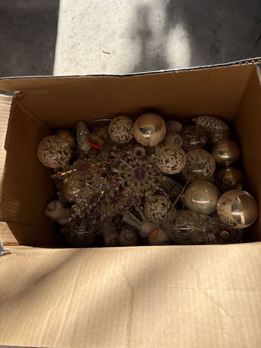 Box of white and silver ornaments
