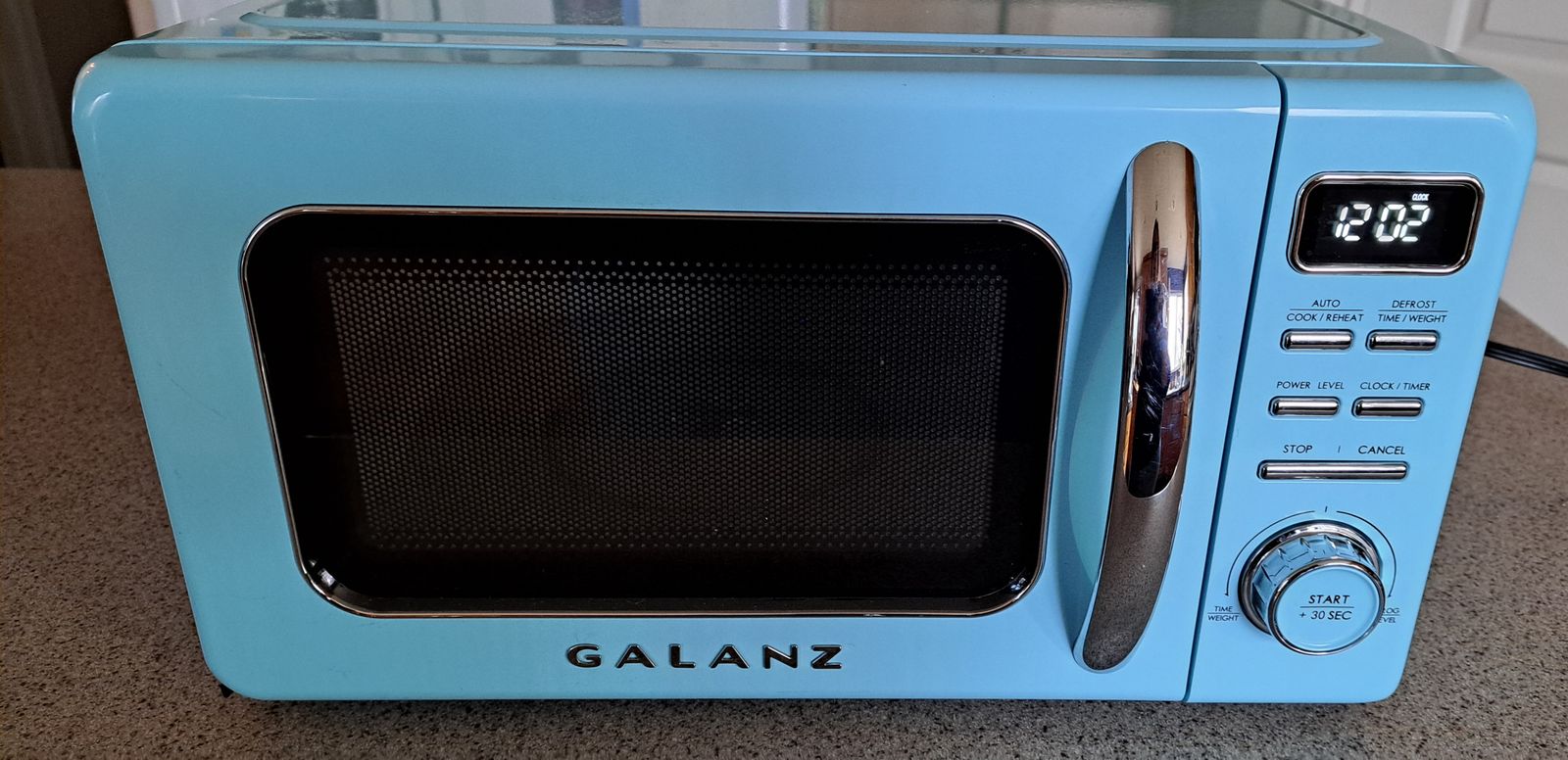Color: Blue; Capacity: 0.7 Cubic Feet; Special Feature: Auto Cook, Defrost, Turntable; Wattage: 700 watts; Material: Glass, Stainless Steel