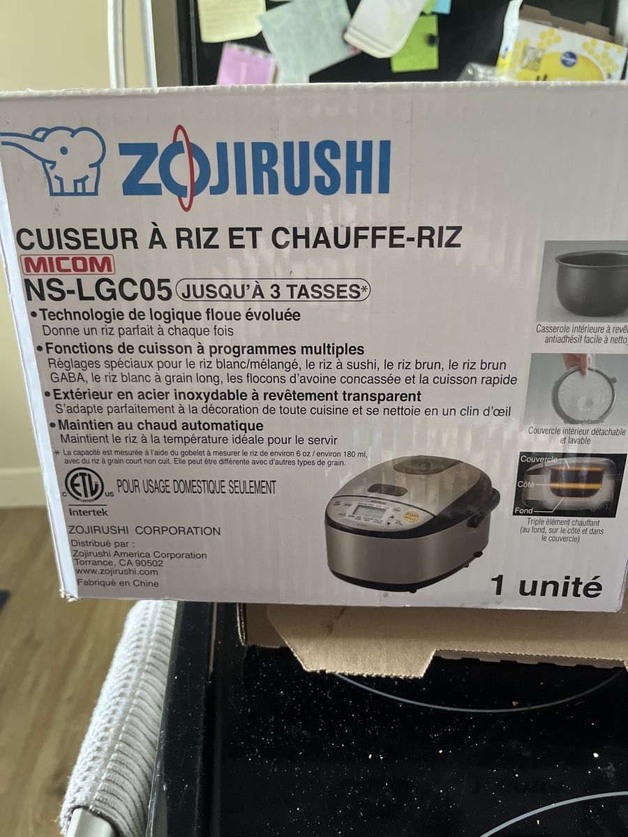ZelleZojirushi rice cooker and warmer, up to 3 cups. Prepares rice perfectly every time. Brand new in the box.