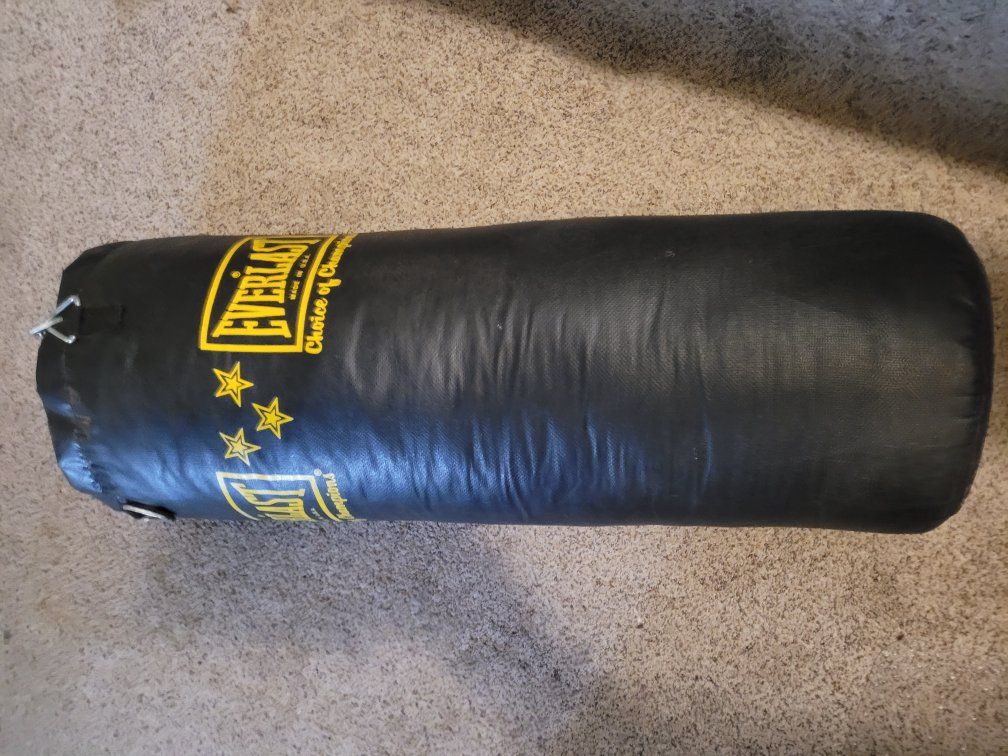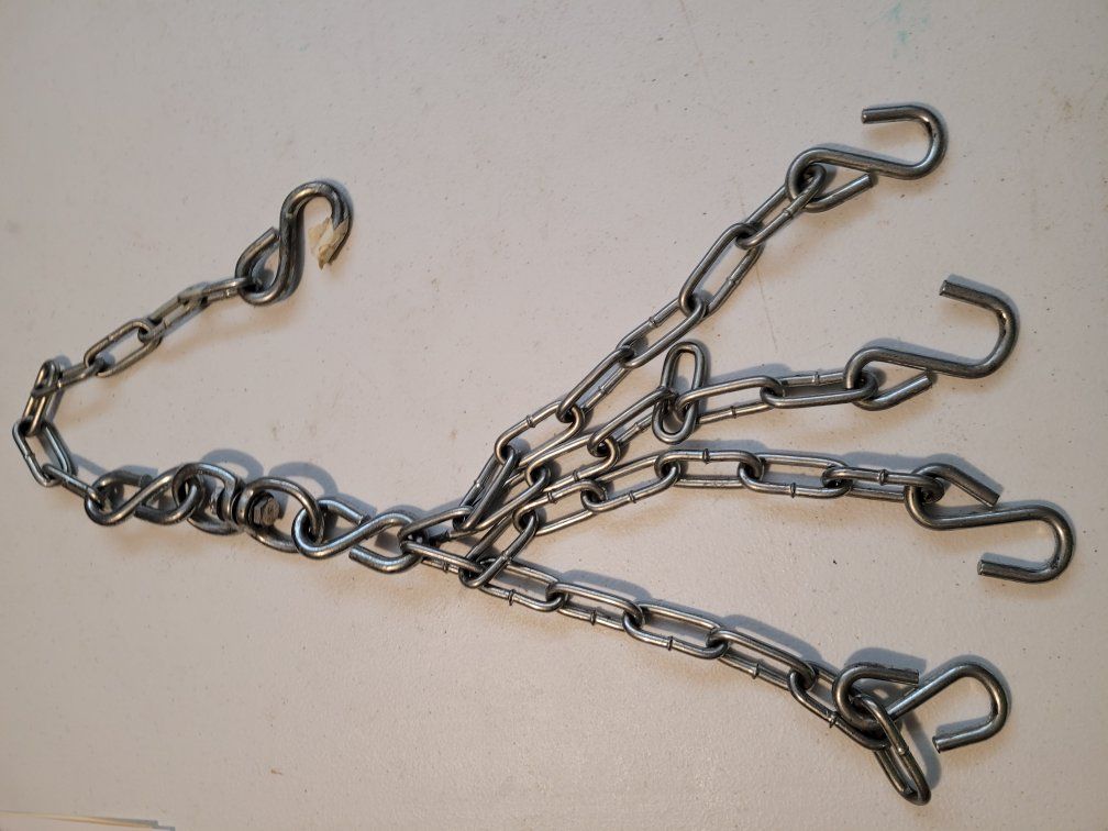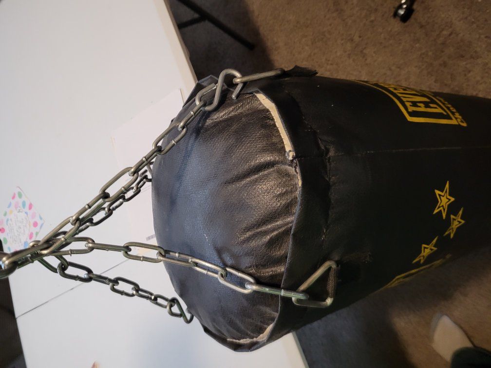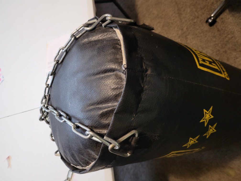 Venmofaux black leather. 3' 6" high.13" diameter. Swivel chain attaches to 4 durable straps