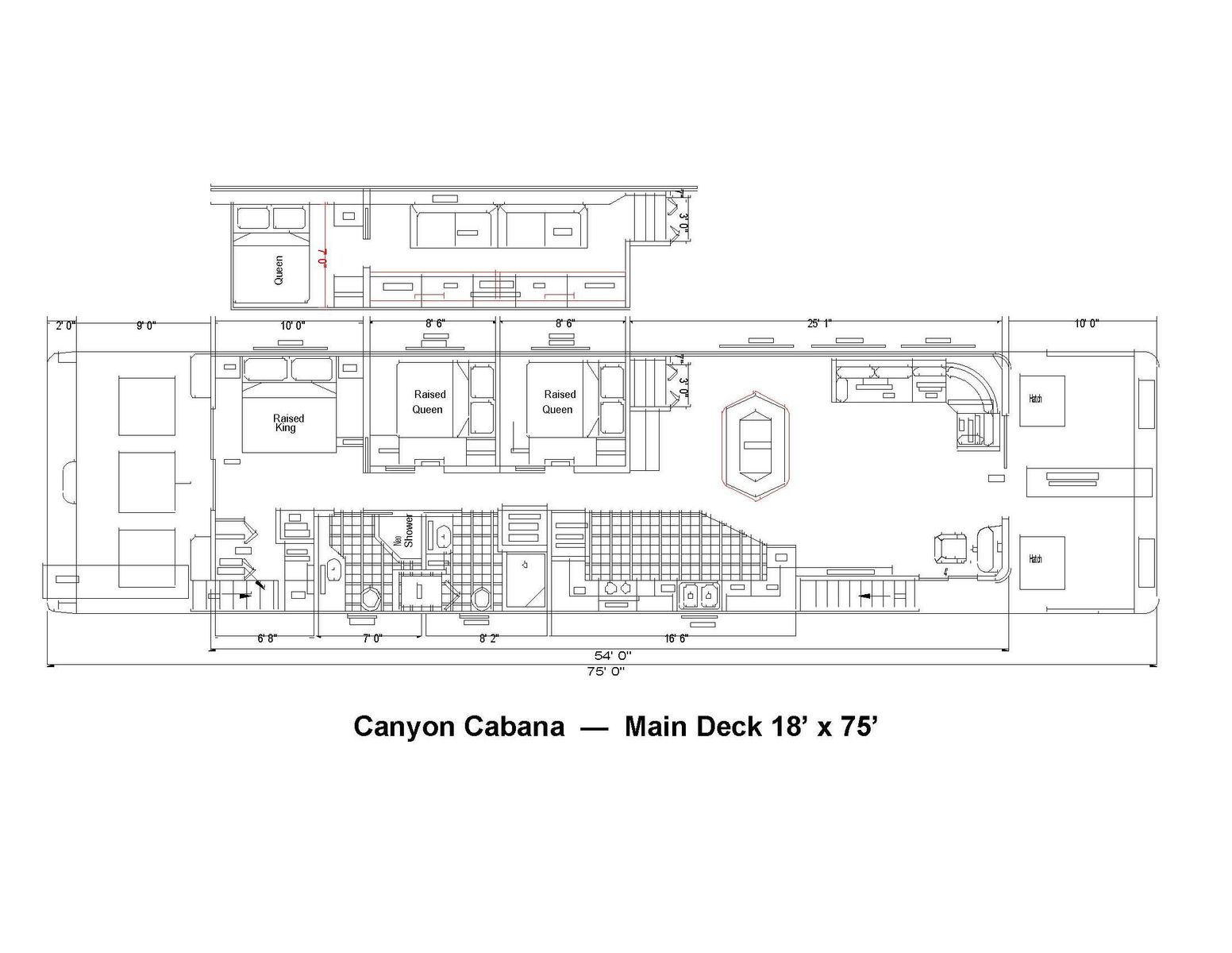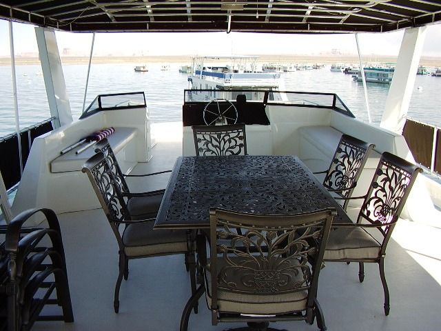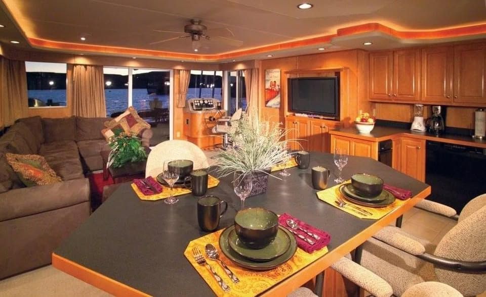 Vessel Highlights • 75’ x 18’ Starlite houseboat • Custom-designed and built by Starlite Houseboats • Fuel capacity: 400 gallons for main engines and generator, plus 100 gallons dedicated toy tank • Starlink Internet (excellent connectivity on the lake) • Twin Mercruiser/Bravo II outdrives (No hourly engine or generator charges) • Full-control flybridge with padded sundeck • Full kitchen with dual refrigerators • Topside deck with wet bar and patio furniture • Entertainment center with plasma TV, sound system & satellite dish