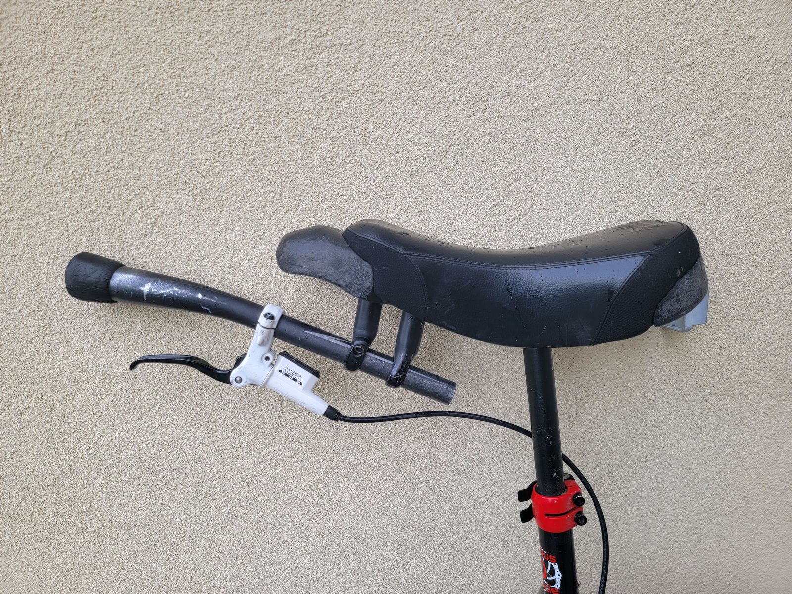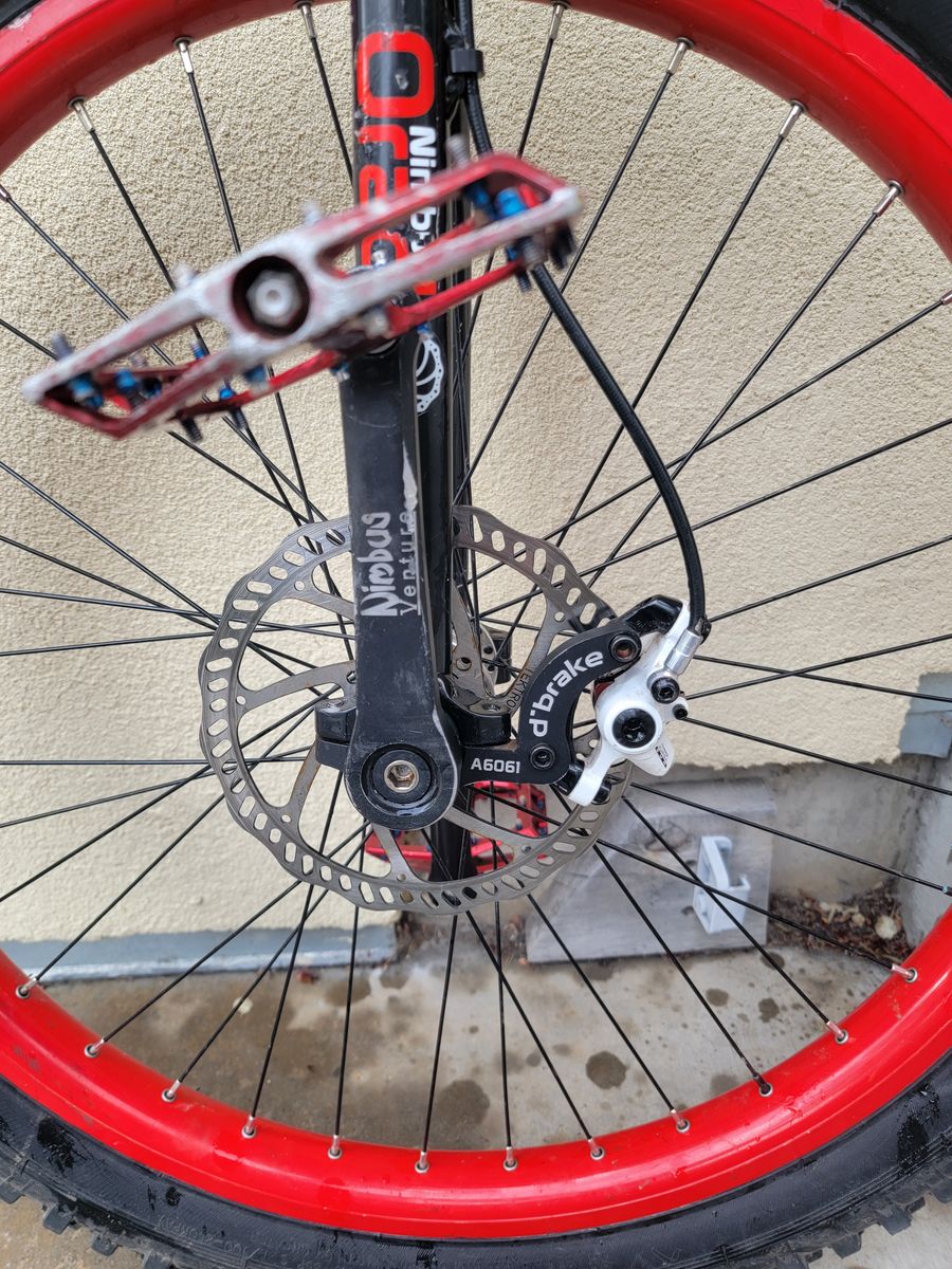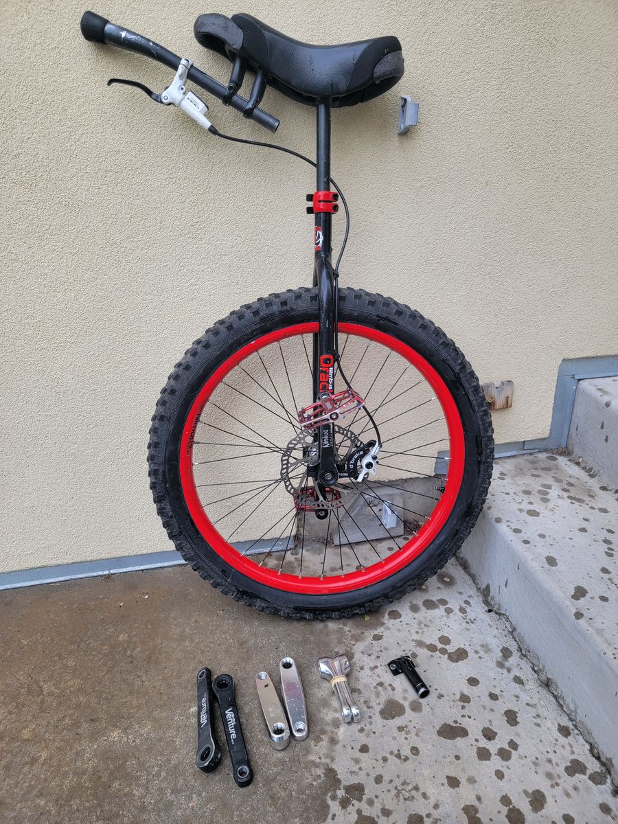 Numbus Oracle 26" mountain unicycle. It's well loved, but also well cared for. Mechanically, it's in wonderful shape. Cosmetically, it's got its war wounds. What do you expect? It's a mountain unicycle... One does not ride without crashing occasionally! Comes with optional disc brake installed on custom handle for better control. Three additional sets of cranks included so you can meddle with the power/efficiency ratio all you want. Original disc brake mount handle also included if you want to switch back to that. $250