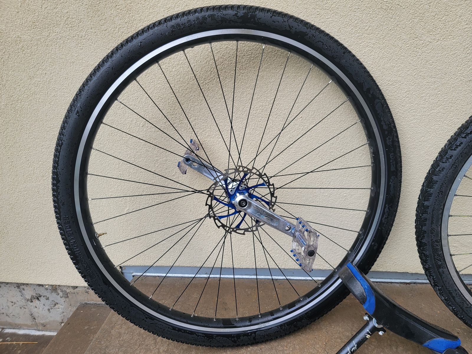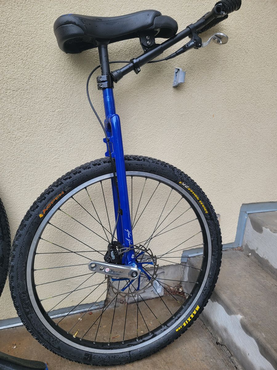 Kris Holm 36" unicycle with extra 29" wheel, so you can swap back and forth. Both wheels true and in good shape. Both have KH Spirit dual hole cranks so you can change crank length as you see fit. Comes with Original KH saddle and KH Fusion (flat) street saddle. Disc brake in good shape, and disc rotors as true as the day they were installed. $500