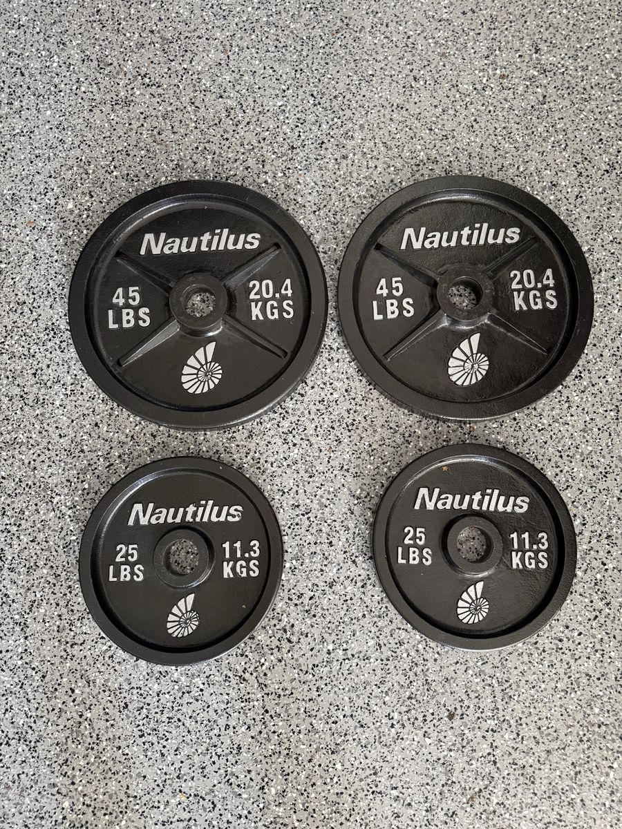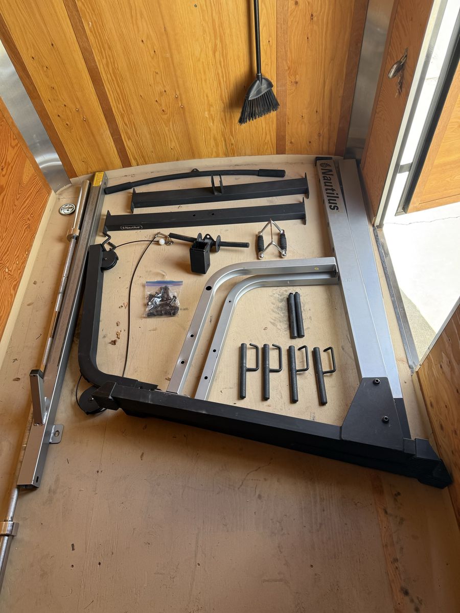 VenmoThis a Nautilus home gym system that has adjustable heights for bench press, squat rack, and lat pull down pulley system. It is approximately 7.5’ tall. Everything is in excellent working condition. Includes Olympic style weights (2x45, 2x25), 45lb Olympic barbell, and 2 different pull down attachments. Bench not included.