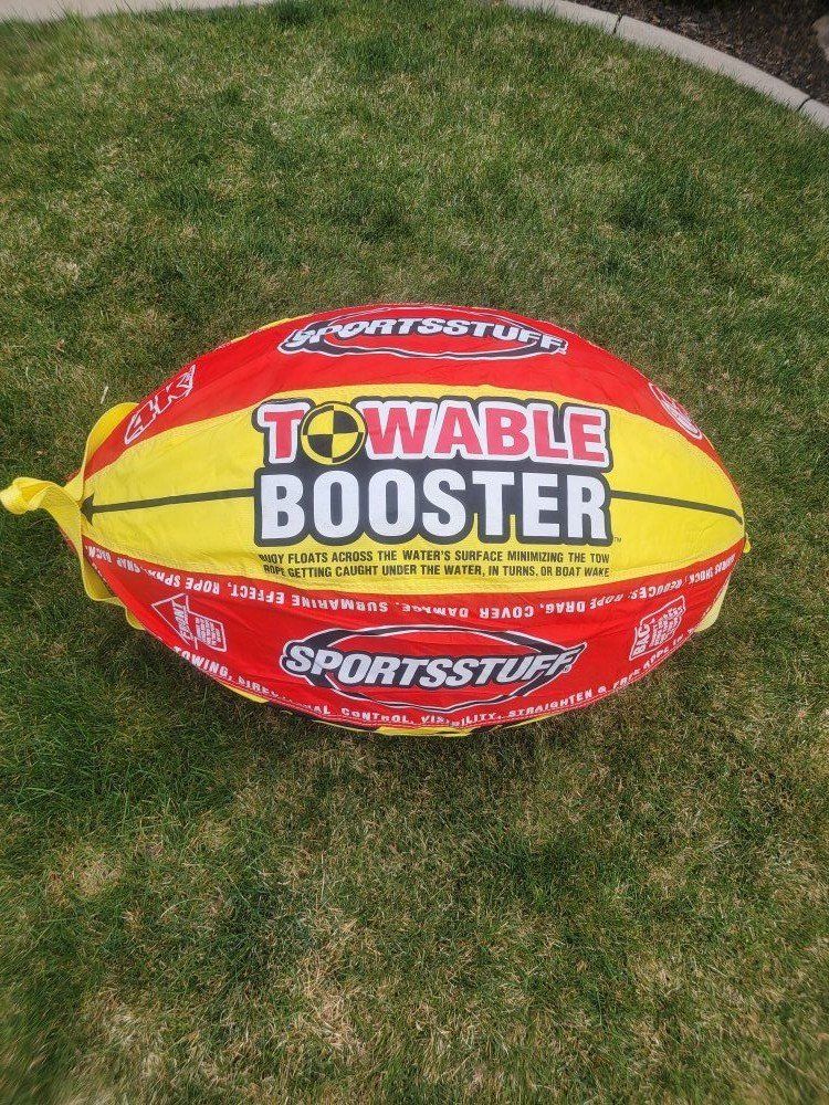 VenmoSportsStuff Booster Ball works through a simple but effective design:How it functions: • Inflatable buoy in the middle – The ball sits between your boat and the towable tube, floating on the water's surface