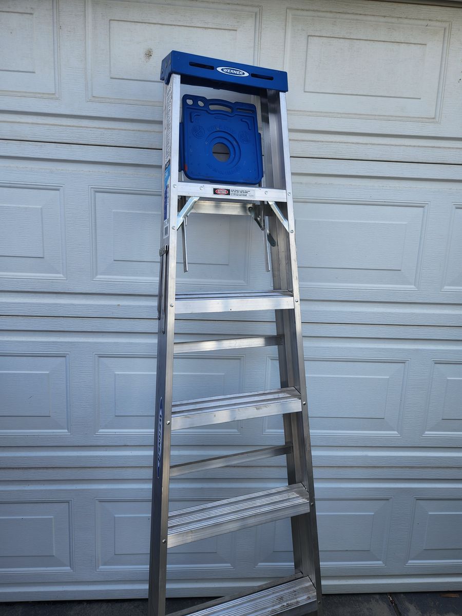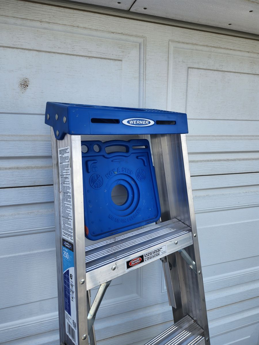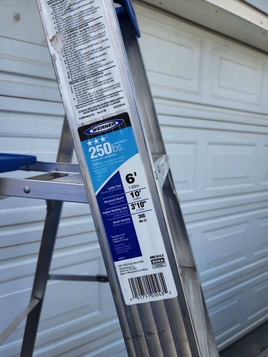 WERNER Stepladder, 6 ft Ladder Size, Aluminum, 250 lb Load Capacity, 11 lb weight. Average reach - 10ft 5in.