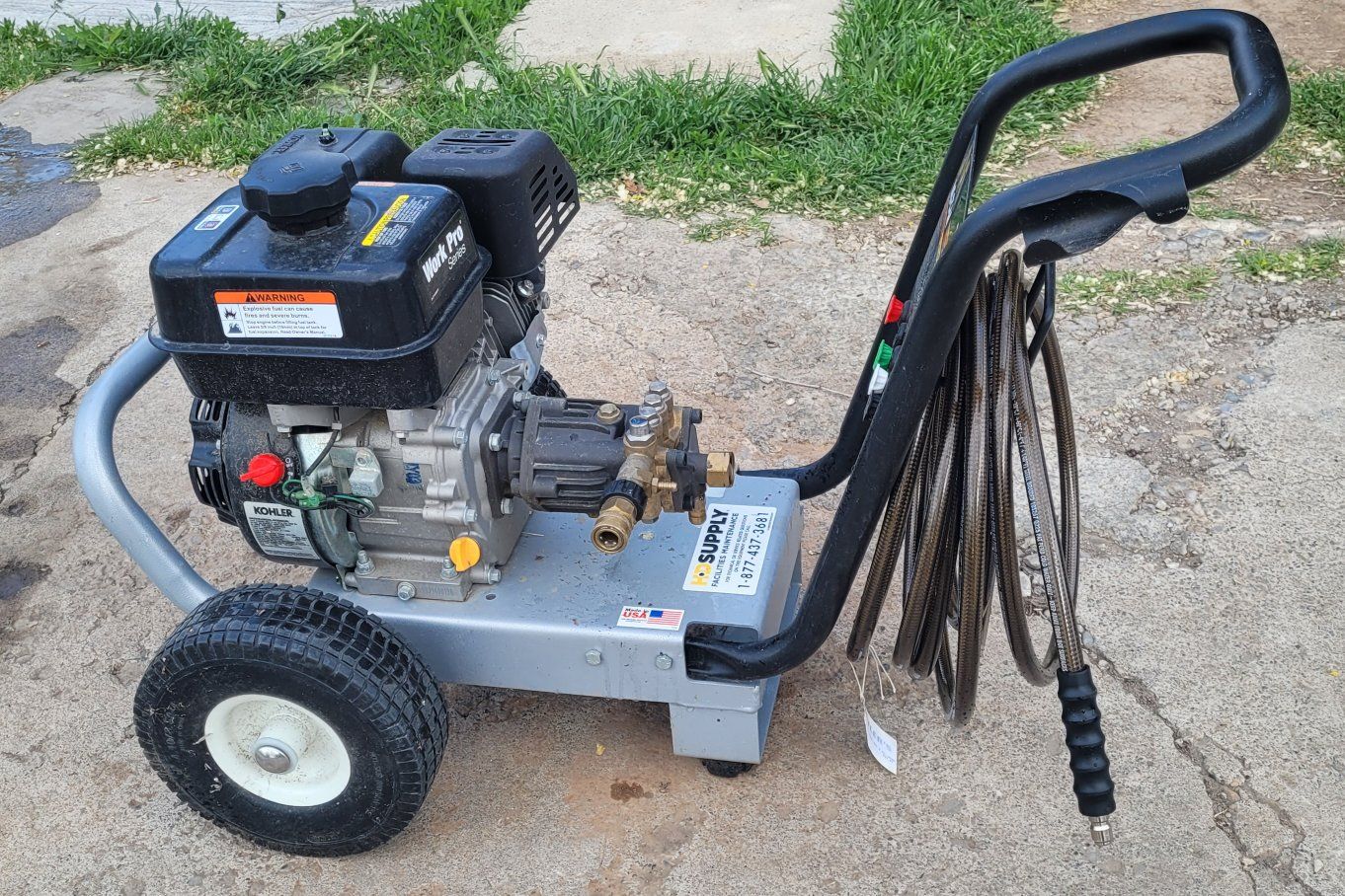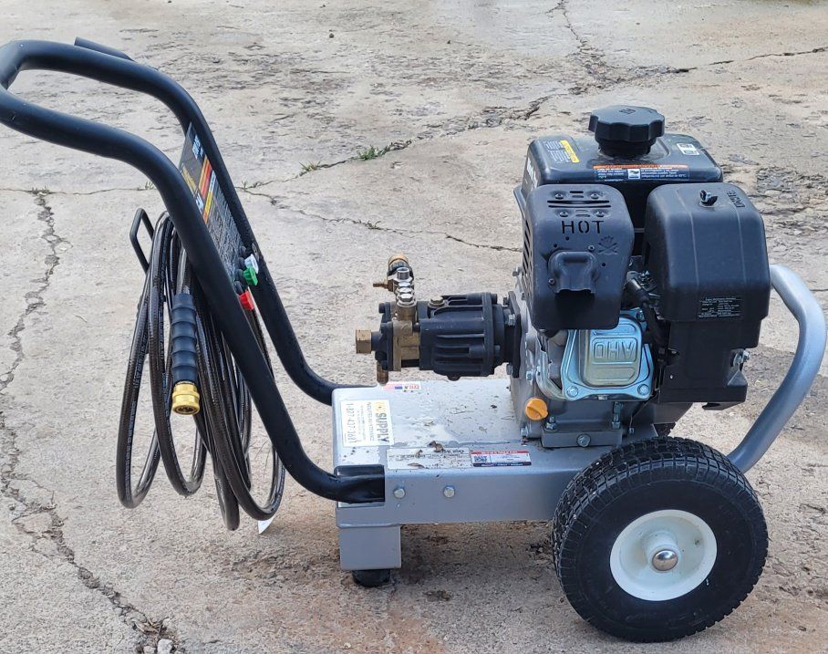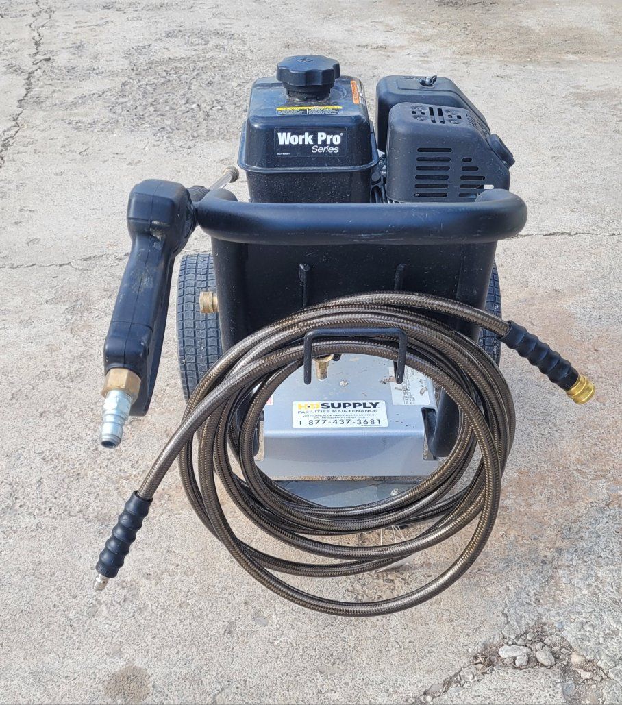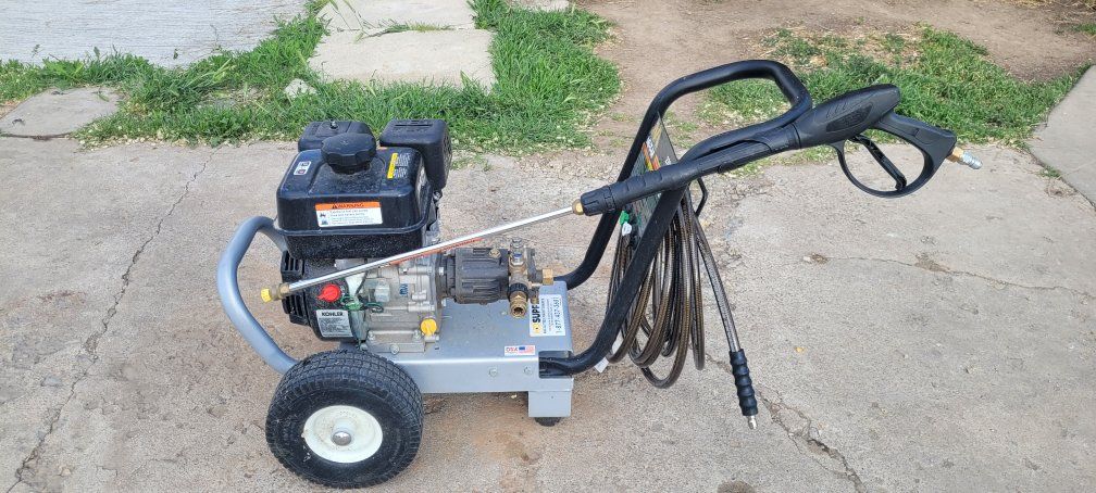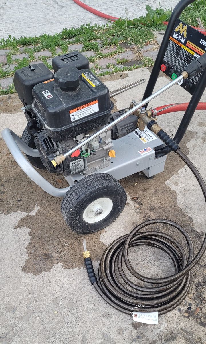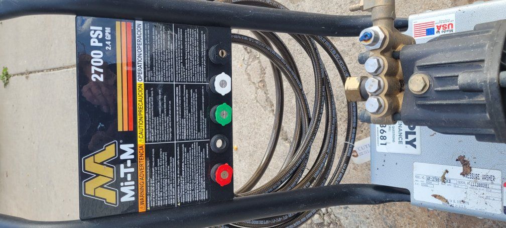 Mi T M CA 2700 PSI 2.4 GPM Gas Powered Cold Water Pressure Washer with 3 Spray TipsGas powered cold water pressure washer delivering 2700 PSI of pressure at 2.4 GPM. 6.5 HP Honda OHV engine. Commercial use pressure washer. 1 Each 0°, 15°, & 25°. 25 Ft wire-braided hose. Aluminum frame and base plate with 1-1/4 handles. 10-inch flat-free tires $720. OBO
