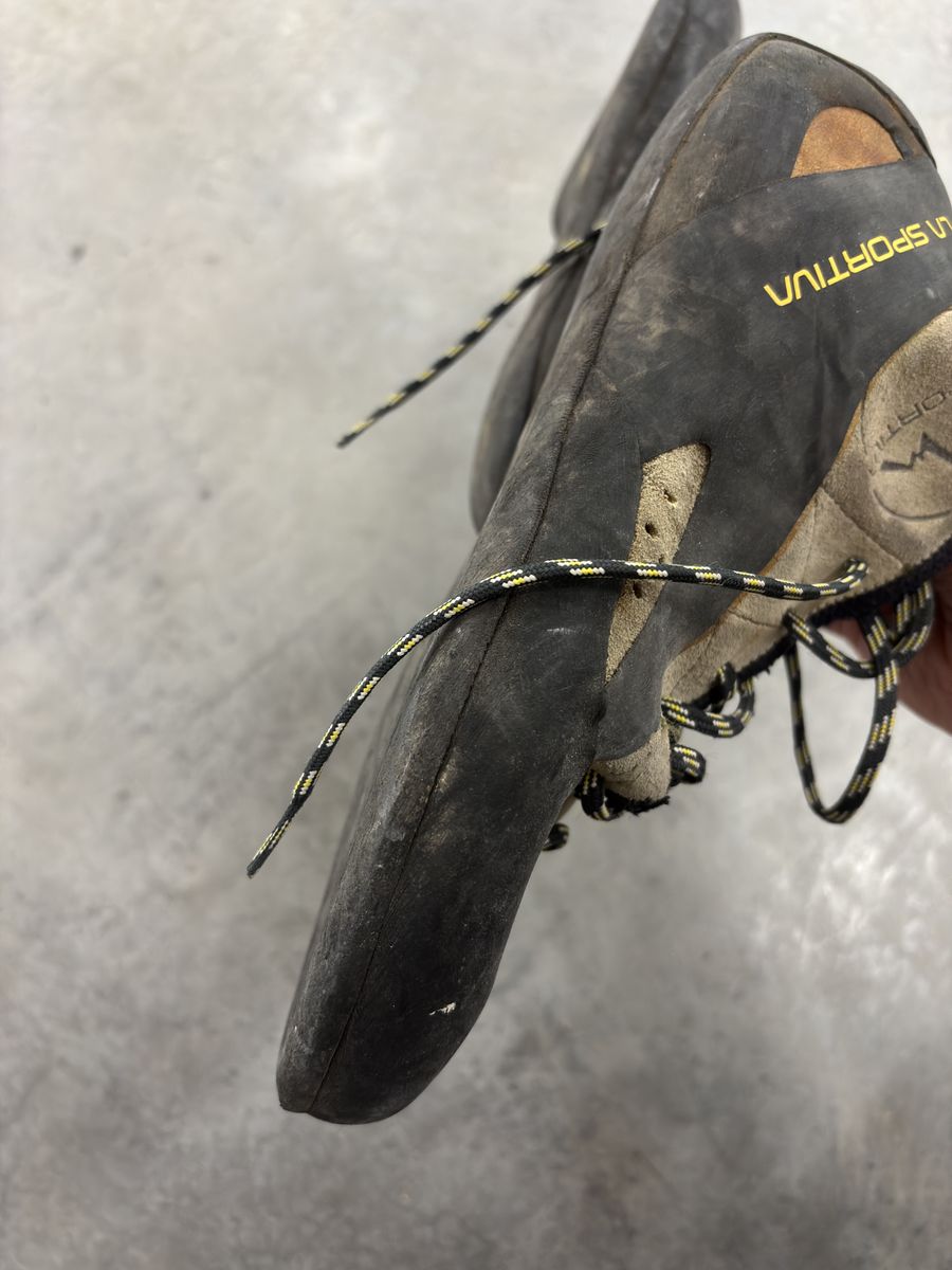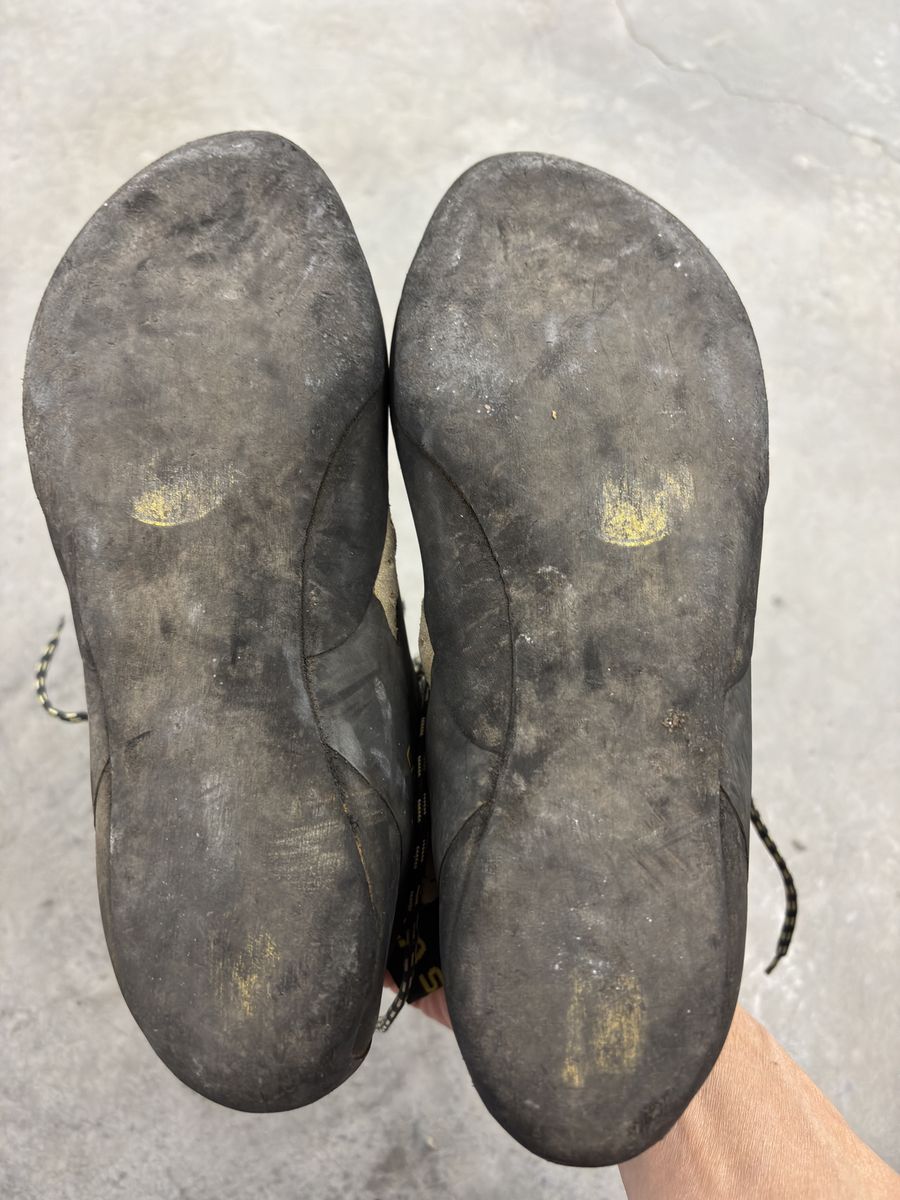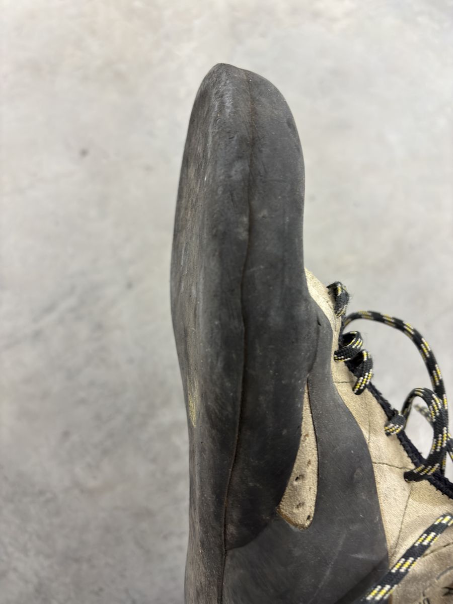 Never re-soled, still stiff. Rand intact, edge in good shape; still some pitches to go on factory original P3 platform.