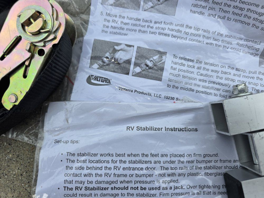VenmoI have a set of 4 Valterra universal RV stabilizers. These work really well to stabilize and take the sway/wobble out of an RV. Works with motor homes, travel trailers, and 5th wheels. Three are in excellent shape, and one the push pins broke off. These sell for about $70 ea on Amazon, and a set 8 of new push pins are available on Amazon for $5 (see pictures). I only have three bags, and one of them is ripped. Two stabilizers can fit in each bag.