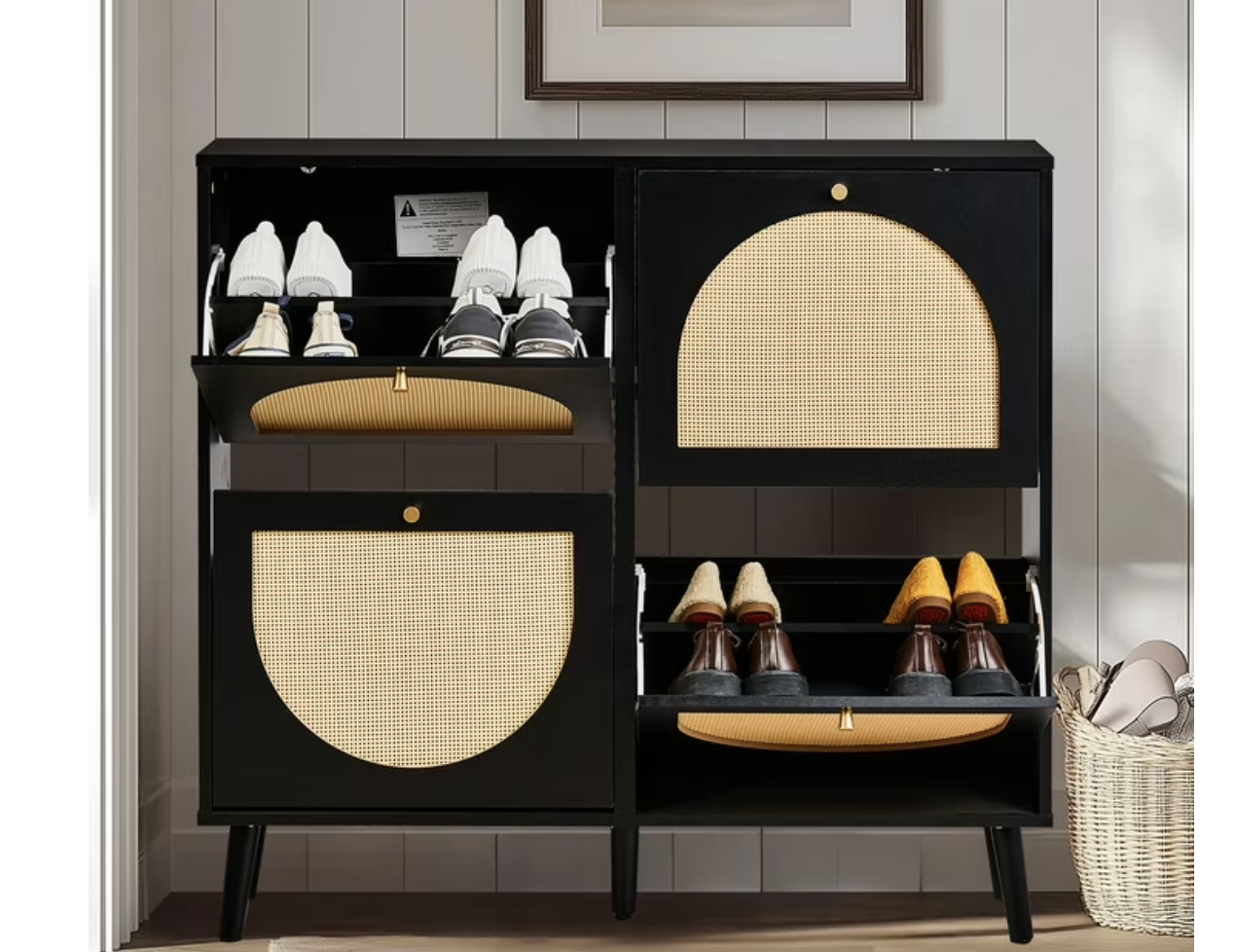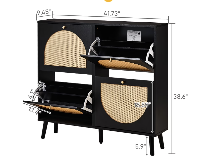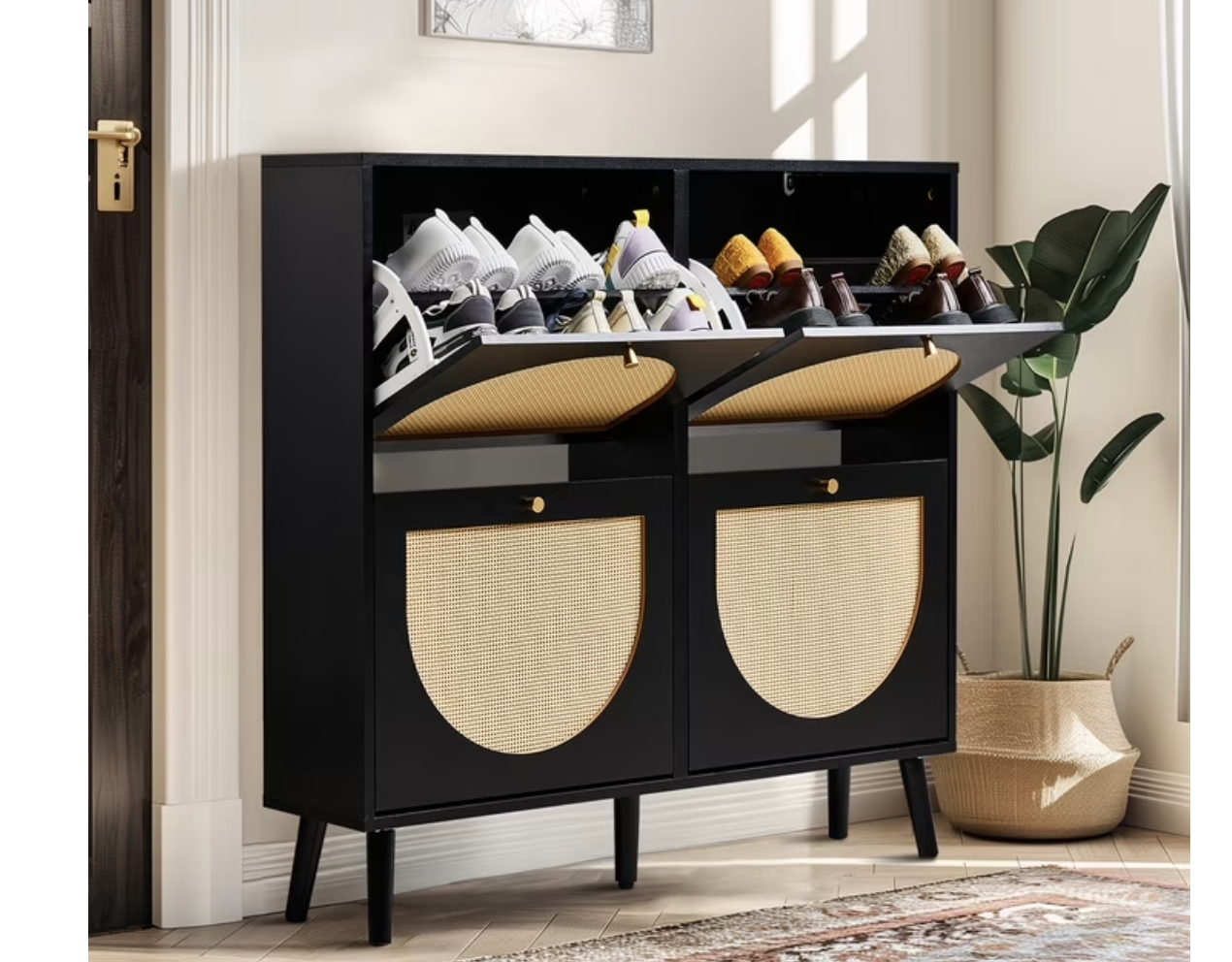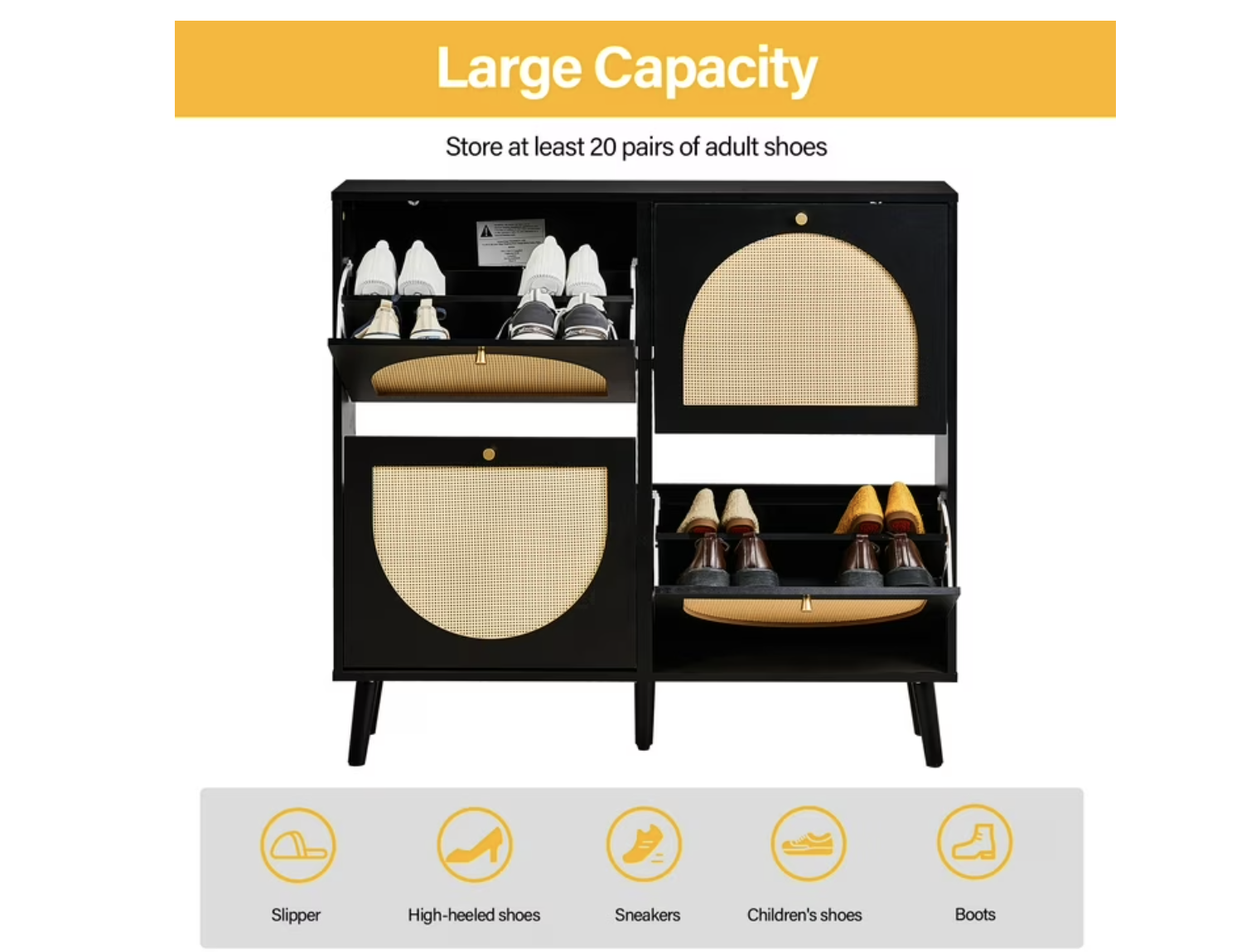 Brand new in box, unassembled, Rattan Shoe Cabinet 2 Rows 4 Drawers, Holds 24 Pairs, Adjustable Shelves .. Dimensions: W41.4 x D9.5 x H38.6 in This shoe cabinet is made of density board with triamine material. Its appearance presents a warm and pleasant original wood color, exuding a natural and simple atmosphere. The unique 2-row 4-tip design not only greatly increases the storage capacity of shoes, but each tip can be used independently, which is convenient for you to classify and place shoes of different styles and seasons. The matching high-leg design creates a light and elegant feeling visually, while avoiding the cabinet body from directly contacting the ground, effectively reducing the intrusion of moisture and dust. The integration of the round rattan surface adds a unique charm to the shoe cabinet. The exquisite rattan weaving craftsmanship shows a delicate texture, which is both beautiful and ensures good ventilation. The overall shape is simple and stylish, which is very suitable for placement at the entrance, porch and other locations, adding a touch of warmth and cleanliness to your home space. Features: