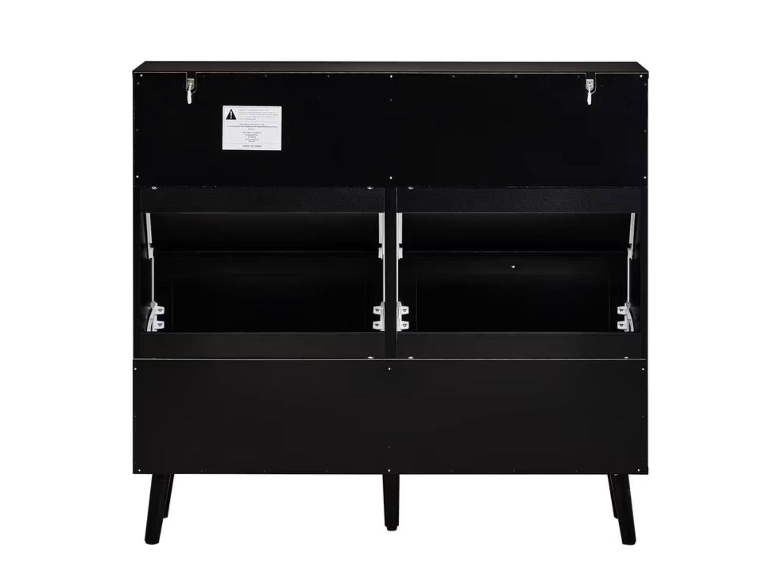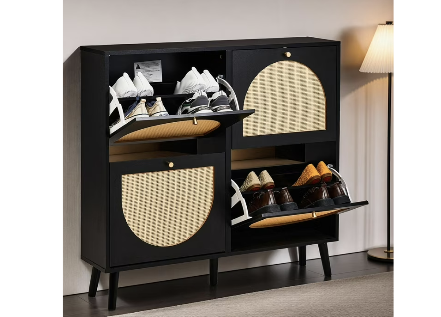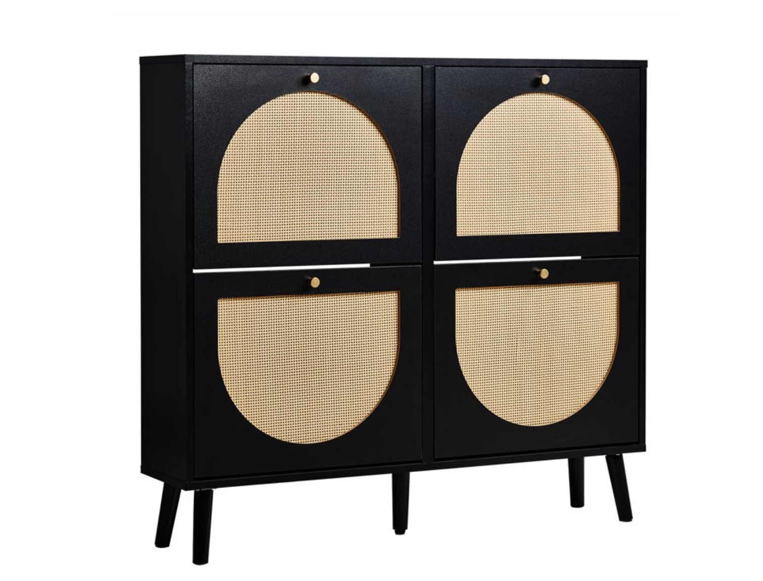 Brand new in box, unassembled, Rattan Shoe Cabinet 2 Rows 4 Drawers, Holds 24 Pairs, Adjustable Shelves .. Dimensions: W41.4 x D9.5 x H38.6 in This shoe cabinet is made of density board with triamine material. Its appearance presents a warm and pleasant original wood color, exuding a natural and simple atmosphere. The unique 2-row 4-tip design not only greatly increases the storage capacity of shoes, but each tip can be used independently, which is convenient for you to classify and place shoes of different styles and seasons. The matching high-leg design creates a light and elegant feeling visually, while avoiding the cabinet body from directly contacting the ground, effectively reducing the intrusion of moisture and dust. The integration of the round rattan surface adds a unique charm to the shoe cabinet. The exquisite rattan weaving craftsmanship shows a delicate texture, which is both beautiful and ensures good ventilation. The overall shape is simple and stylish, which is very suitable for placement at the entrance, porch and other locations, adding a touch of warmth and cleanliness to your home space. Features: