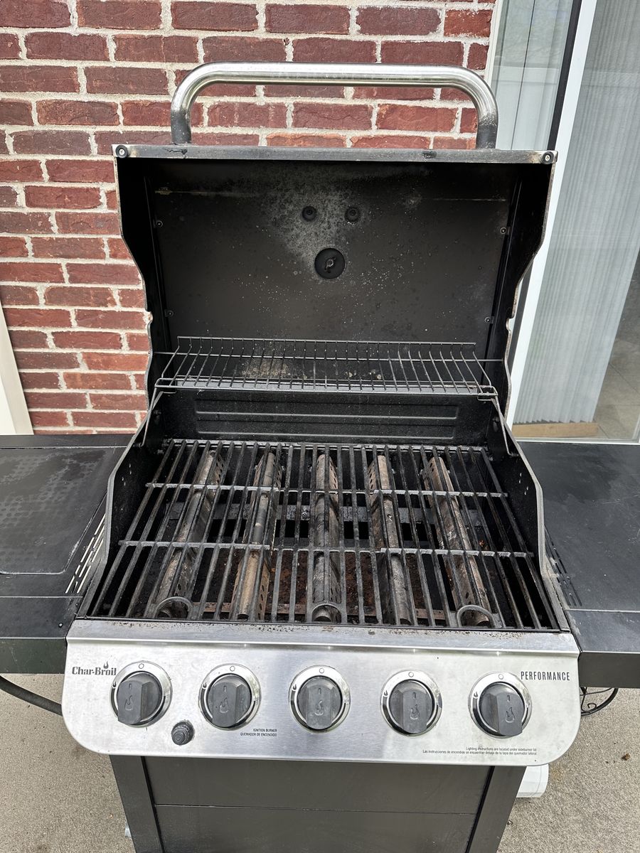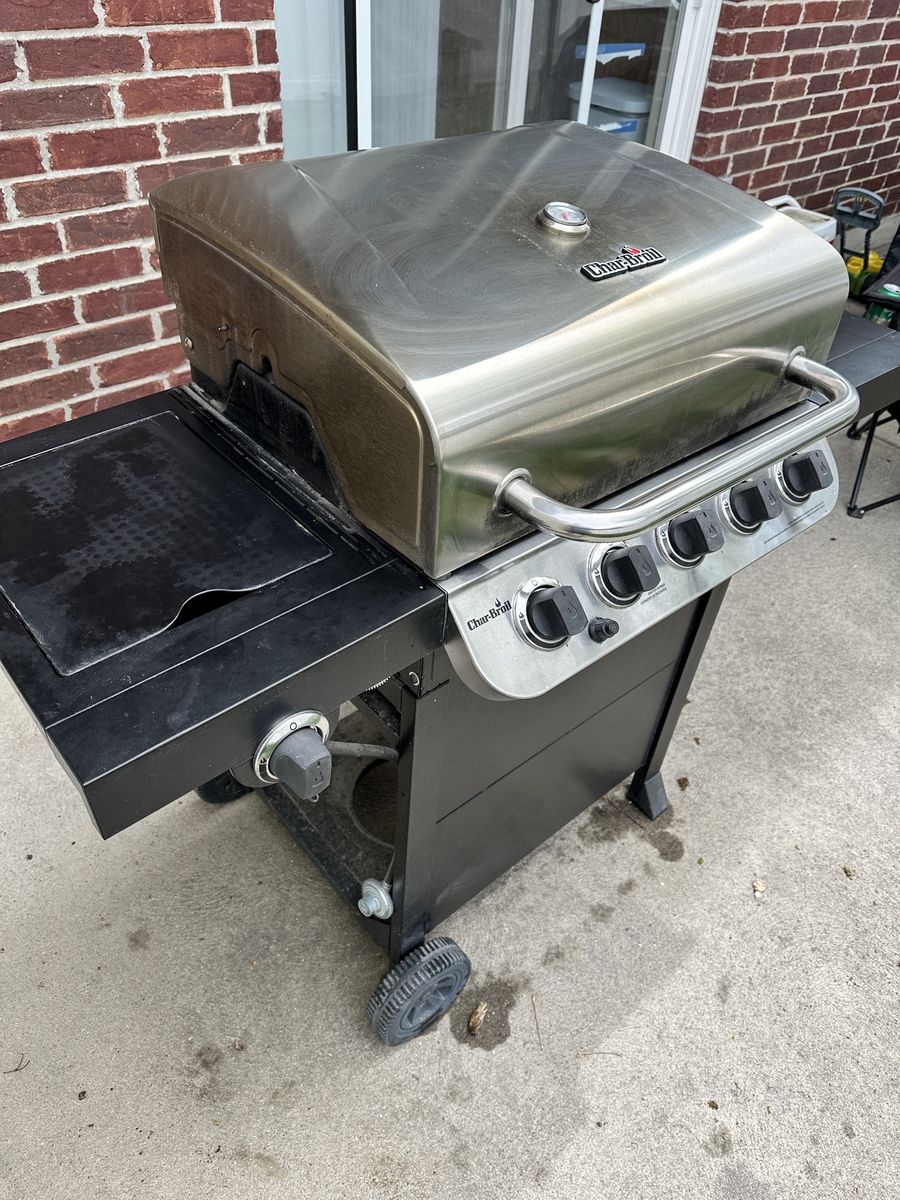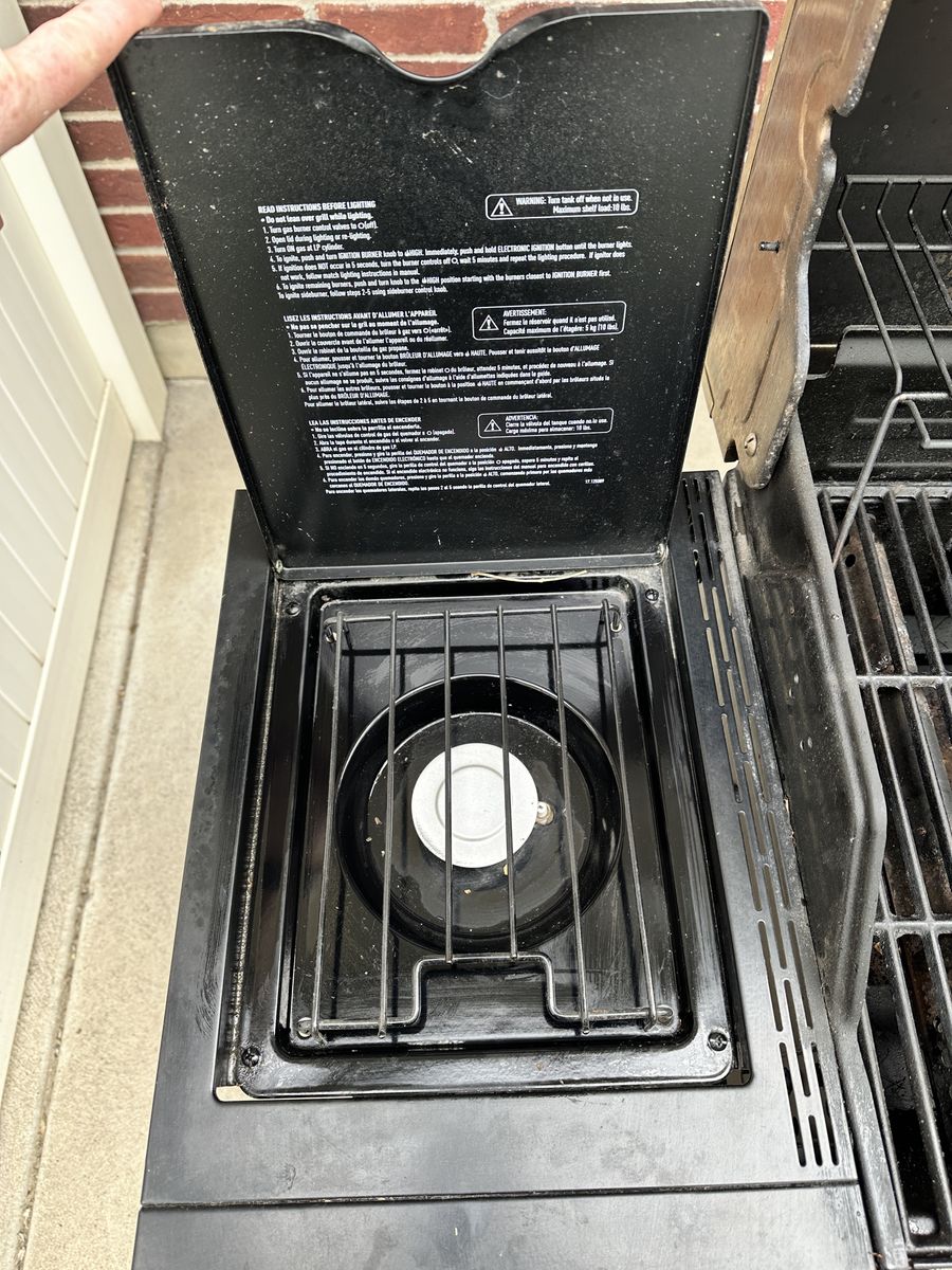 ApplePay5 Bruner grill with side burner as well. Had 2 wheels for easy rolling and works well. Has been used quite a bit and could use a cleaning hand on trap. Otherwise is good condition! Last used summer of 2025