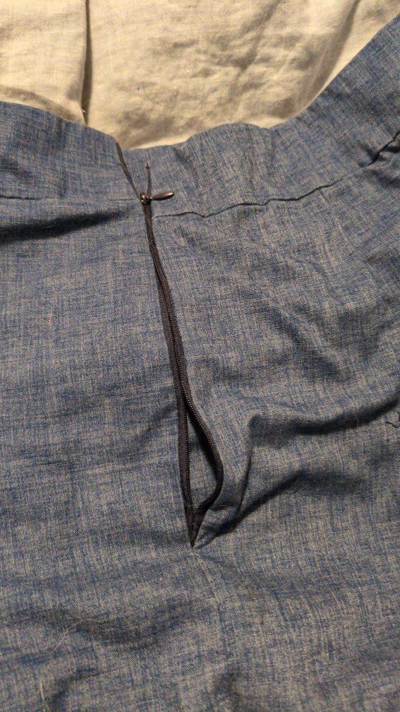 Cute pleated denim look ( lighter weight cotton probably) skirt that I made but didn't have much luck putting in the blind zipper. no point in fixing it because now it won't fit me anyways. The skirt is probably about a size 10/12. If you can replace the zipper you've got yourself a cute skirt.