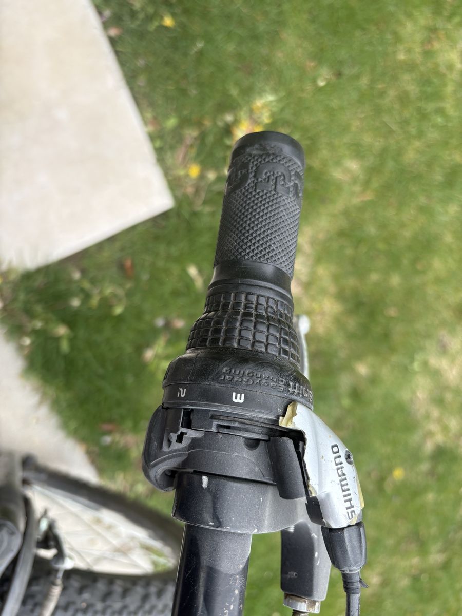 Plastic cover for front handlebar shifter is missing but it still shifts fine.