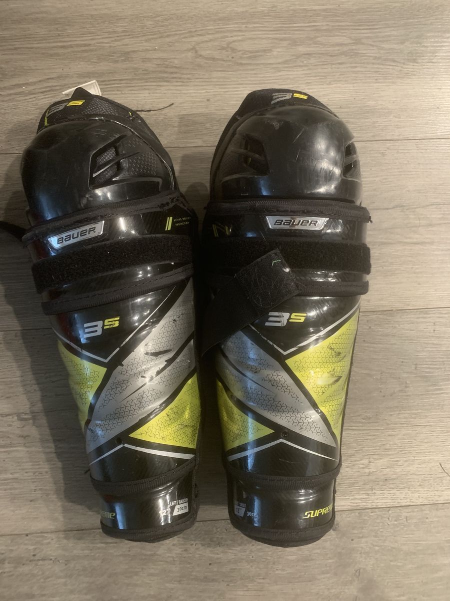 bauer hockey shin pads size 12 30cm 50$ he used them for 3years. Velcro is still good. No cracks or chips padding is good no rips. Always used hockey socks. Good condition.
