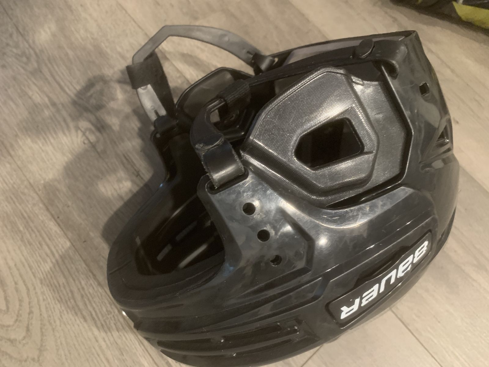 VenmoHockey helmet bauer no gaurd size med. 40$ he used it for 2years. It was pinching his ears so I bought a new one same size different brand and moved the gaurd to his new helmet.