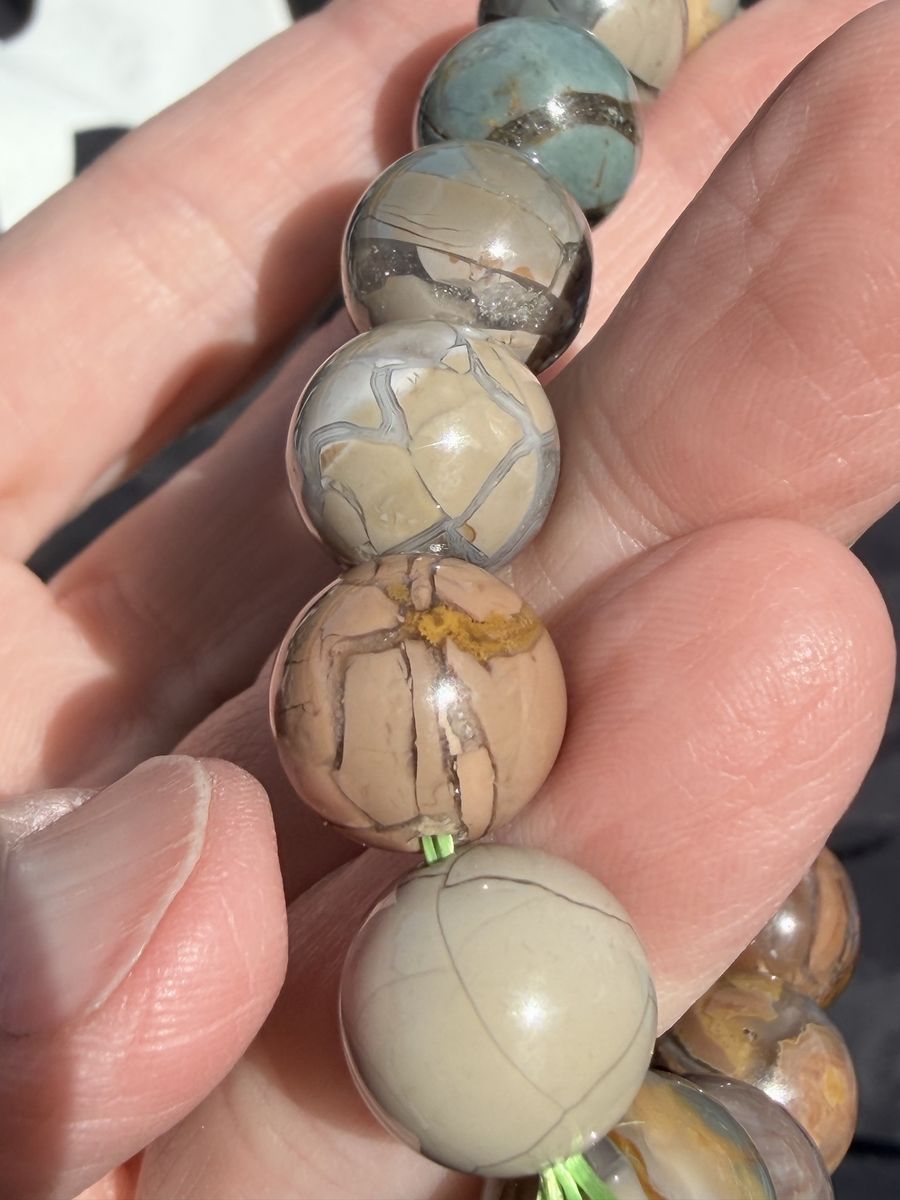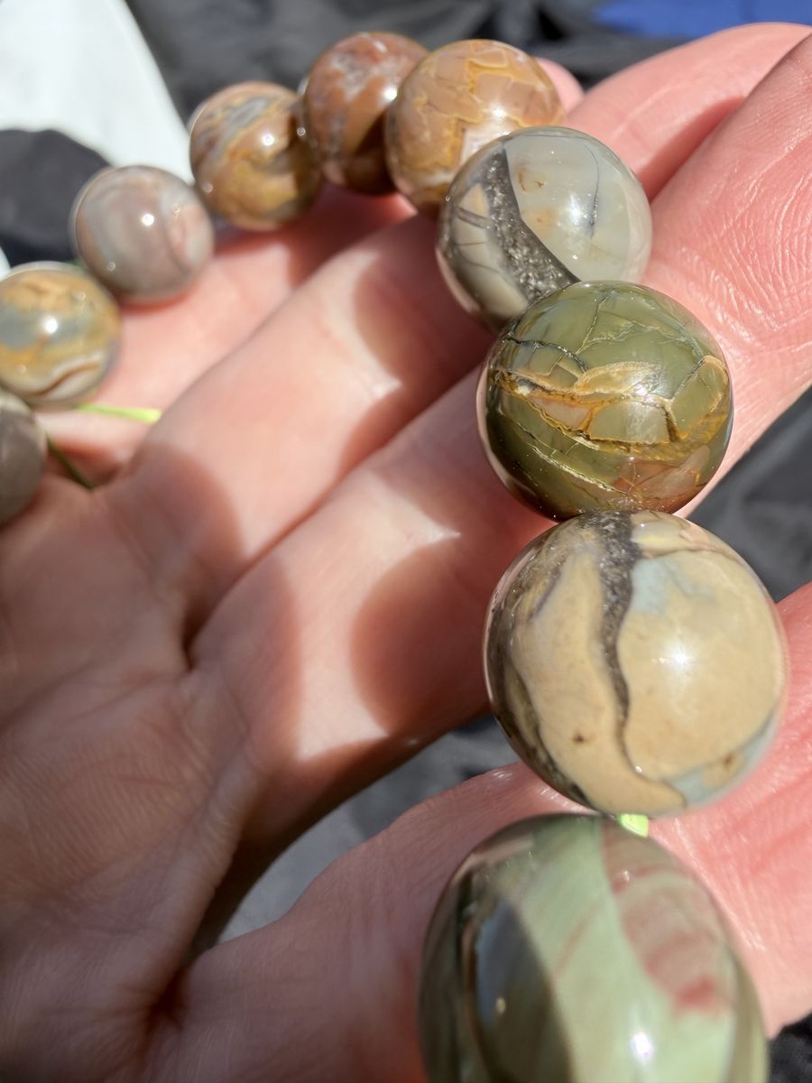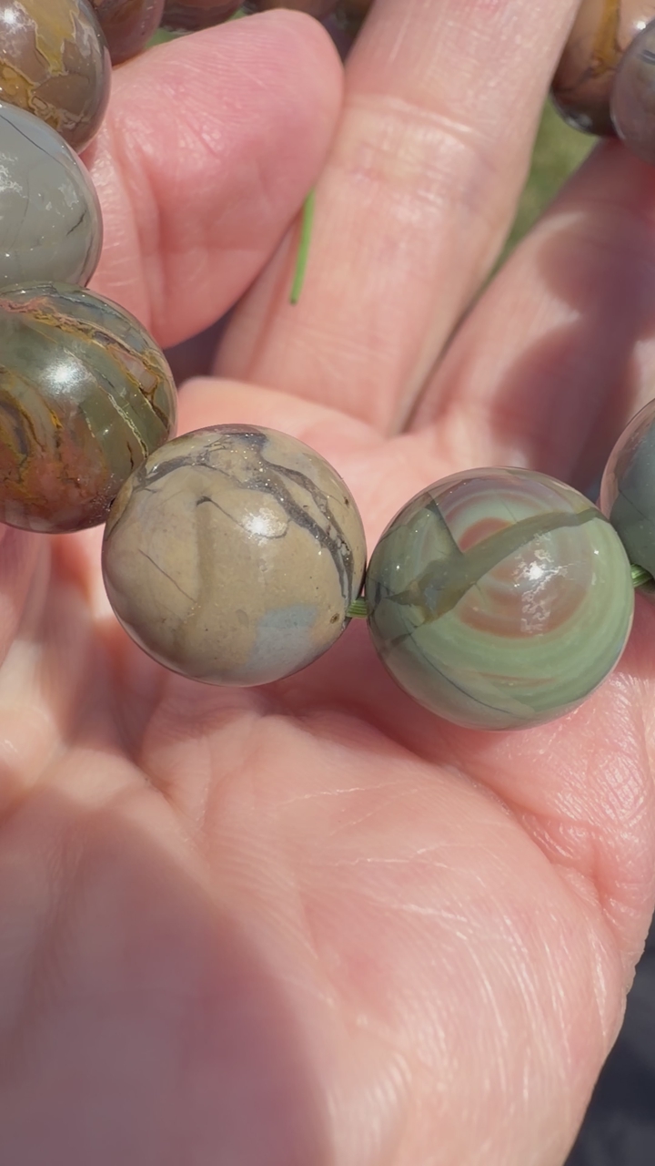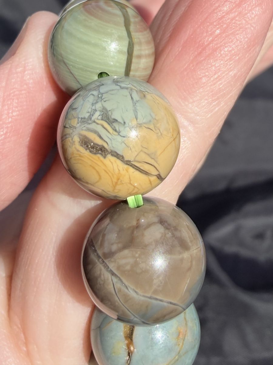 Each bead has its own mix of soft greens, warm browns, and those signature Picasso-style lines—formed by mineral fractures and sediment movement over time, which is what gives it that abstract, almost painted look.