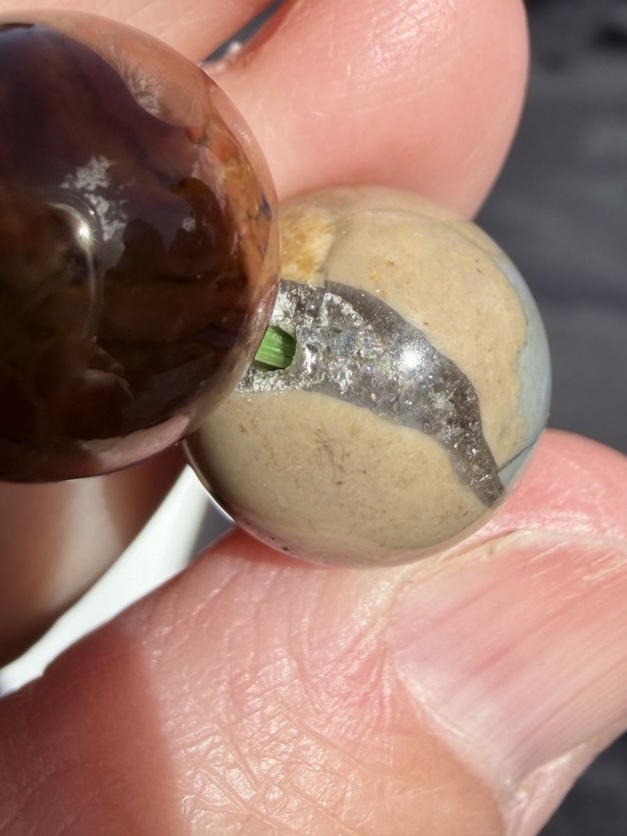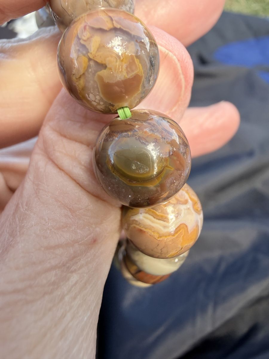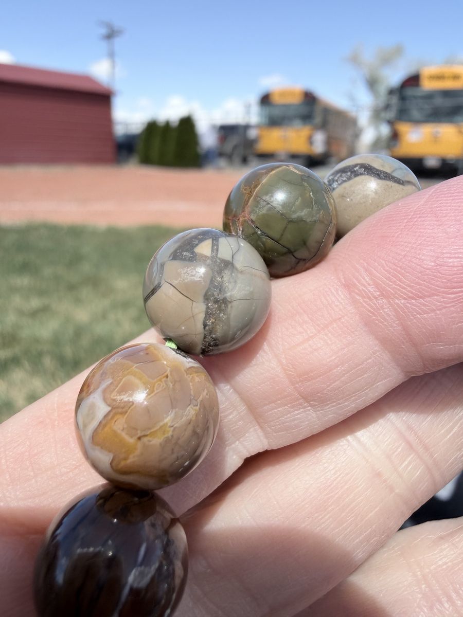 Each bead has its own mix of soft greens, warm browns, and those signature Picasso-style lines—formed by mineral fractures and sediment movement over time, which is what gives it that abstract, almost painted look.