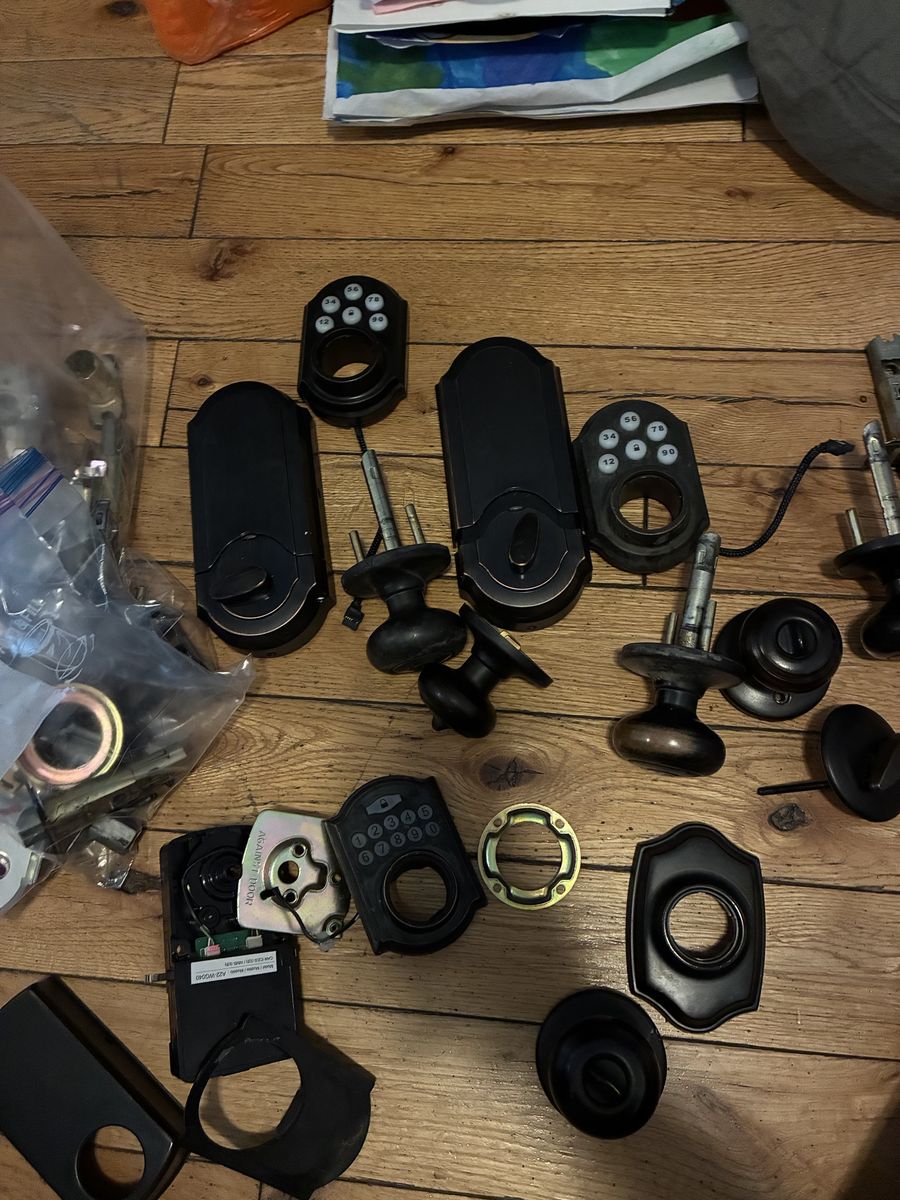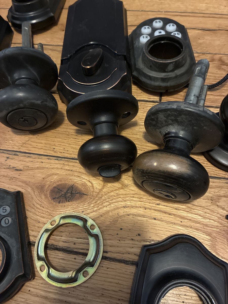 VenmoUsed kwikset oil rubbed bronze electronic deadbolts and door knobs. They all work fine, just changed out for different look. Two sets were used on exterior doors and are more worn. $40 takes all